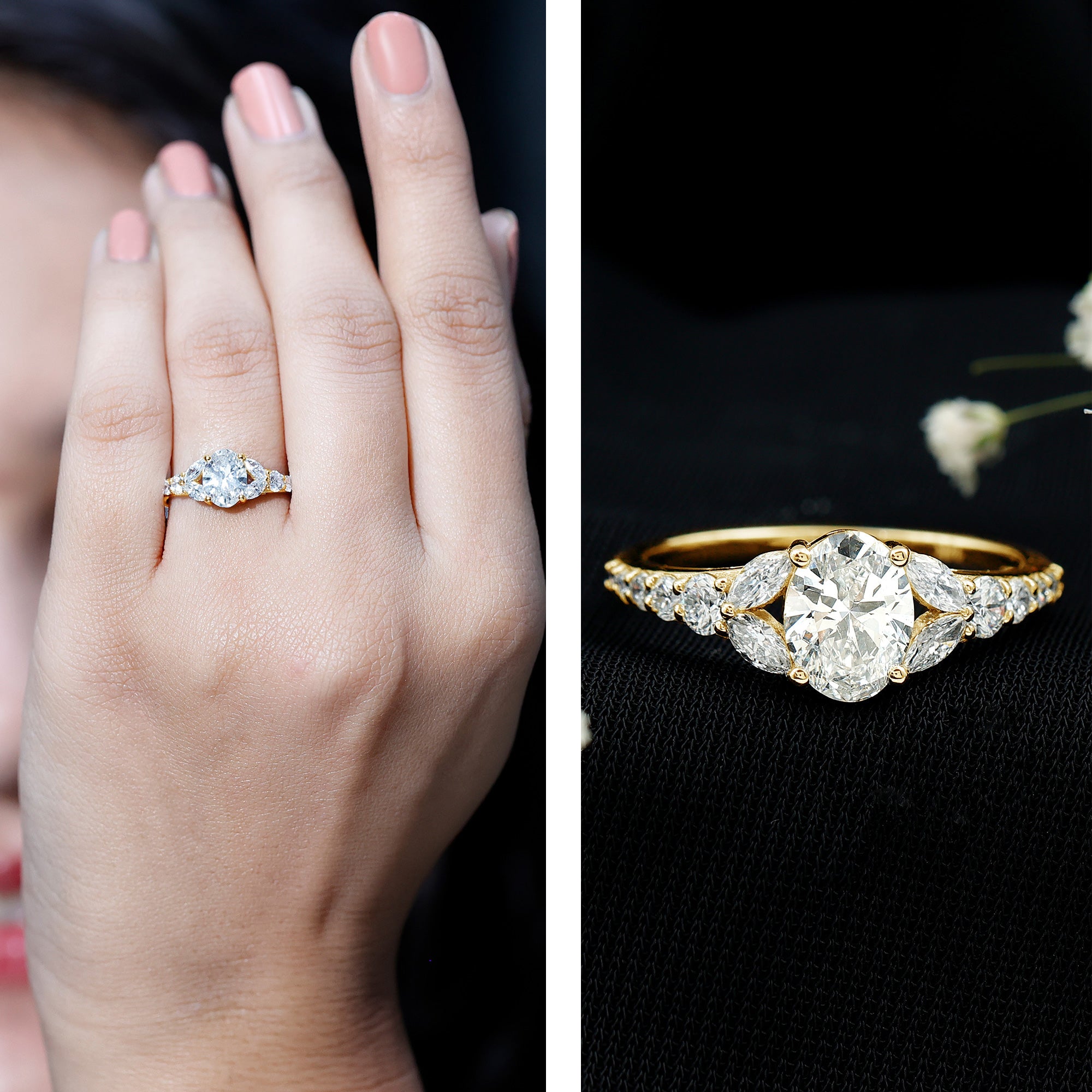Celebrate every moment of your love story with this classic Diamond Ring. This Designer Engagement Ring is more than just a piece of jewelry, its a reflection of your unconditional love. Features 6X8MM oval cut lab made diamonds (EF-VS Quality), set in a secure prong setting with marquise shaped diamonds on both sides of the center stone. The graduated side stones are placed over the band and provide sparkle from every side. Designed with timeless elegance, the Oval Cut Diamond Ring is perfect for celebrating a bond that will last forever. Whether you are starting a new chapter together or looking for a way to express your commitment to your lady love, this Classic Ring will forever remind you of the love you share.