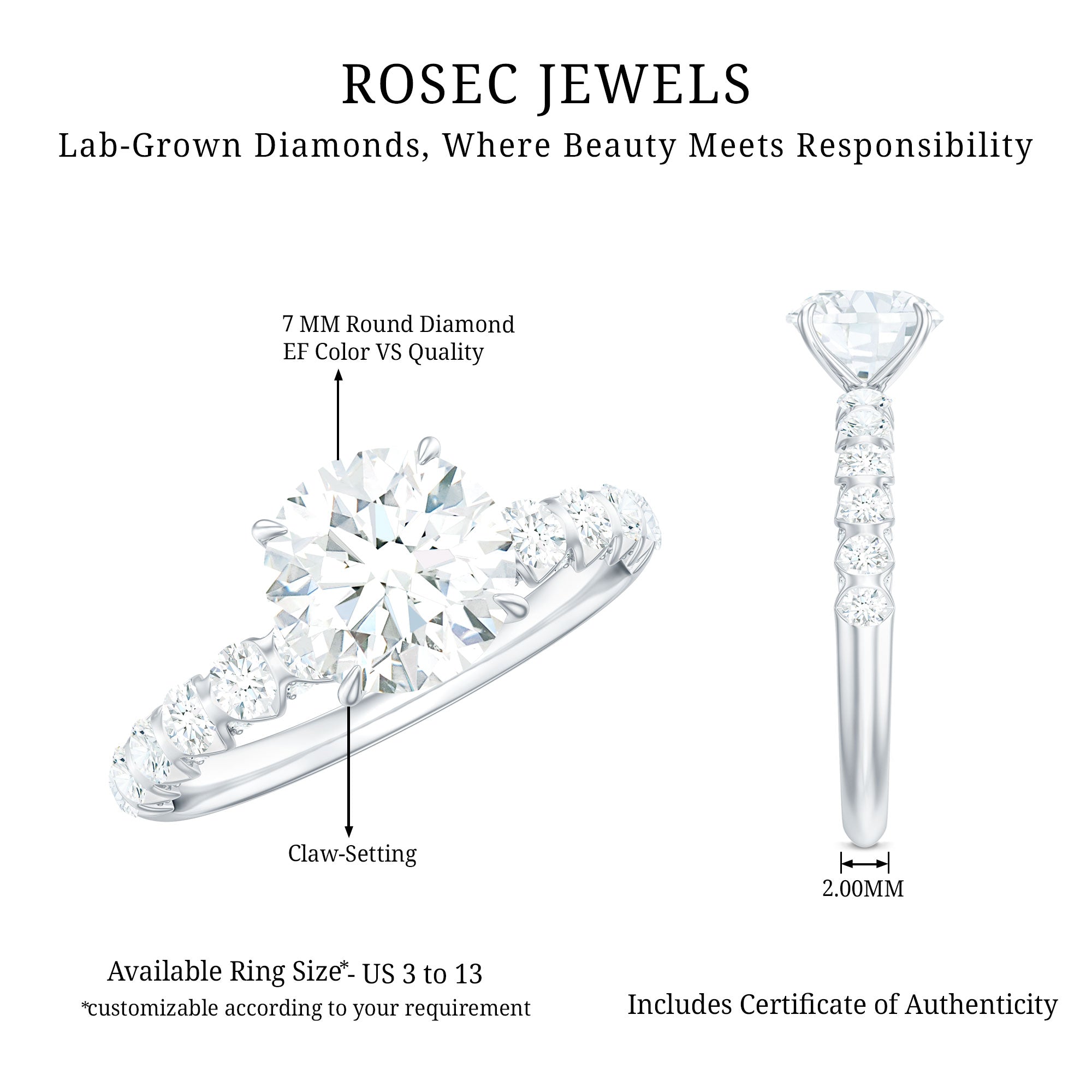This gorgeous Lab Grown Diamond Engagement Ring is bound to wow anyone who lays eyes on it. At its heart, it showcases a 7 MM round cut diamond of EF- VS quality set in claw setting, making it the perfect Solitaire Engagement Ring. The band is embellished with sparkling diamonds, providing a brilliant sparkle from every angle, and it is crafted from high-quality metal for a comfortable fit. Its simple yet elegant design makes it perfect for both everyday wear and special occasions. This 1 Carat Solitaire Diamond Ring is more than just jewelry; it radiates beauty and unconditional love. We have made it with Lab Grown Gemstones, so not only does this Round Engagement Ring look amazing, but it is also eco-friendly. Begin your forever with a piece that is both stunning and kind to the planet. This Engagement Ring with Side Stones is a total showstopper that will make your special day unforgettable, and the gemstone will grab everyones attention, leaving them curious about where you found such a beautiful piece. We package this Single Diamond Ring carefully to ensure it is ready to gift upon arrival.