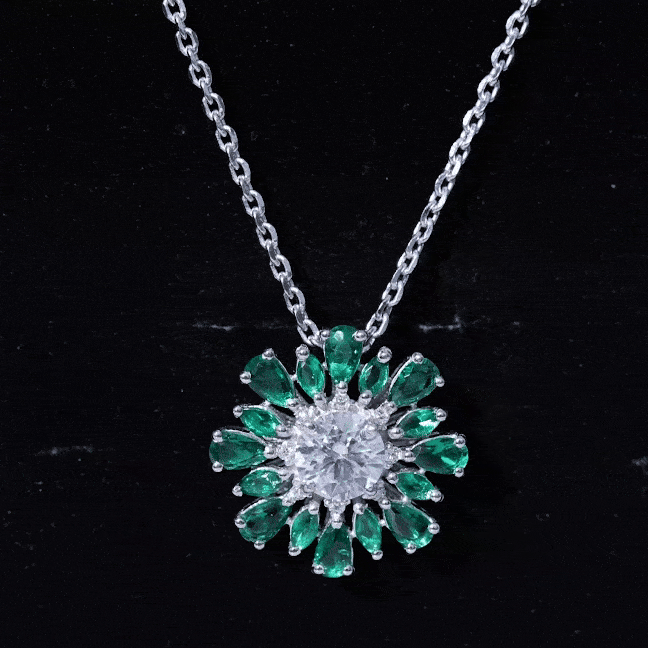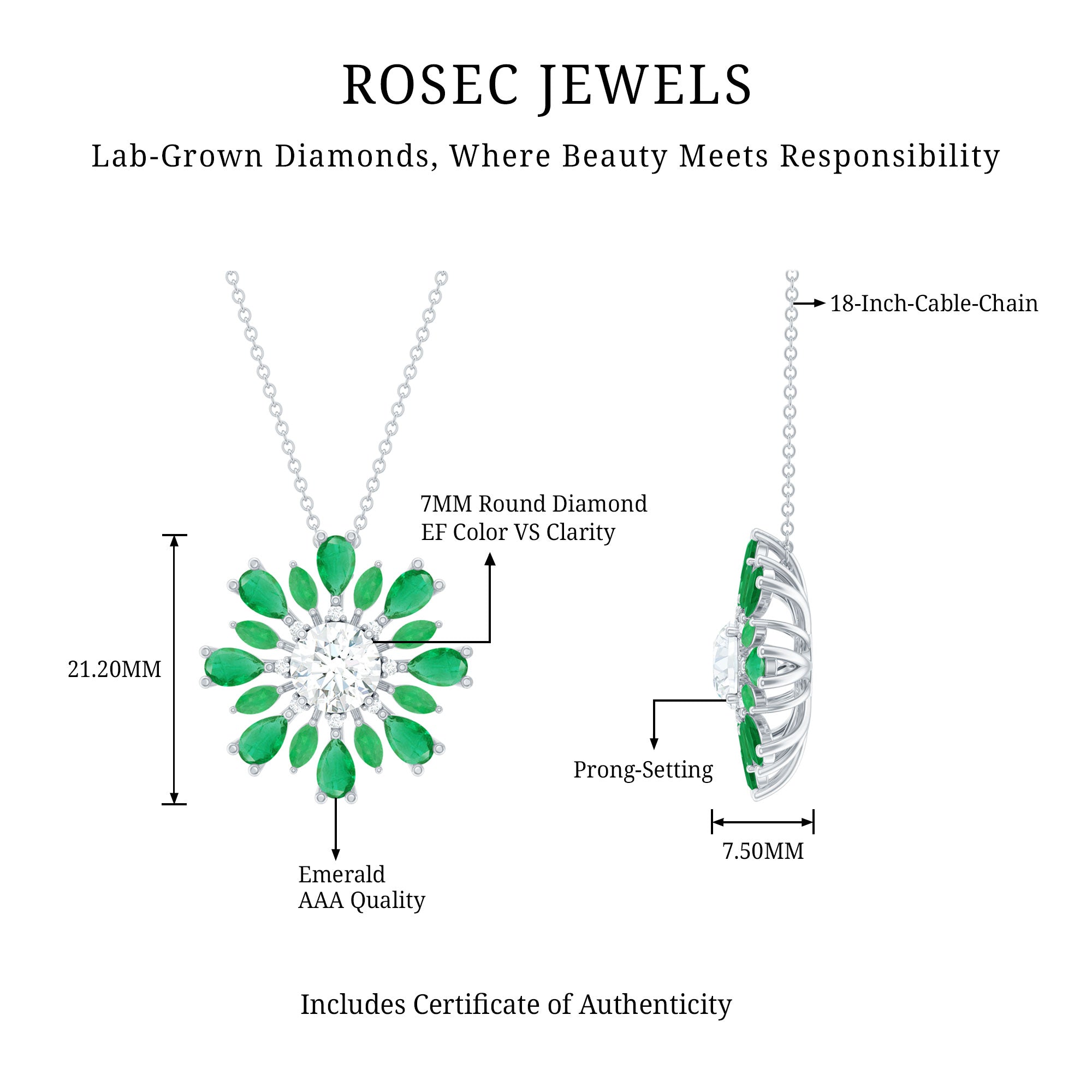 This beautiful Diamond Floral Necklace boasts a mesmerizing design that highlights the natural allure of the emerald stone, guaranteed to draw everyones attention. It features a 7 MM Round Shape diamond set in prongs, along with a unique combination of pear and marquise shape emeralds and delicate diamonds that enhance the charm of this Cocktail Necklace. Its truly the ideal accessory for your upcoming party. This Diamond and Emerald Necklace is available in a variety of metal color options so you can choose whatever suits your unique style and make it a truly personalized piece. As an April birthstone diamonds are known to enhance strength, clarity, and everlasting love. This pendant makes for an ideal gift for those born in April, symbolizing their inner radiance and refined grace.