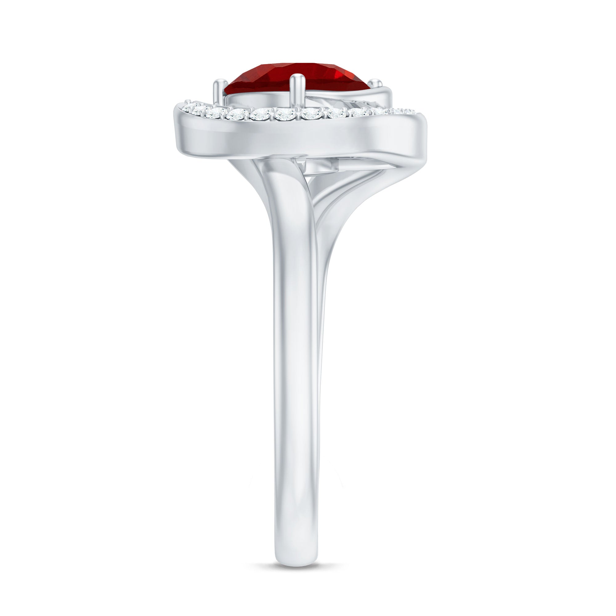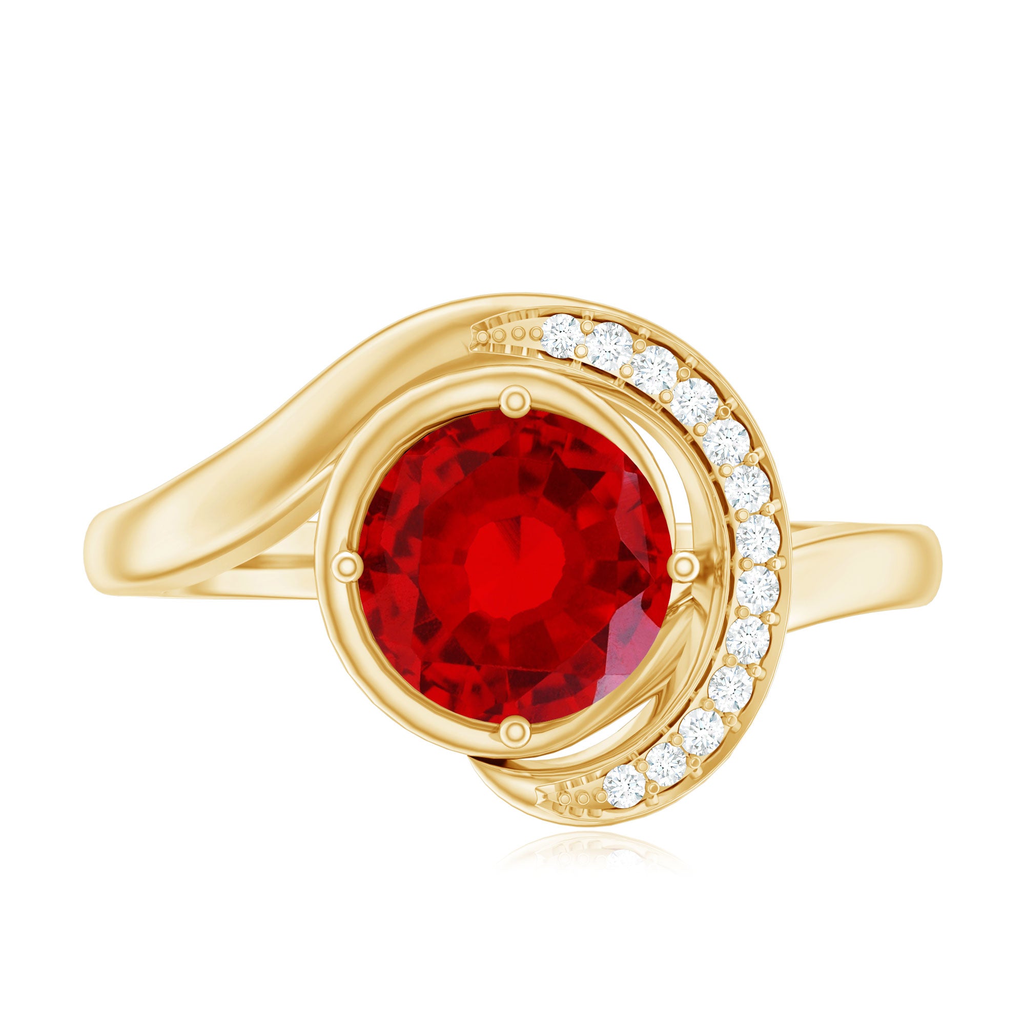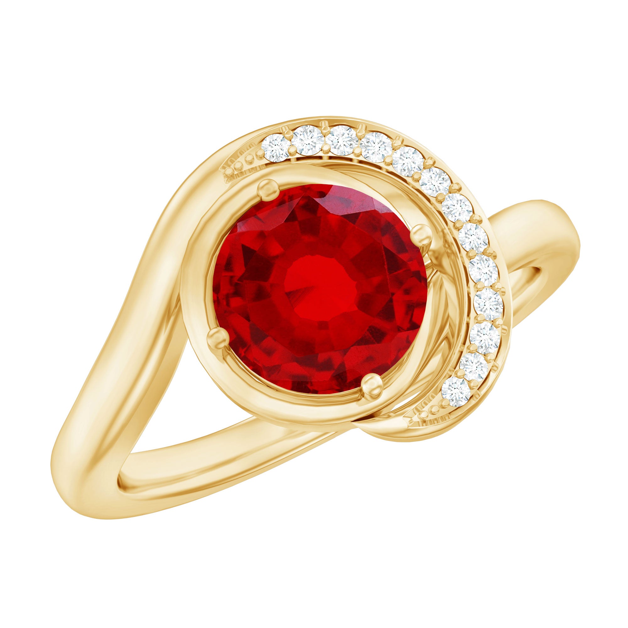 Designed to be different, this elegant Ruby Engagement Ring brings a modern twist to a timeless symbol of love. Its unique bypass-style band gives it a graceful flow, making it a beautiful choice for those who appreciate simple yet striking designs. The smooth curves of the shank gently wrap around a 7 MM round lab created ruby, held by prong setting. The half halo of round cut lab-grown diamonds is carefully set to follow the shape of the main gem, adding just the right amount of detail. This Ruby and Diamond Engagement Ring is crafted with care using lab created stones. It offers not only beauty but also peace of mind, as all stones are lab-made, making it an ethical and responsible choice. The bypass style adds a flow to the design, naturally guiding the eye toward the center stone. It feels delicate in the hand while still making a statement, perfect for someone who loves designs that are both meaningful and refined. Designed by Rosec Jewels, this Lab Created Ruby Ring reflects their focus on quality and thoughtful craftsmanship.