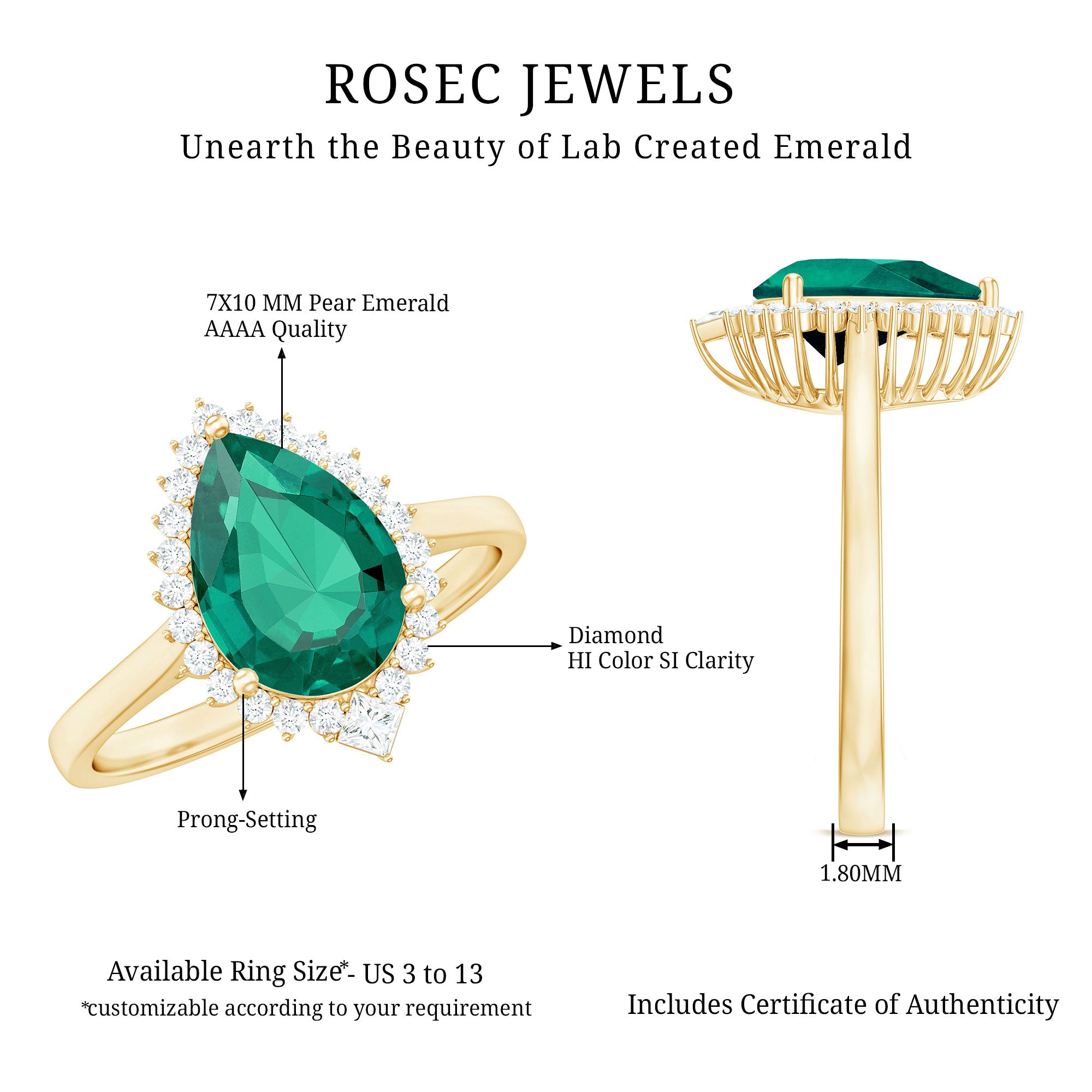 Handcrafted with perfection and attention to detail, this Teardrop Engagement Ring is a moment frozen in time. At the center is a 7X10 mm Pear Shape Lab Created Emerald in Prong Setting, glowing with deep green brilliance and shaped like a delicate teardrop, that symbolizes love, emotion and a future filled with promise. Surrounding the AAAA Quality Lab Emerald is a shimmering Halo of Diamond stones, each one adding a touch of sparkle and grace. But right at the rounded base of the Lab Emerald, a single Princess Cut Diamond is diagonally placed into the halo, that adds a surprising twist of elegance and a bold design. The mix of soft curves and sharp lines creates a beautiful balance, classic yet different. This Lab Emerald Diamond Engagement Ring is a ring made for someone who appreciates beauty with a twist. Whether it is a proposal, an anniversary or a gift for special someone, this Lab Emerald Cocktail Ring is designed to mark the most meaningful moments of life. Arrives in a timeless jewelry box and available in various ring sizes, this Lab Grown Emerald Ring is ready to open hearts.