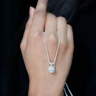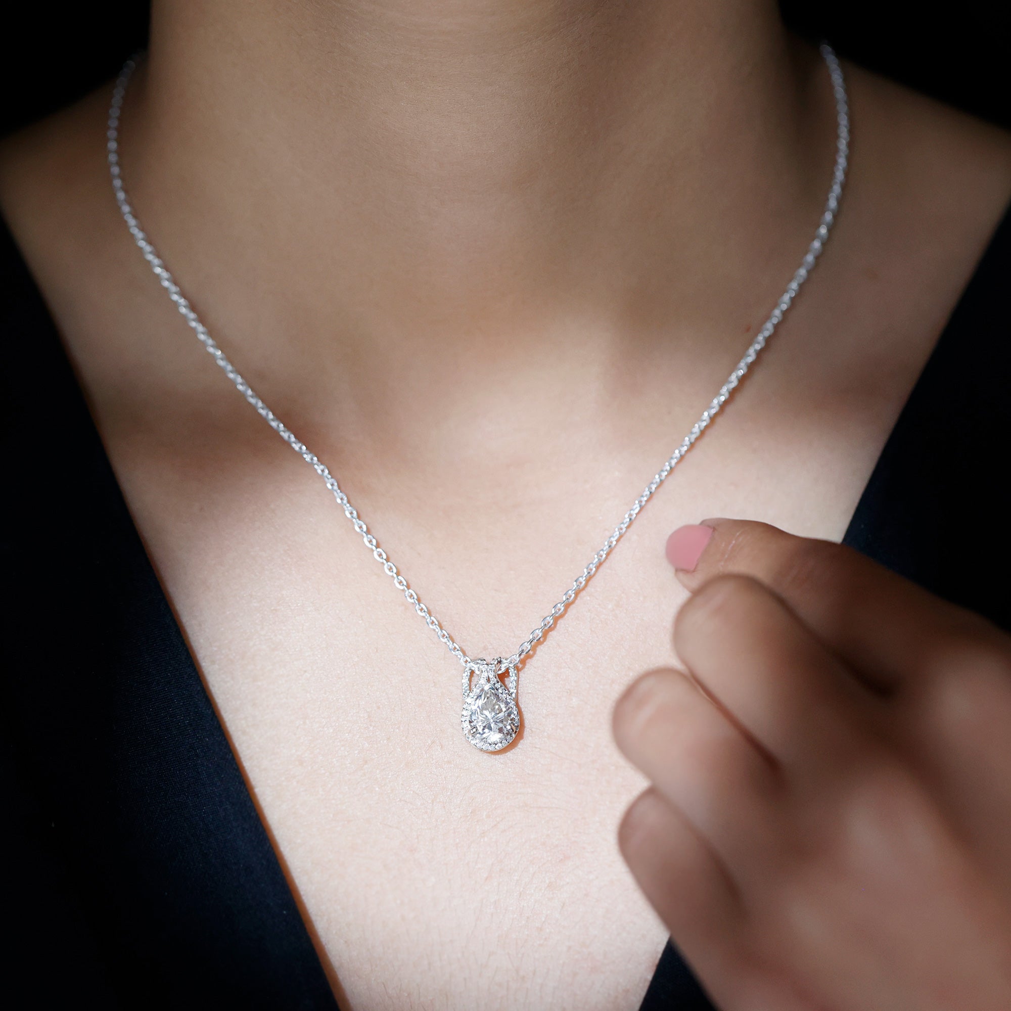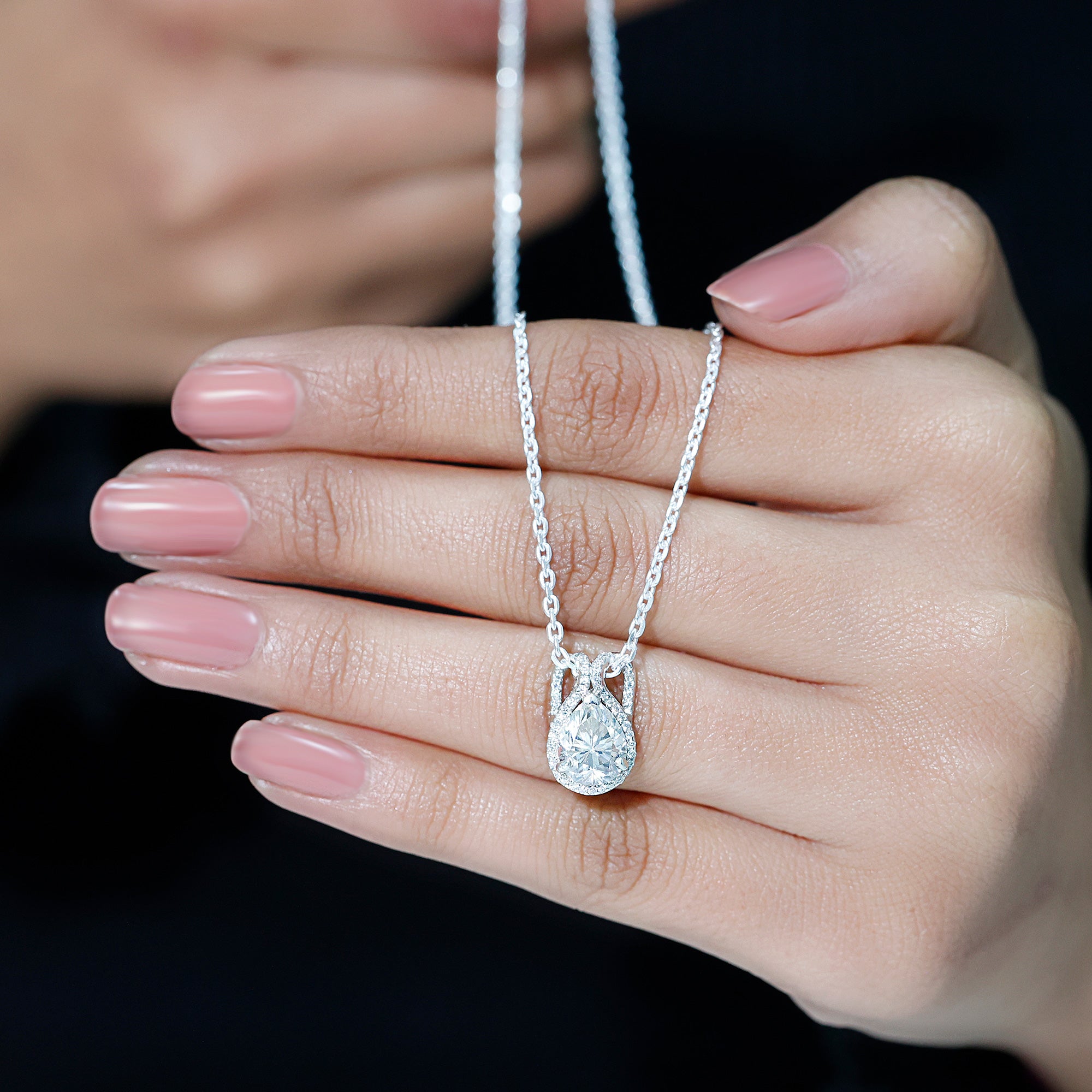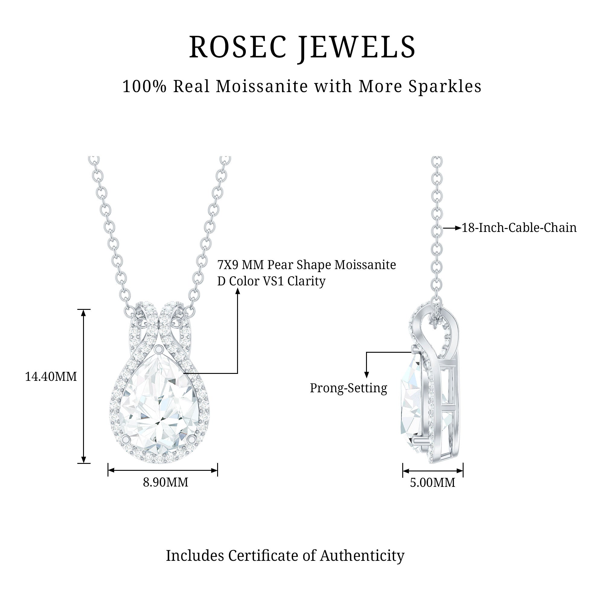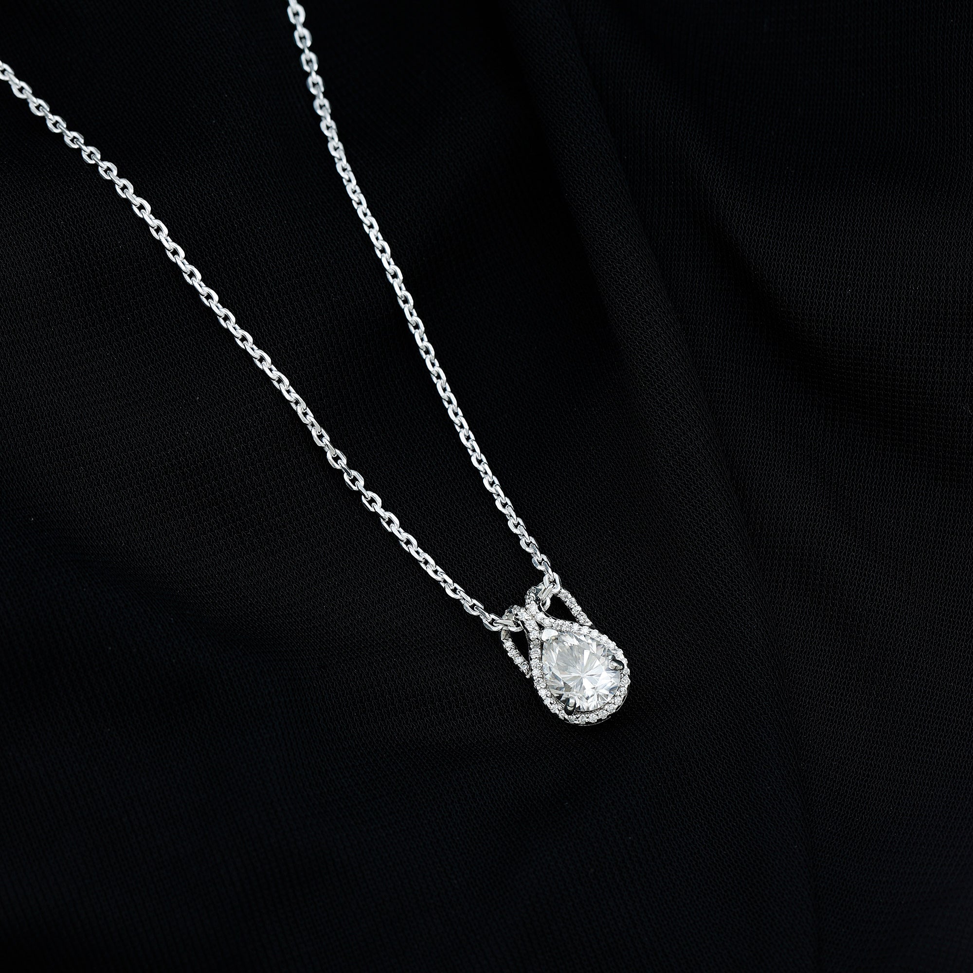 Rosec Jewels drop shaped Pear Moissanite Necklace is sure to set things on fire, from the moment you wear it. This magnificent piece features a 7X9 MM Pear shaped Moissanite totaling a weight of approximately 1.5 Carats. The centerpiece is bordered by sparkling round cut stones, making this Teardrop Necklace truly special. Each Moissanite of D Color VS1 Clarity lights up your look, making this necklace a versatile luxury addition to both extravagant and everyday wardrobes. This Pear Drop Pendant is a memorable accessory that beautifully showcases your style, made with remarkable attention to detail. Curated in 14k white gold plated sterling silver, this Bride Necklace for Wedding hangs from a cable chain with a secure lobster clasp for easy length adjustment. Timeless with a modern touch, this Moissanite Pendant Necklace completes your wedding look with sophistication and grace.