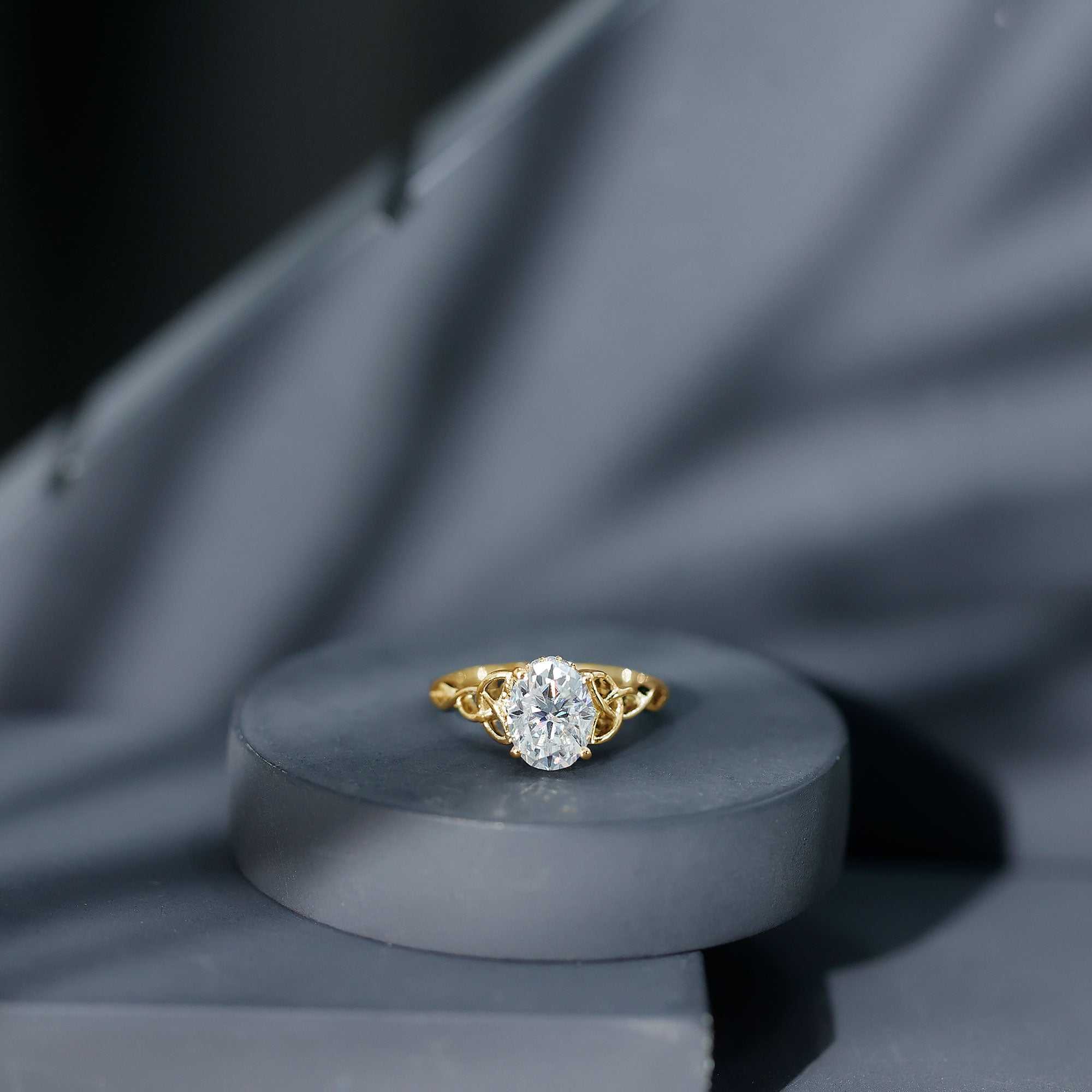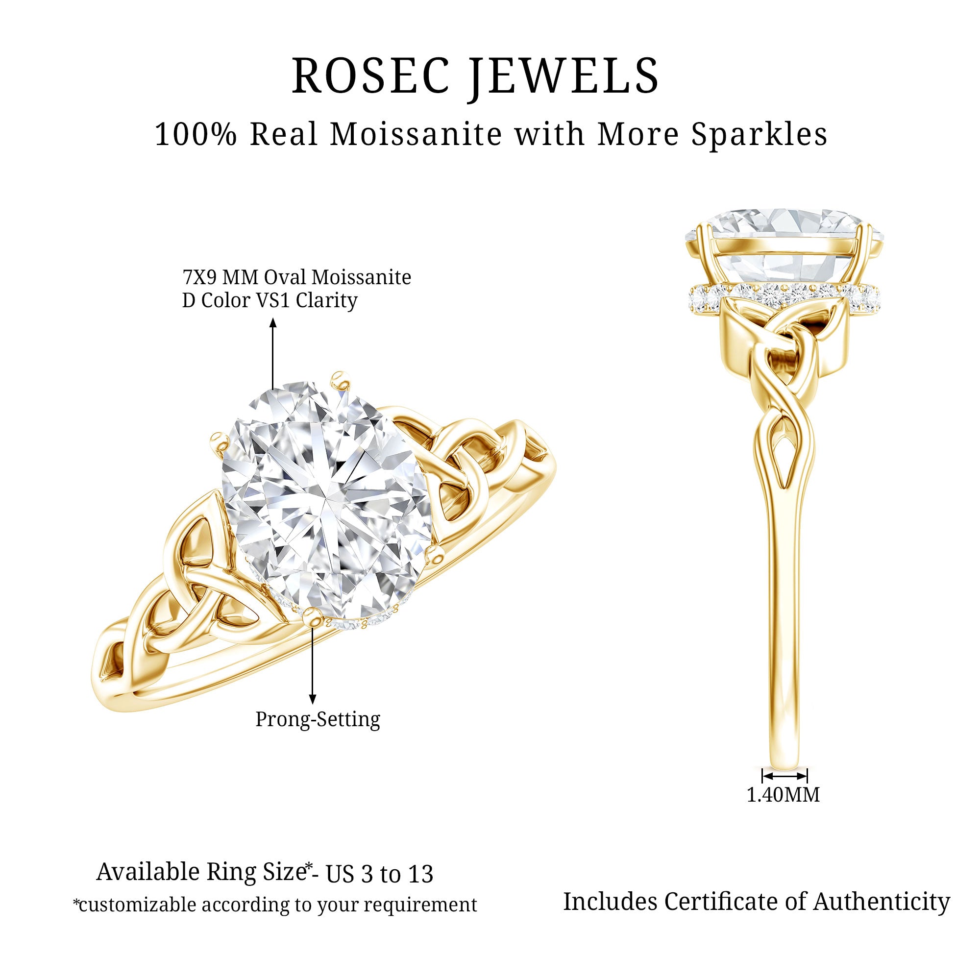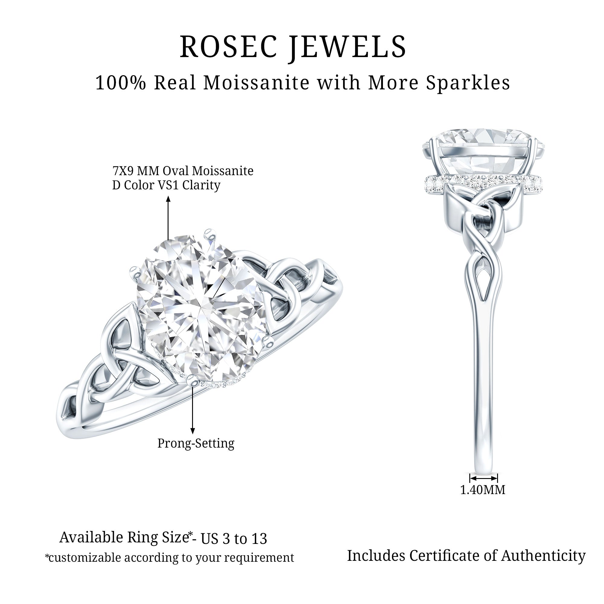 Get her this Moissanite Engagement Ring and make her feel special. The ring is adorned with 7X9 MM Oval Shape Moissanite delicately placed in Prong Setting which offers a luxury touch. The center stone is adorned with the Celtic knot on both the sides and encircled by a hidden halo which depicts deep and enduring love. This Celtic Knot Ring beholds the adorable shine of D-VS1 Quality Moissanite that will astonish her and make the moment memorable forever. This Moissanite Solitaire Ring will be delivered to you in the classic jewelry box for storage when not in use.