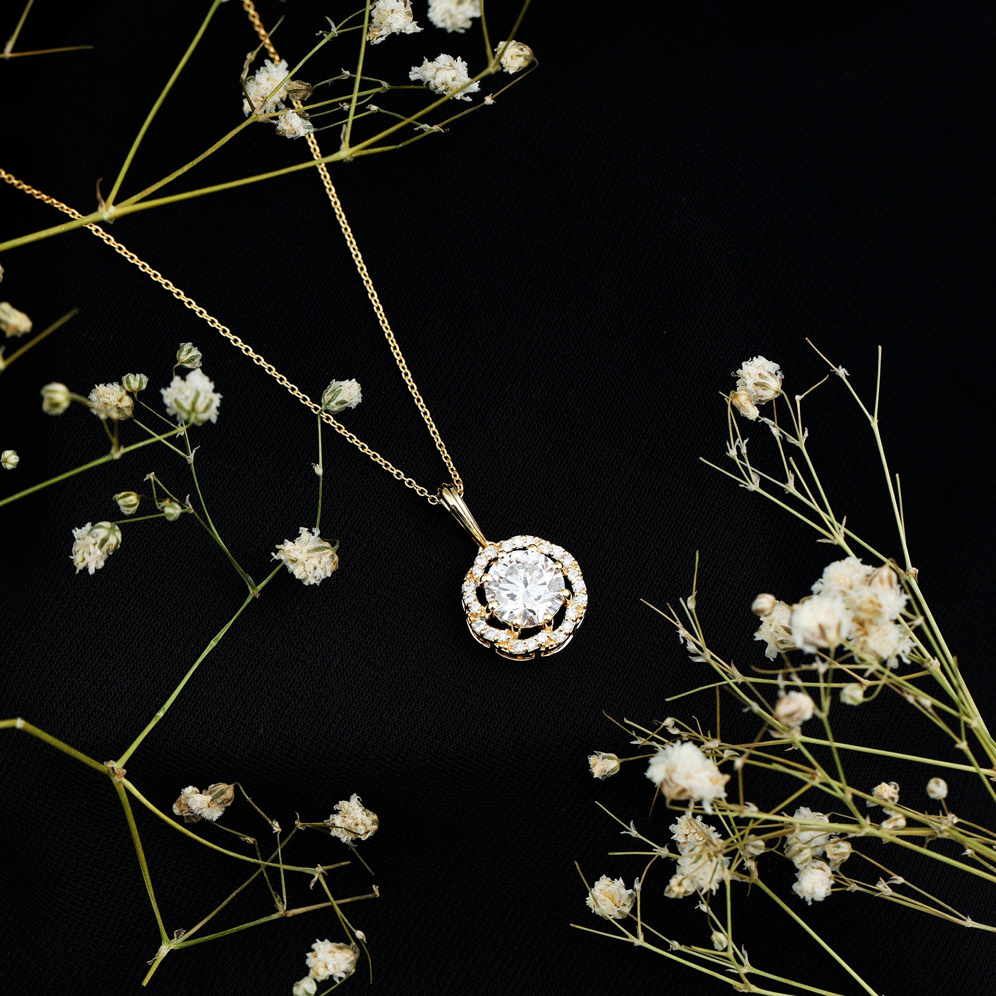 The Cocktail Pendant is embellished with an 8 MM round shaped diamond (EF-VS Quality) which is surrounded by a unique petite gemstone halo and elegantly connected by a textured bail. Crafted with certified lab-grown diamonds, it is available in a variety of metal color options, that allow you to choose your preferred one. This Diamond Halo Pendant combines elegance with brilliance, making it a perfect addition to any jewelry collection. This Round Diamond Pendant is perfect for celebrating any occasion, whether it is for a birthday, anniversary, or a thoughtful gift. This 2 carat Diamond Necklace is a great way to show love and appreciation, present this to someone special, and let it be a lasting symbol of your love.