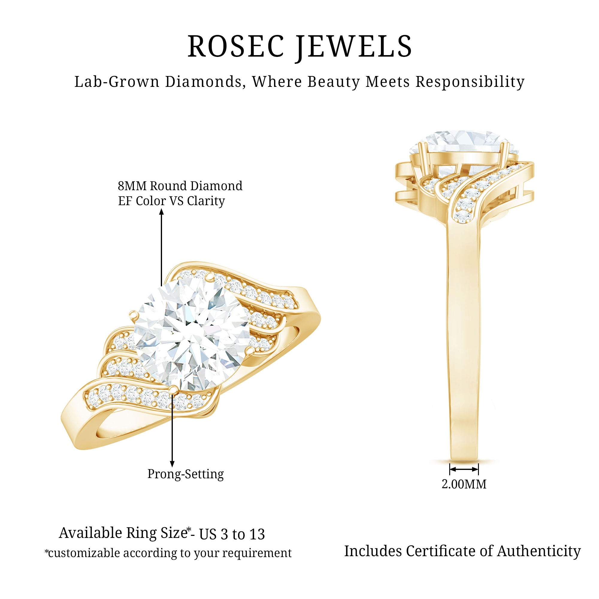 Seal the deal with a Designer Diamond Ring that screams passion, sparkle, and happily ever after. This Solitaire Engagement Ring is designed with lab grown gemstone, an 8 mm round shape diamond is set in the center with multiple curved rows of round diamonds on either side. The prong set focal stone and plain band give this 2 Carat Diamond Engagement Ring a timeless feel while the smaller stones on it add a designer touch. Whether you are proposing, celebrating a milestone, or simply making a grand gesture, this Round Shaped Ring is one shell never forget. No matter what youre attending, a glamorous evening dinner, or a festive celebration, it will ensure you shine with confidence and style.