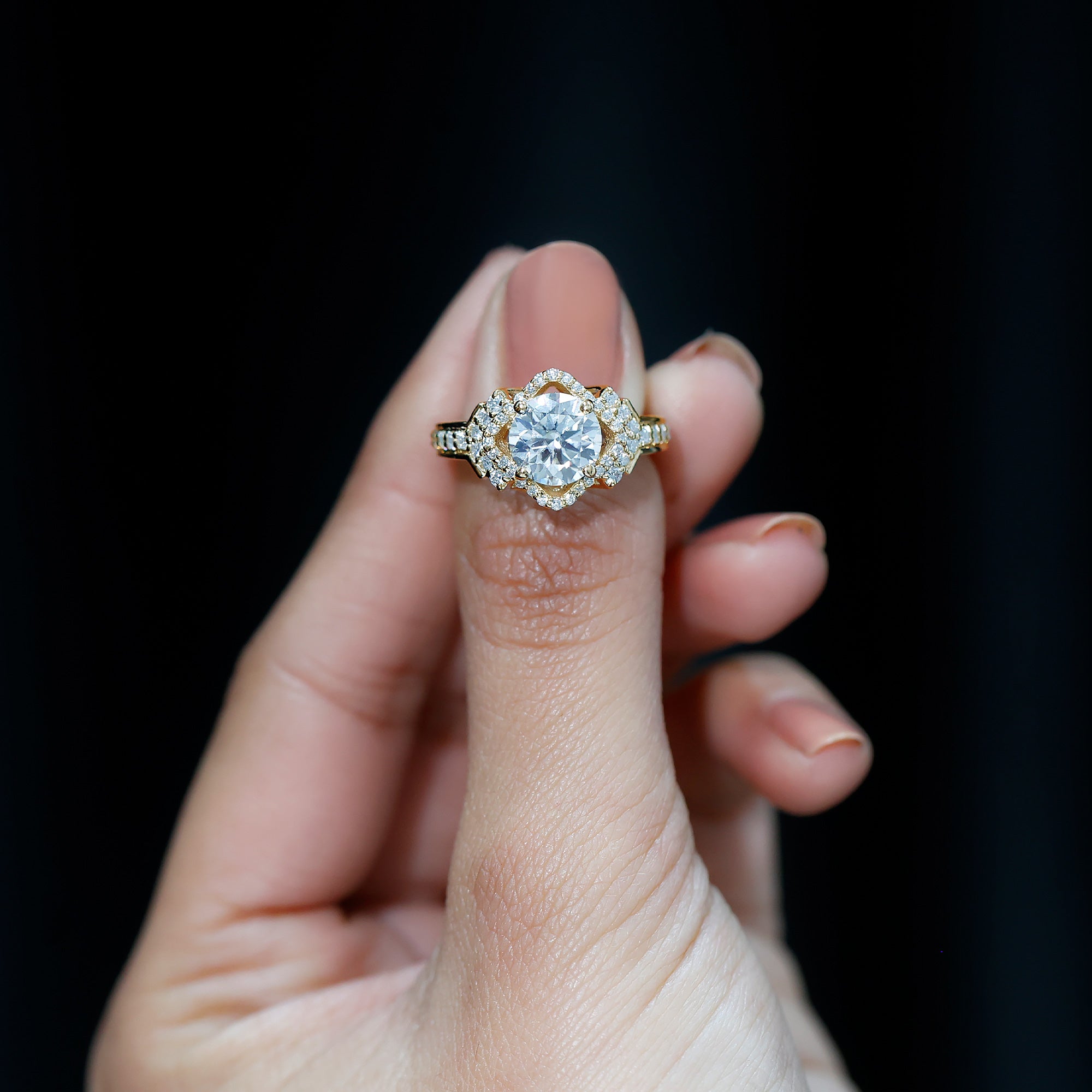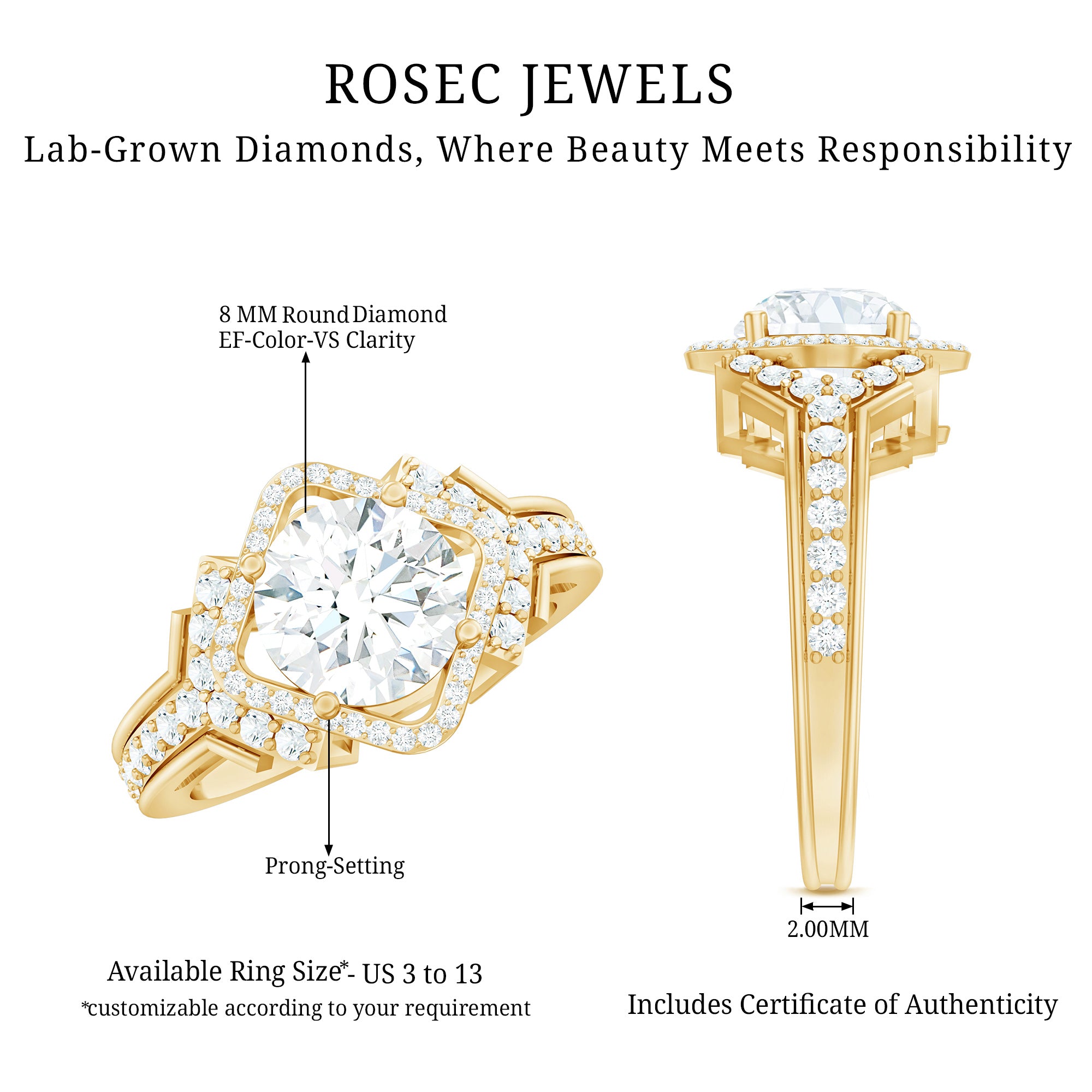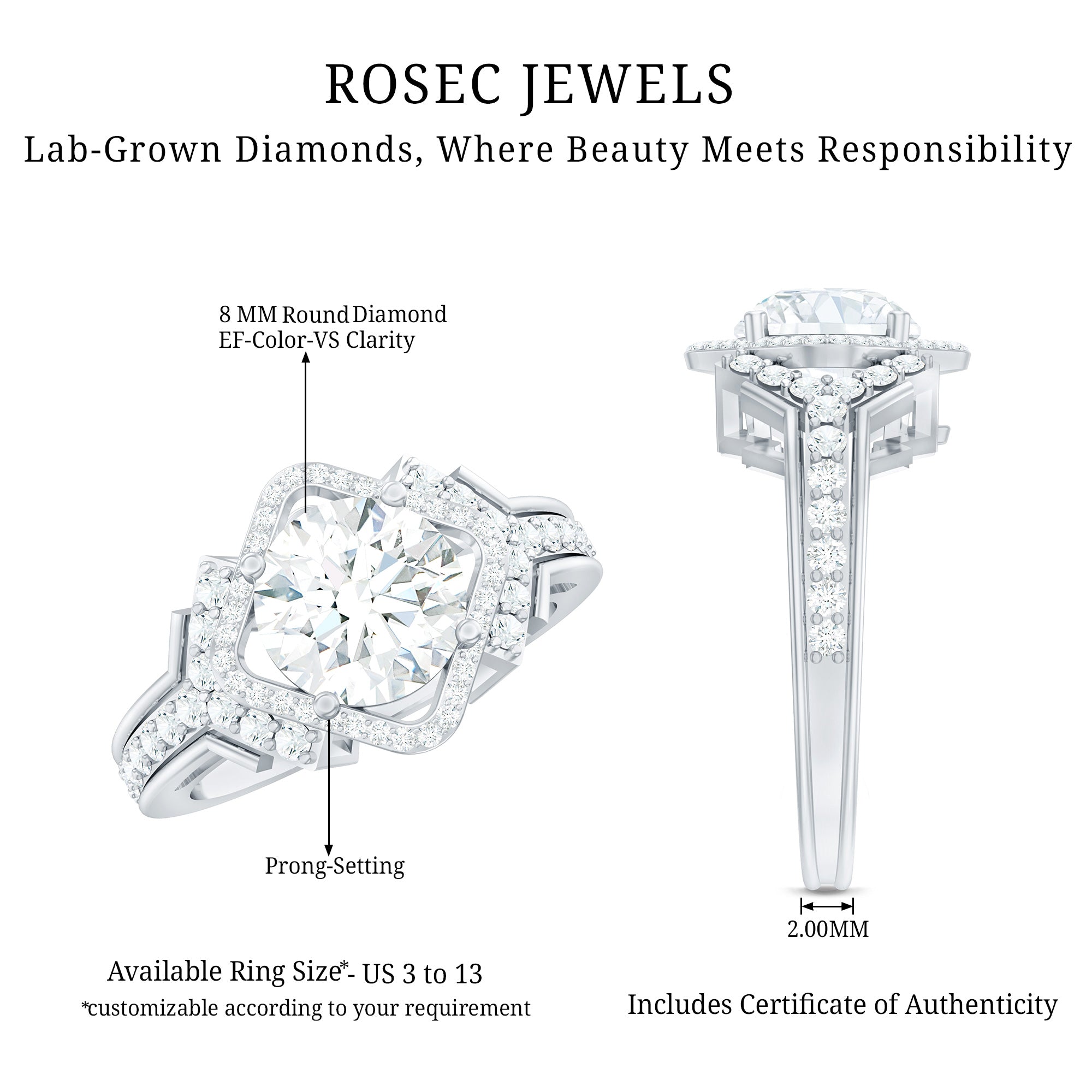 Mark your special day with our Vintage Inspired Engagement Ring, which surely provides you a touch of royalty. This Statement Ring is handcrafted with an 8 MM round shaped synthetic diamond of EF-VS quality set in safe and secured prong setting. The smaller round cut diamonds surround the center stone and grace the classic shank with their sparkle. Handcrafted with lab grown diamonds, it is not only stunning but also an ideal choice for those who believe in love that shines with both beauty and responsibility. This 2 carat Diamond Engagement Ring arrives in a Signature Jewelry Box to keep it secure and make it more presentable.