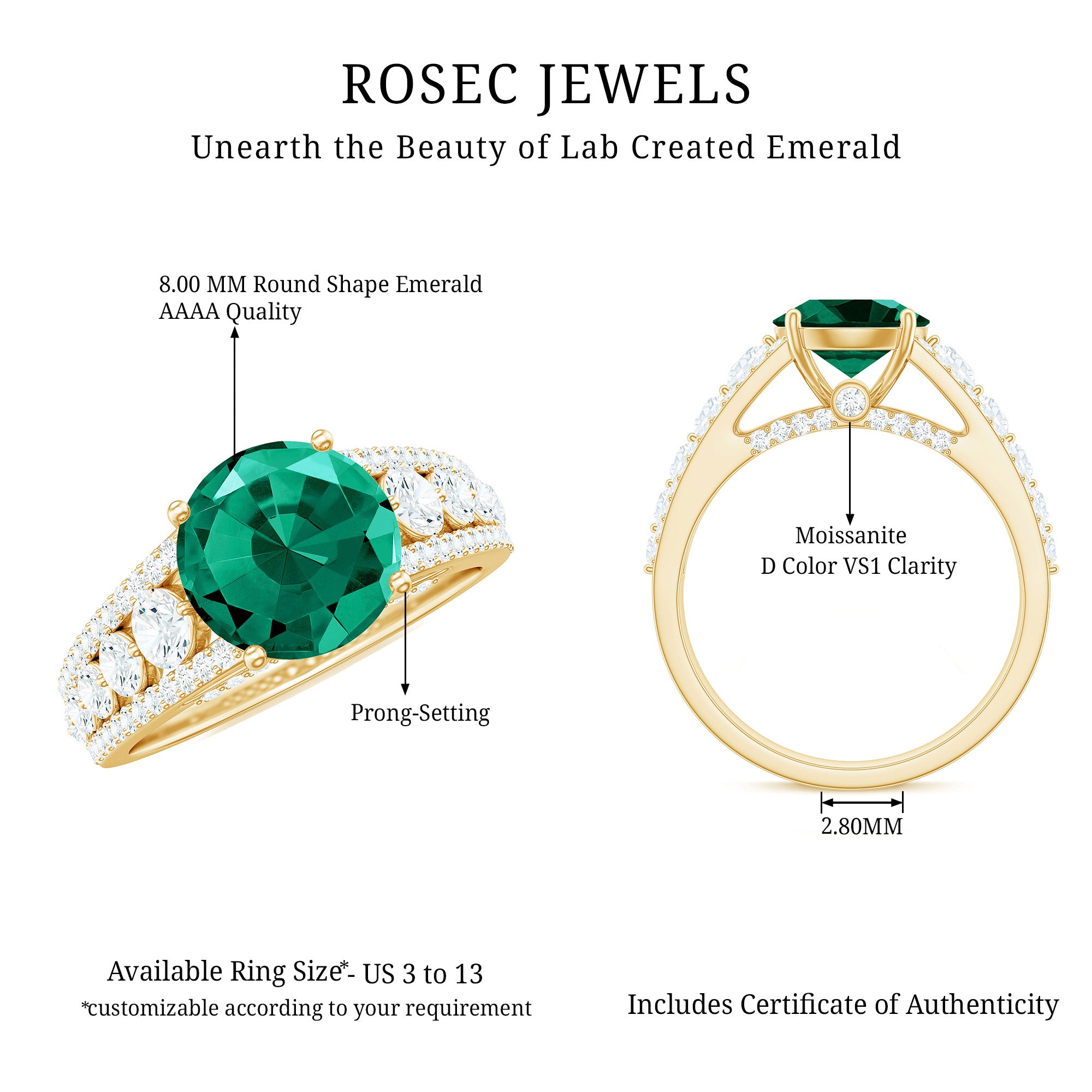 Step into the spotlight with this stunning Solitaire Engagement Ring designed to make a statement. The vibrant 8 mm Lab Created Emerald at the center glows with rich green color, symbolizing love, growth and new beginnings. It is big enough to catch every eye but elegant enough to wear every day. Flanking the center stone are dazzling Moissanite side stones, adding extra sparkle and fire that beautifully complement the deep hue of the Lab Emerald. Together, they create a look that is bold, modern and totally unforgettable. Crafted for those who love to stand out, this Lab Grown Emerald Ring combines eco-friendly lab grown stones with expert design, making it a choice that is as conscious as it is gorgeous. Plus, this Side Stone Engagement Ring comes in a variety of ring sizes to perfectly fit your finger, because every love story deserves the perfect fit. Presented in a signature jewelry box, this 2 Ct Emerald Ring (Lab Grown) is ready to shine at your proposal, anniversary or special moment. If you want a ring that is full of life, sparkle and personality, this beauty is made for you.
