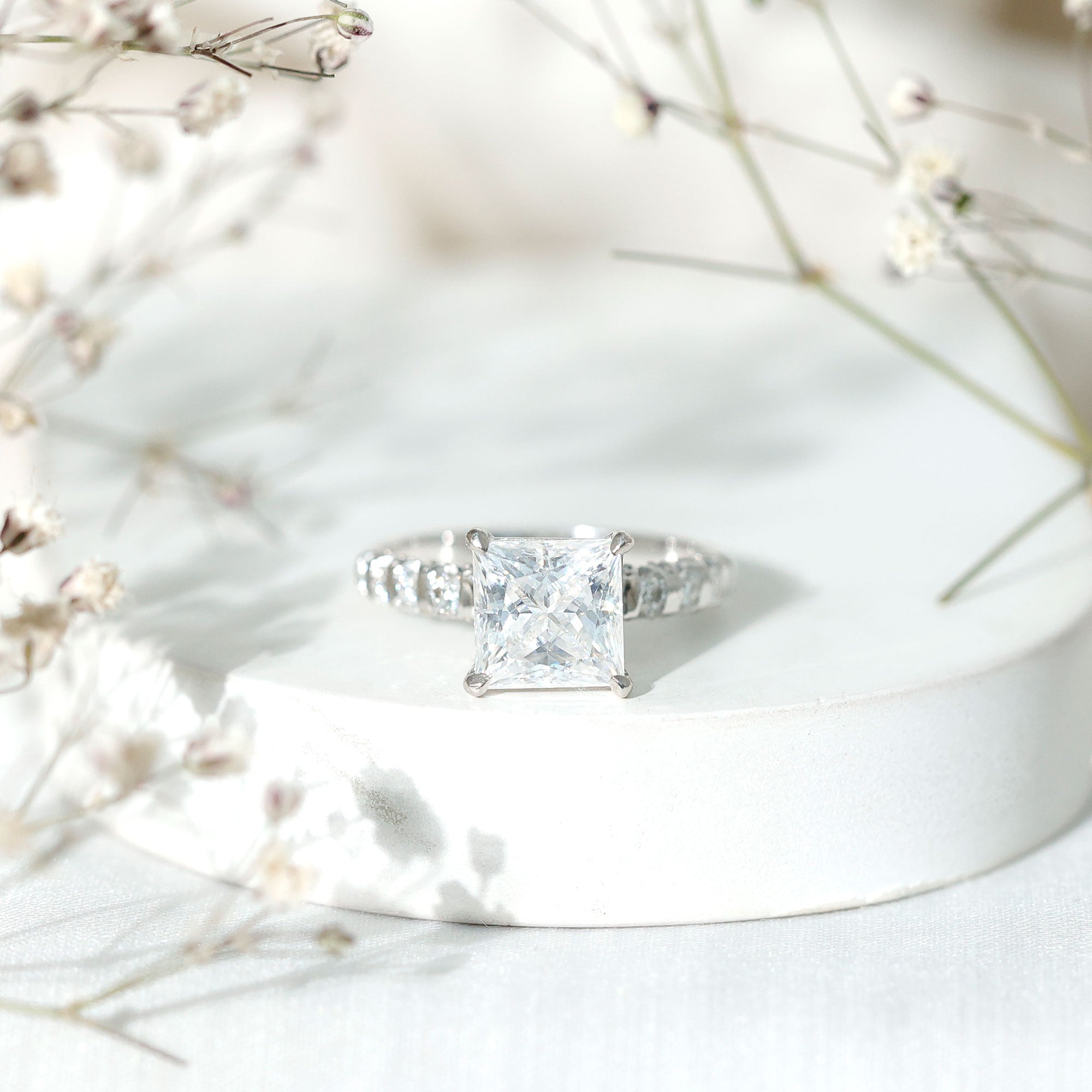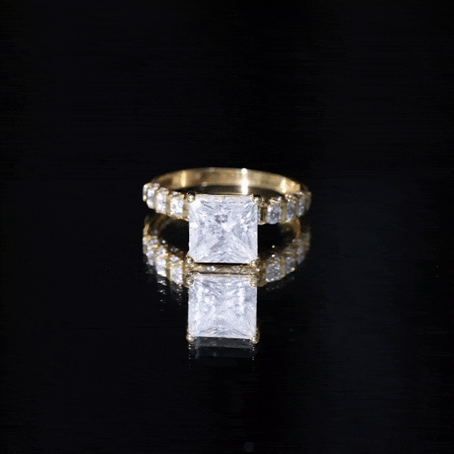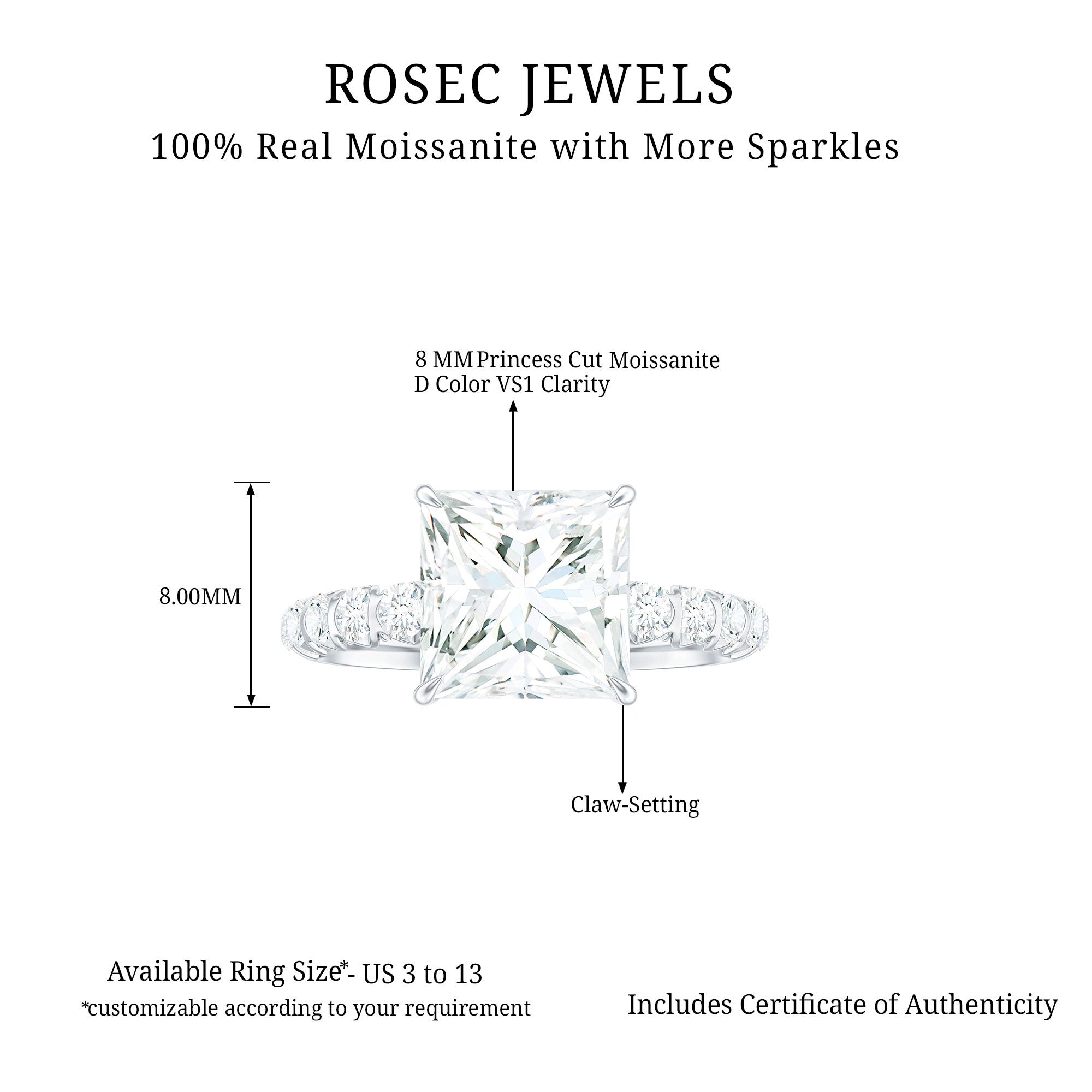 Make your proposal unforgettable with this enchanting Moissanite Ring from Rosec Jewels. A stunning 8 MM princess-cut Moissanite stone takes center stage, nestled in a gleaming claw setting and surrounded by sparkling side stones. This Solitaire Ring has a total weight of 4 carats, with a high-quality D color and VS1 clarity, making it truly remarkable. All of our gemstones are certified and subject to rigorous quality control, ensuring you receive only the best. Present Princess Cut Ring to her as a symbol of your boundless love. We ensure that your emotions attached to this ring are safe and securely delivered to you, hence we will send this ring in premium quality packaging with the certificate of gemstone authentication.