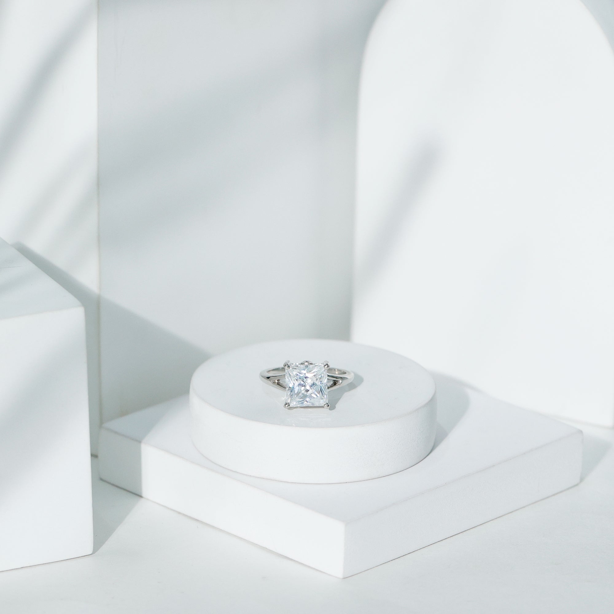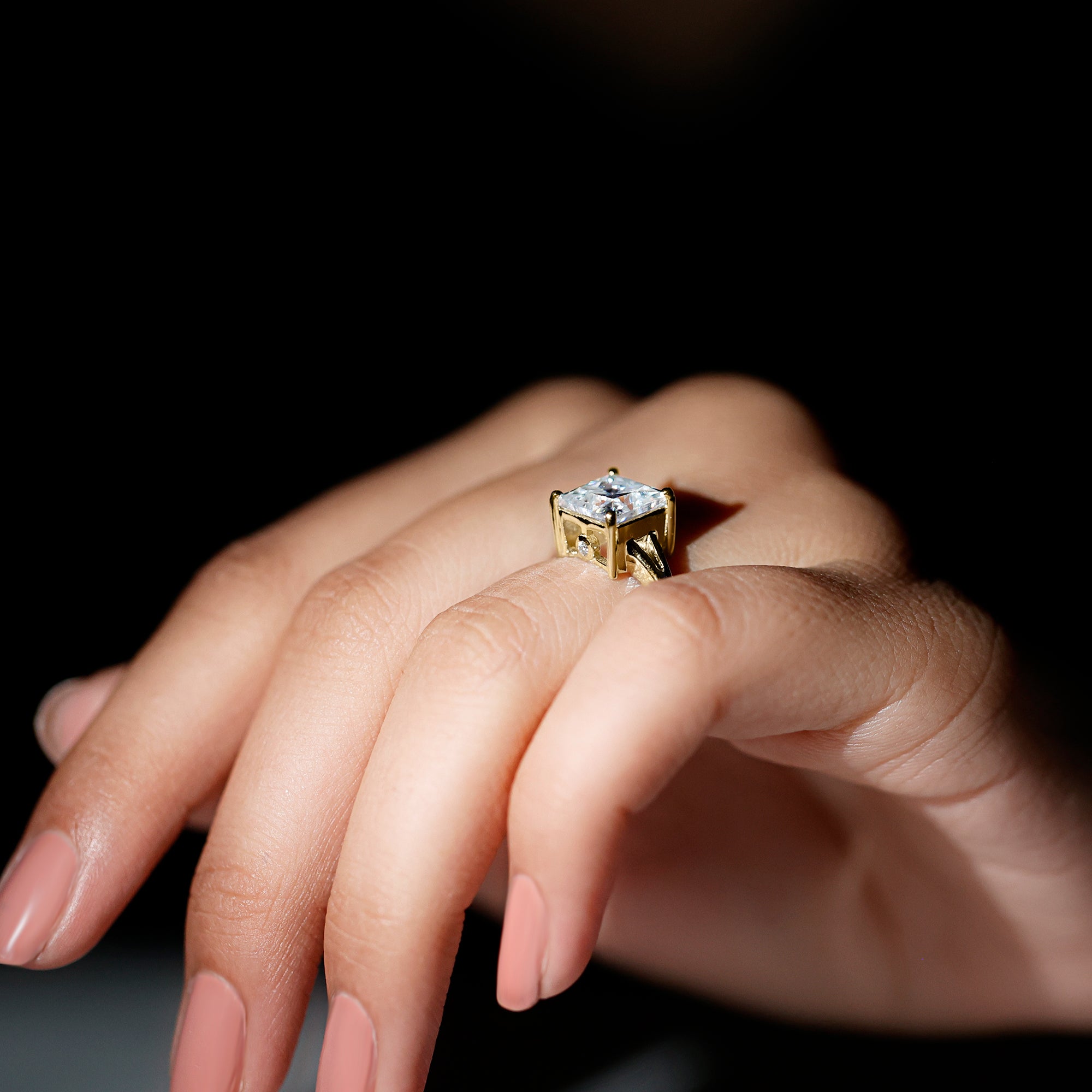 Seal your love story with a ring that embodies the essence of your connection and the brilliance of your love. This gorgeous Solitaire Engagement Ring showcases an 8 MM Princess cut Moissanite at its center, set in a prong setting to enhance its sparkle. The clarity and brilliance of the stone provide a stunning, eye-catching glow, making it perfect for celebrating one of life’s most significant moments. What makes this Moissanite Engagement Ring unique is its stylish split shank design made from plain metal for everyday comfort. Additionally, a hidden moissanite adds a charming surprise to the design, making this Princess Cut Engagement Ring a truly cherished piece of jewelry. The split shank represents the joining of two paths into one, beautifully depicting your shared journey ahead. Modern yet timeless, this Square Engagement Ring combines classic elegance with a bold twist. Whether youre proposing, renewing your vows, or simply expressing your love for her, it’s a piece that conveys so much more than words. Delivered in a beautifully presented jewelry box, this Split Shank Ring is set to create an unforgettable memory.