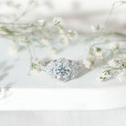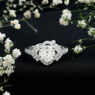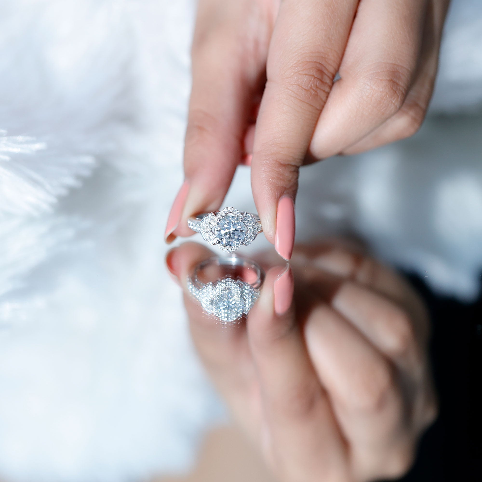 Present this Moissanite Engagement Ring to her and capture a priceless reaction from her. This ring is crafted with 14K White Gold Plated Silver, featuring an 8 MM Round Shape Moissanite adorned with smaller Moissanites as halo, and also decorated on the shank. This 2 Carat Engagement Ring beholds the classic shine of D-VS1 Quality Moissanite securely placed in Prong Setting. Also, the ring represents a strong and unbreakable bond which makes it the perfect choice for your lady to express your love. This Vintage Ring will perfectly suit the vibe of the occasion and will be delivered to you in a premium quality velvet pouch to store when not in use.