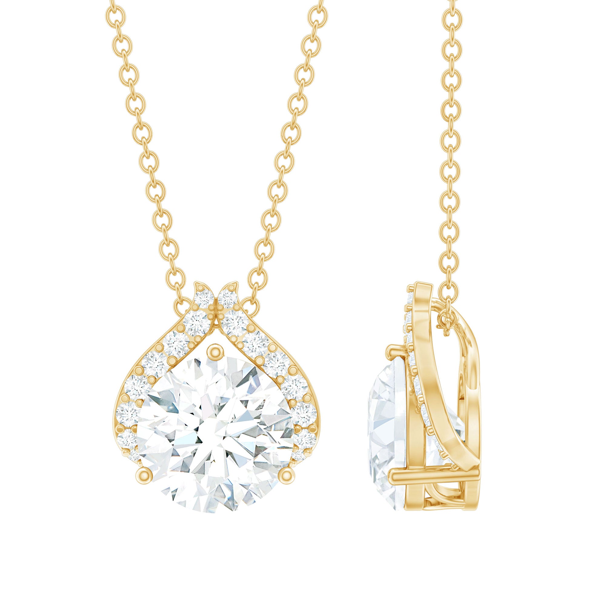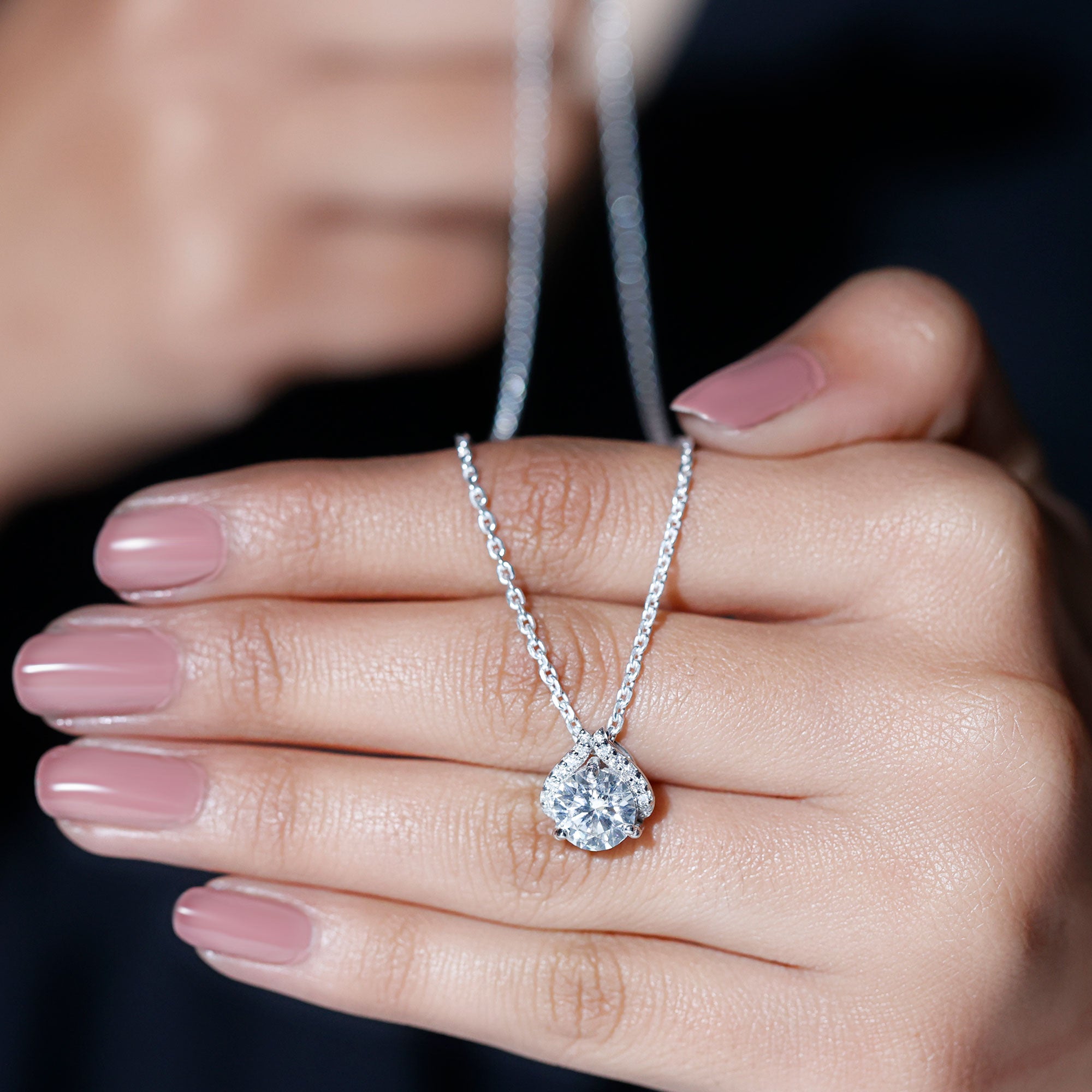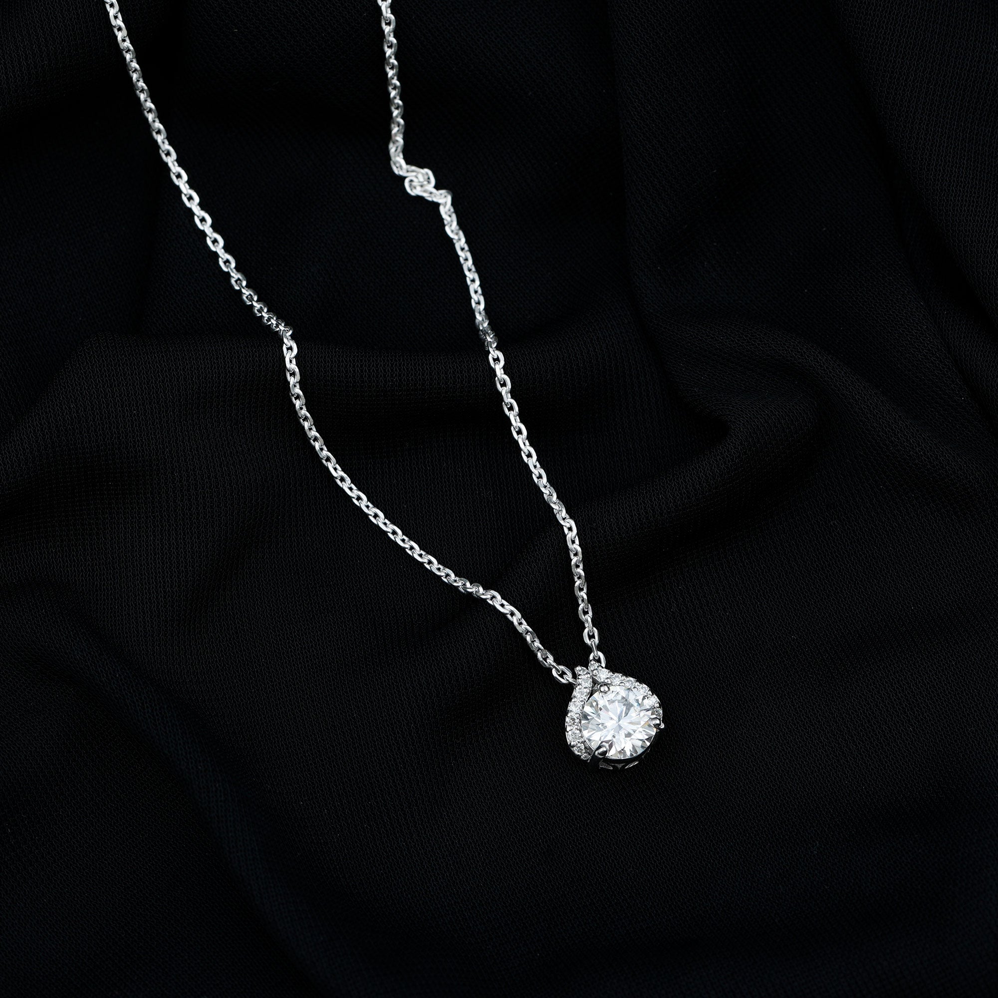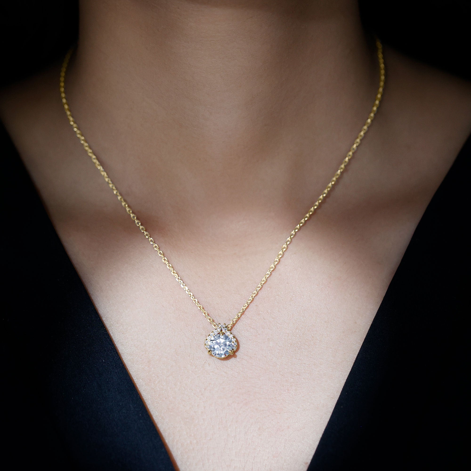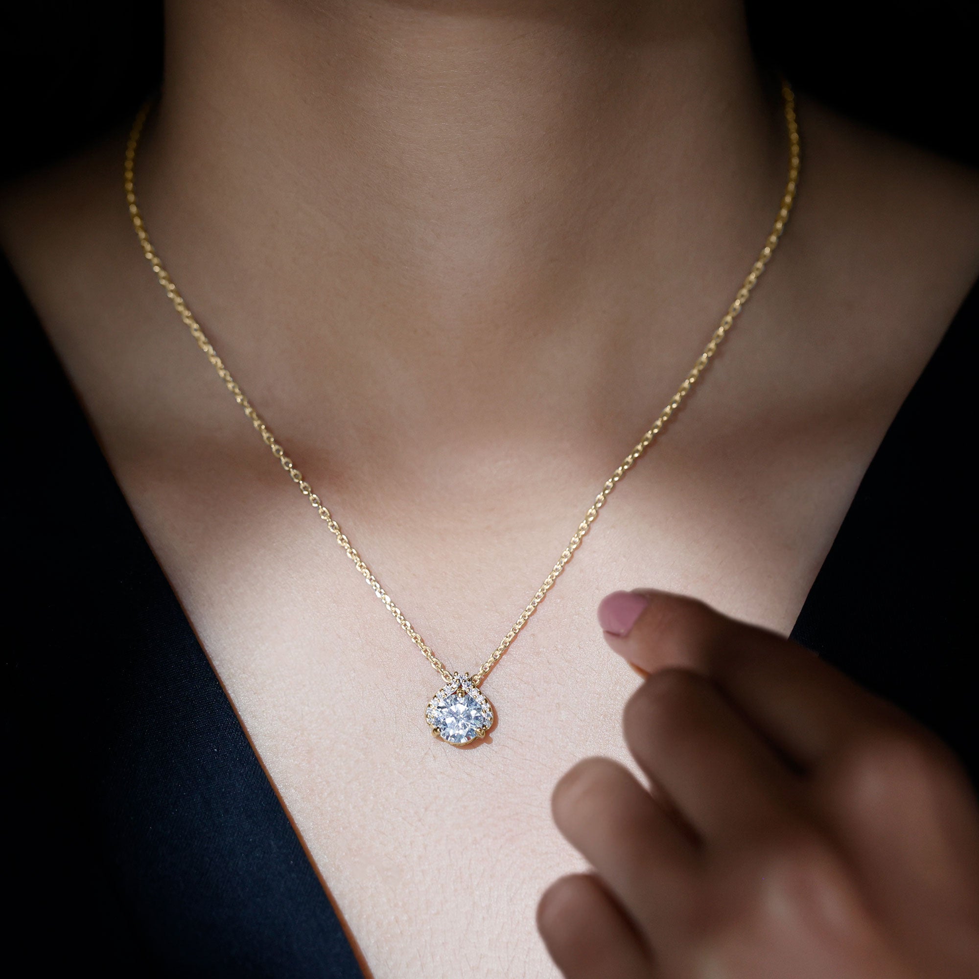 Searching for the perfect pendant necklace to enhance your bridal look - our Diamond Solitaire Necklace got you covered. Embellished with an 8 MM round diamond (lab made) of EF-VS Quality delicately set in secure prong setting with accent, allowing it to shine brightly from every angle. The Bride to Be Pendant is made with ethically sourced, lab-grown diamonds, it offers the luxury of fine jewelry while being environmentally friendly. Simple, yet stunning, this Wedding Diamond Necklace will make your special day truly unforgettable with its unmatched brilliance.