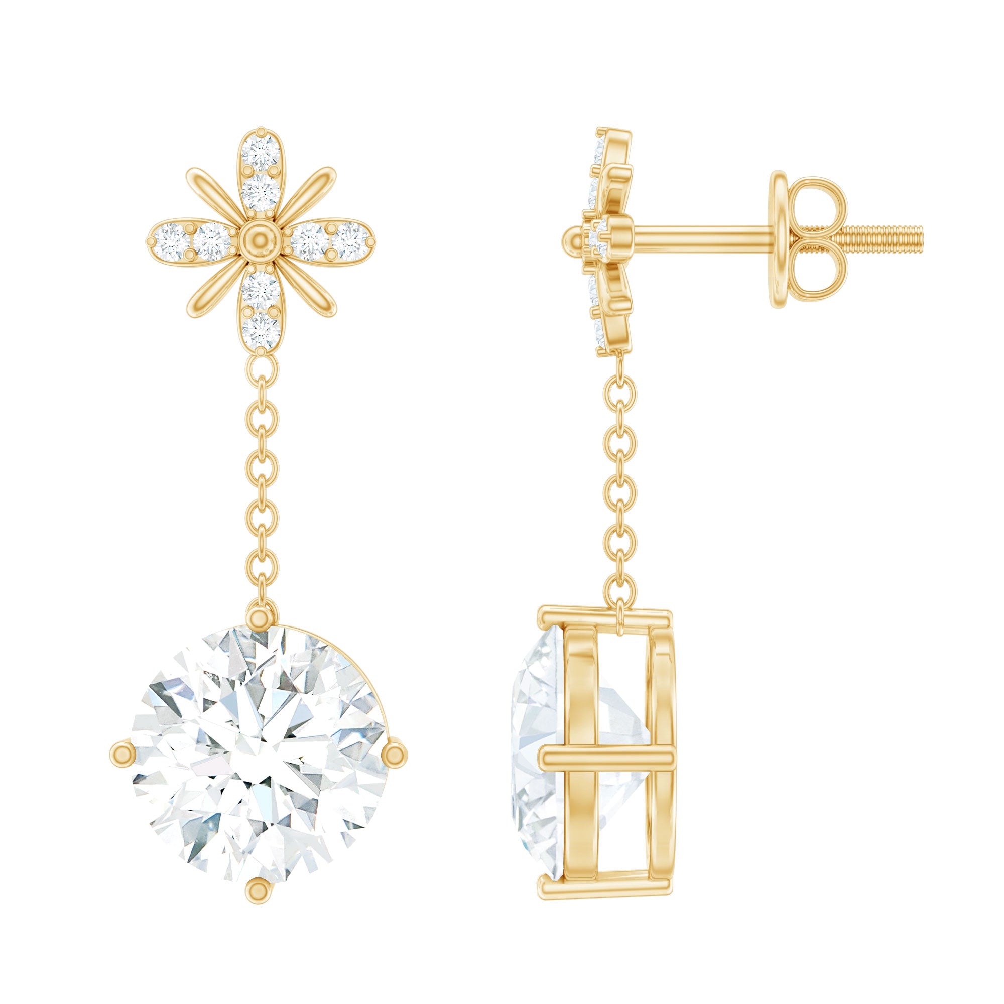 Make a fashion statement with these Chain Diamond Earrings, handcrafted in top-notch metal. The design showcases a diamond-encrusted flower motif at the top, elegantly connected to a round cut diamond (lab made) through a cable chain, creating a graceful dangle effect that adds charm and sparkle to every movement. The prong setting securely holds each 8 MM round diamond (EF-VS Quality), while the screw-back closure of these Dangle Earrings ensures a comfortable fit throughout the day. They can be present as an alternative April Birthstone Earrings and are available in a wide range of metal choices, allowing you to select the perfect material to match your style and make it truly unique.