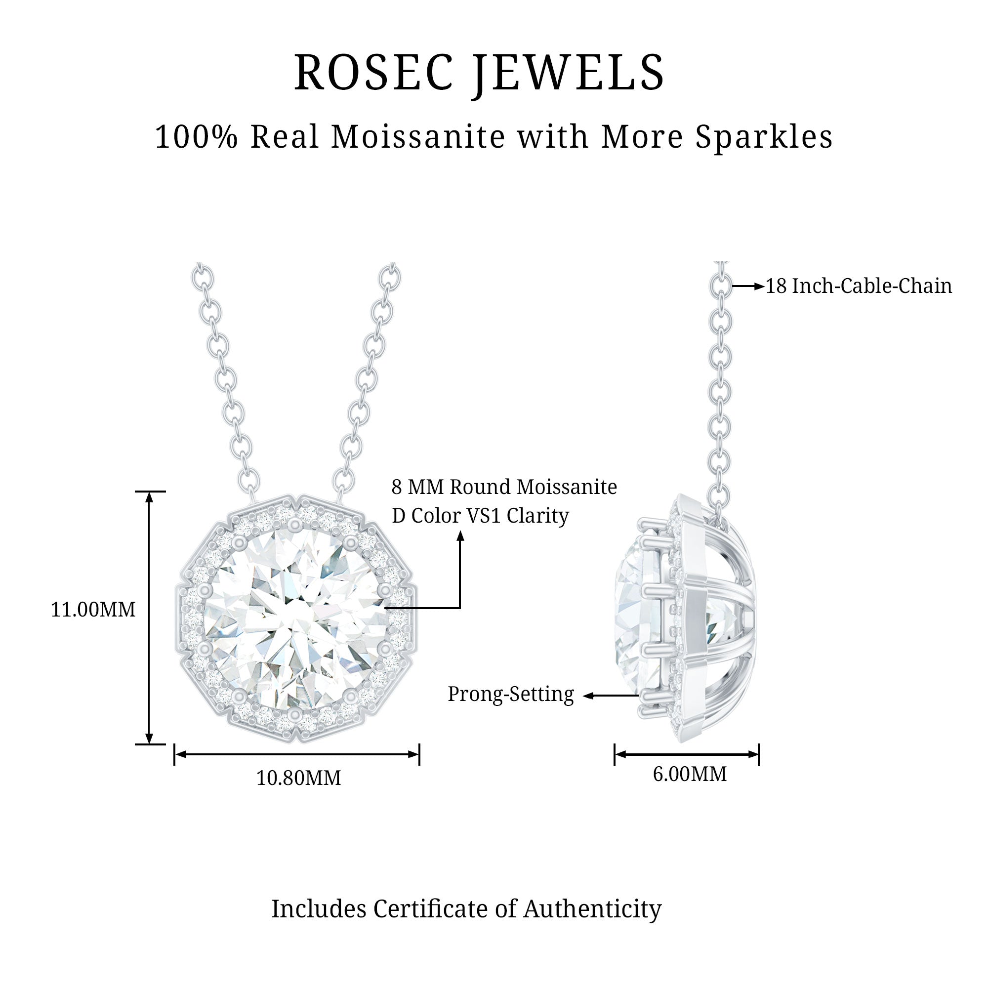 This stunning Moissanite Chain Pendant is a classic beauty, featuring a dazzling 8 MM round cut moissanite at its center, encircled by a sparkling halo in a prong setting. Not only does this Round Moissanite Pendant radiate luxury, but it also represents a thoughtful choice, crafted with a D color VS1 clarity stone, making it an affordable jewelry option. Moreover, this Bridal Necklace is made from 14K White Gold Plated Silver, making it a fantastic pick for everyday wear or special events. This lovely pendant hangs from a cable chain and is secured with a lobster clasp, allowing you to easily adjust the length for the perfect fit around your neck. If you are in search of something unique, timeless, and brilliantly beautiful, this Halo Pendant is the ideal piece to celebrate your love.