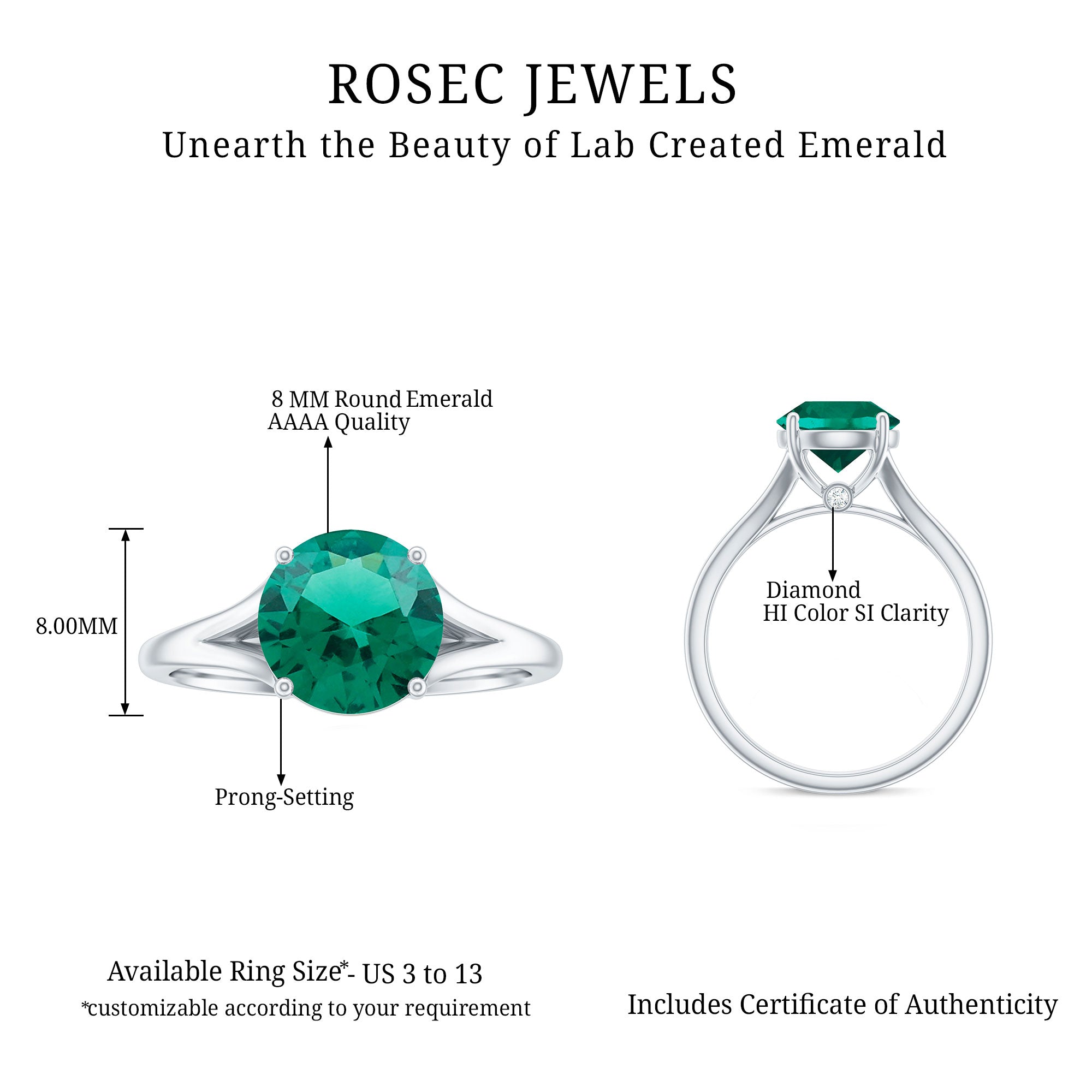 Let your love shine as brilliantly as this Solitaire Engagement Ring. Crafted to capture hearts, this Fine Ring features a mesmerizing 8 mm Lab Created Emerald set in Prong Setting as a centerpiece. The elegant Split Shank design gracefully wraps around the center stone, giving this Lab Grown Emerald Ring a modern look while drawing attention to the stunning emerald. What makes this Split Shank Engagement Ring truly special is two Diamond stones placed beneath the center stone, an intimate secret that sparkles subtly, representing the depth and mystery of your unique bond. This thoughtful detail adds a layer of meaning that makes this Lab Emerald Diamond Engagement Ring beautiful and deeply personal. Perfect for those who appreciate both classic elegance and contemporary design, this Lab Created Emerald Ring is handcrafted to highlight the brilliance of the AAAA Quality Lab Emerald while offering a comfortable fit. Whether it is for a proposal or a celebration of lasting love, this 2 Ct Emerald Ring stands as a statement of commitment and timeless style. Packaged in an elegant jewelry box, this mesmerizing ring is ready to become a treasured part of your love story. A bold yet graceful choice for a forever promise.