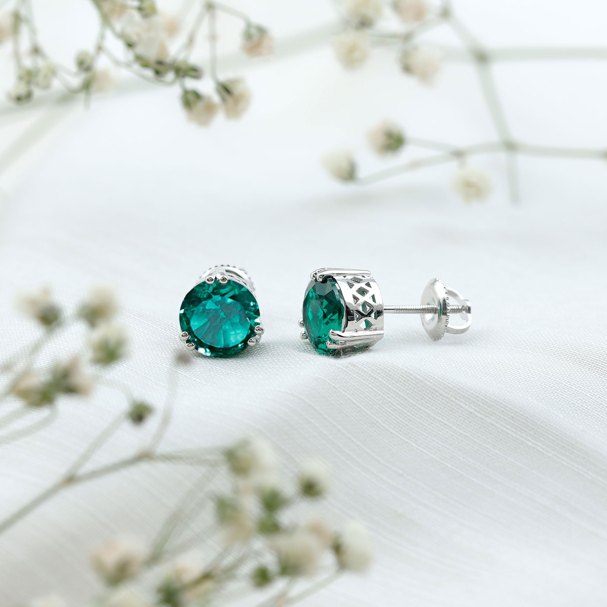 Adorn yourself with a burst of vibrant green brilliance through these Lab Emerald Stud Earrings, thoughtfully set in 925 Sterling Silver. Each earring features an 8 mm Round Shape Lab Grown Emerald set in 3 Double Claw Prong Setting, that glows instantly elevates your look, offering a refreshing mix of bold color and timeless elegance. Designed with secure Screw Back Closure, these Lab Emerald Studs provide both comfort and confidence, making them perfect for long days out or chic evenings with friends. Arriving in a beautiful jewelry box, they make gifting effortless, an ideal surprise for birthdays, anniversaries, graduations or simply to treat someone special. These Lab Emerald Ear Studs bring the beauty of classic gemstones with the modern appeal of lab grown brilliance, offering a sustainable and stylish choice for everyday wear. Perfect for those who love color, elegance and a hint of luxury, this pair is a must-have accessory that brightens any jewelry collection.