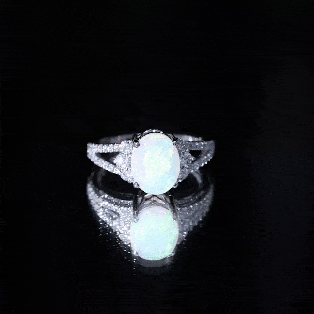 The diamond detailing enhances the overall composition without competing with the opal’s natural character, allowing the center stone to remain the primary focus.