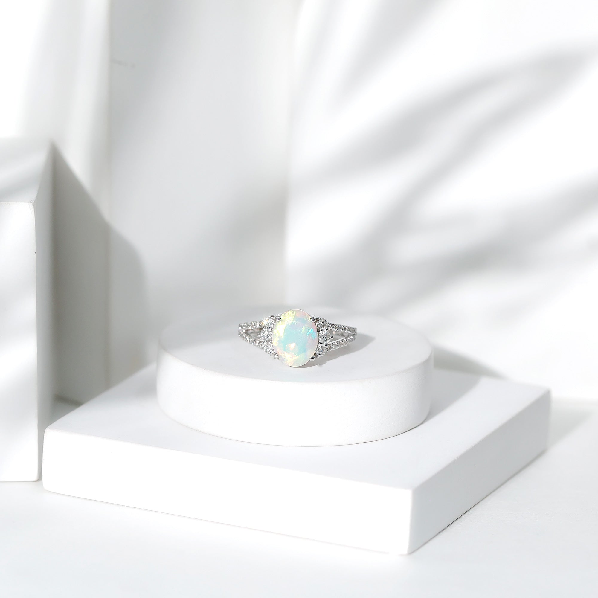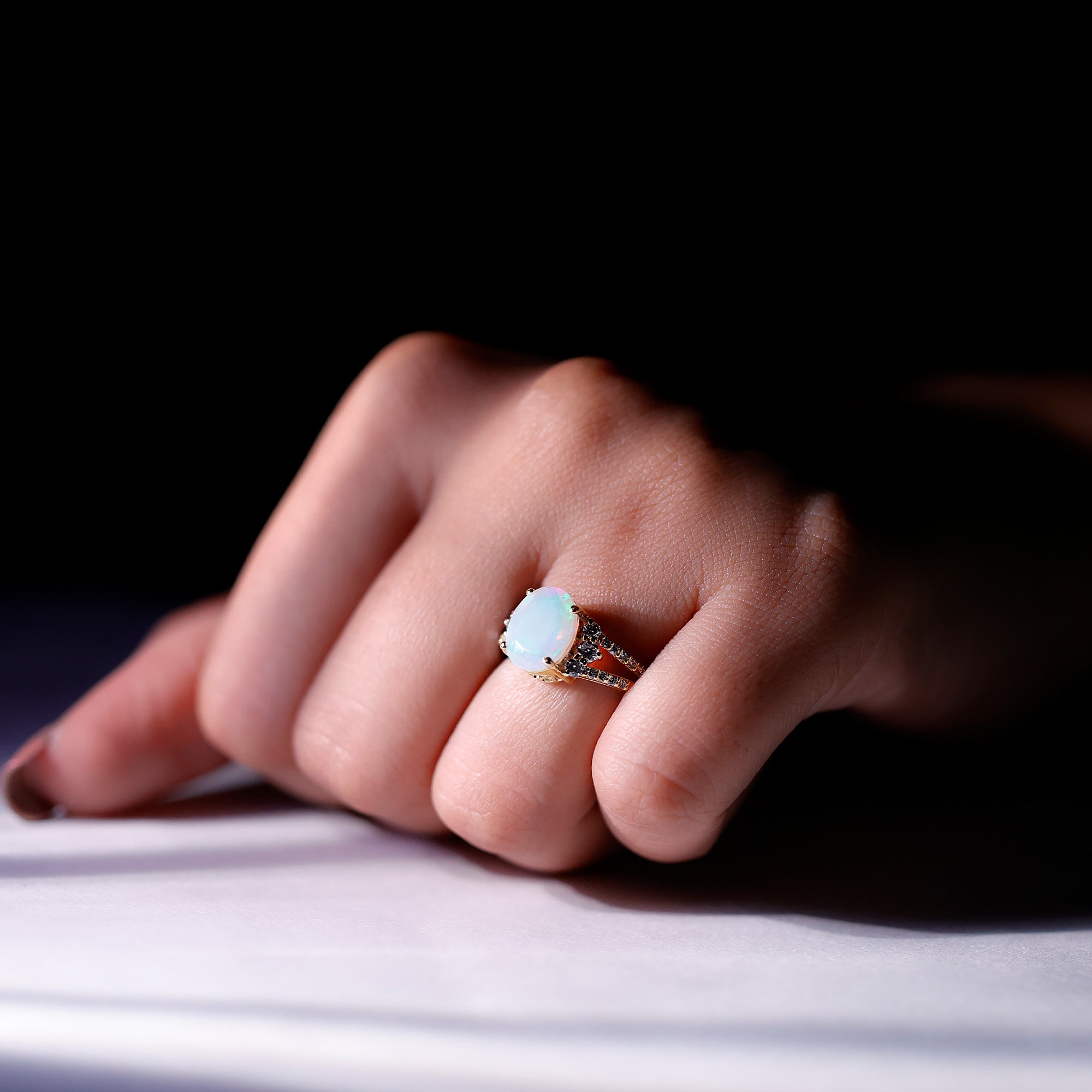 The Certified 8x10 MM Ethiopian Opal Oval Engagement Ring with Diamond is created for those who value individuality and expressive color in their engagement ring. The oval opal becomes the visual centerpiece, offering a luminous play-of-color that shifts subtly with light and movement.