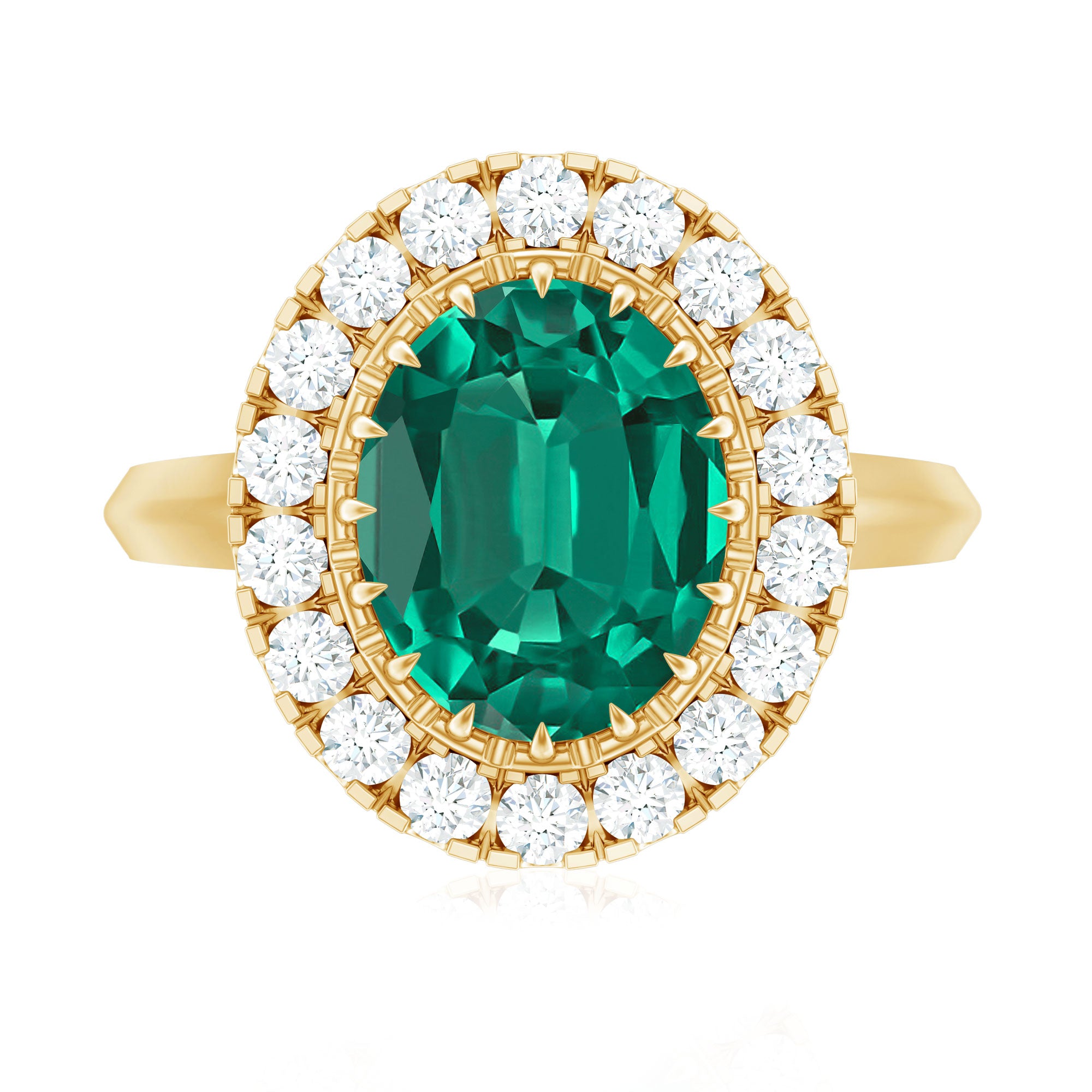 Discover a blend of classic charm and modern sparkle with this Lab Grown Emerald Engagement Ring, accented by a dazzling Moissanite Halo. The vibrant 8X10 mm Oval Shape Lab Created Emerald takes center stage, glowing with a rich, deep green that instantly captivates the eye. Around the centerpiece is a sparkling Halo of Moissanite stones that adds brilliant fire and elegance, making every movement shimmer with light. This Oval Engagement Ring features a beautiful vintage inspired design carved beneath the center stone, adding a unique touch of artistry and timeless grace. This delicate detail makes this Lab Emerald Halo Engagement Ring stand out, giving it personality and depth beyond the surface. Available in a wide range of ring sizes, this Oval Emerald Engagement Ring (Lab Grown) fits comfortably and is perfect for anyone who loves jewelry with meaning and style. Whether it is a proposal, an anniversary or a special gift, this Vintage Style Engagement Ring is designed to celebrate unforgettable moments. Delivered in a lovely jewelry box, it is ready to surprise and delight. Embrace the beauty of sustainable luxury with this ring, a perfect symbol of your unique love story.