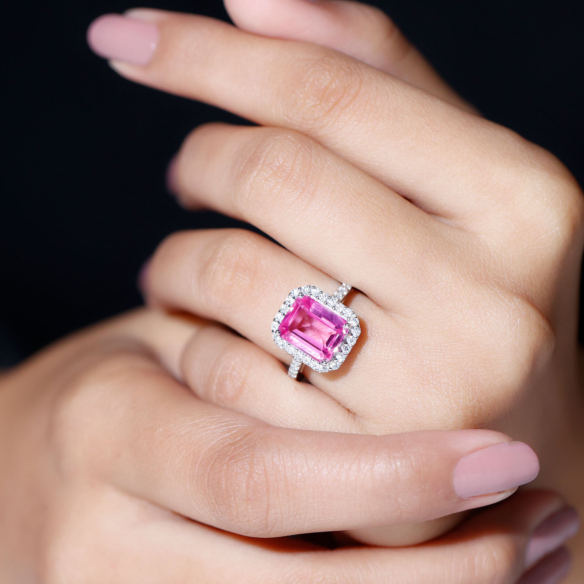 Certified 8X10mm Lab Grown Pink Sapphire Emerald Cut Engagement Ring with Halo