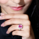 Make a stunning statement with this enchanting Emerald Cut Engagement Ring, designed to celebrate love in its most romantic form. The mesmerizing 8X10 mm Emerald Cut Lab Created Pink Sapphire shines at the center in Prong Setting with a soft yet vibrant glow, symbolizing devotion and a future filled with beautiful memories. Surrounding it is a sparkling Halo of Moissanite stones, with additional brilliance cascading down the band, creating a breathtaking play of light that feels both luxurious and heartfelt. Crafted with 925 Sterling Silver, this Lab Pink Sapphire Engagement Ring blends modern elegance with timeless charm, making it a perfect choice for the woman who loves a touch of color and meaningful detail. Every angle reflects a story of commitment, making it ideal for proposals, anniversaries or moments when you want to express your eternal love. Arriving in a signature jewelry box and available in various sizes, this Big Engagement Ring is ready to become a cherished keepsake she will treasure forever.