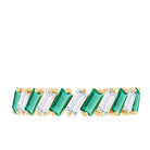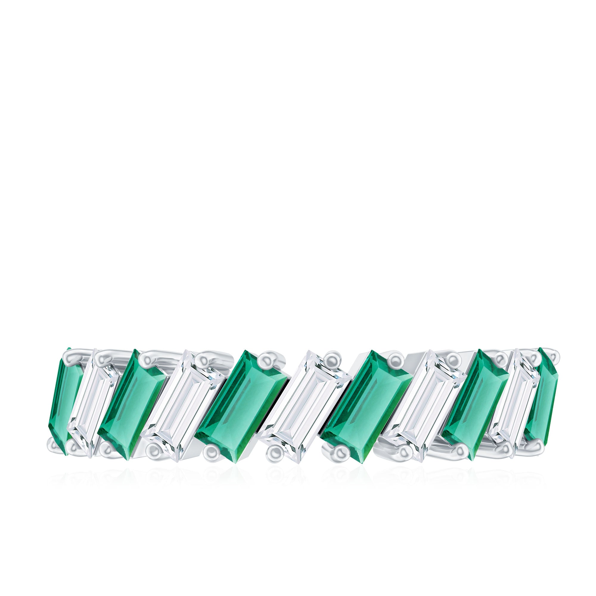 Shine bright and celebrate your everlasting bond with this mesmerizing Half Eternity Band. Designed to captivate attention, this unique band features 2X4 mm Baguette Shape Lab Created Emerald and Moissanite stones, each placed in a tilted 2 Prong Setting in an alternate pattern along the band. Creating a modern and eye-catching rhythm that enhances the brilliance and color contrast between the vibrant green AAAA Quality Lab Emerald and the dazzling D-VS1 Quality Moissanite stones. The half eternity design symbolizes both the enduring love you share and the promise of many more beautiful moments ahead. Unlike a full eternity band, this Lab Grown Emerald Ring is comfortable for everyday wear while still offering remarkable sparkle. Whether gifted on a wedding anniversary, milestone celebration or as a meaningful reminder of your lifelong commitment, this Lab Emerald Anniversary Band stands as a timeless piece of jewelry. Its thoughtful design and meaningful symbolism make it an ideal choice for those who appreciate beauty with purpose. Presented in an elegant jewelry box, this Wedding Anniversary Ring is destined to be treasured forever as a symbol of love that grows stronger with every passing year.