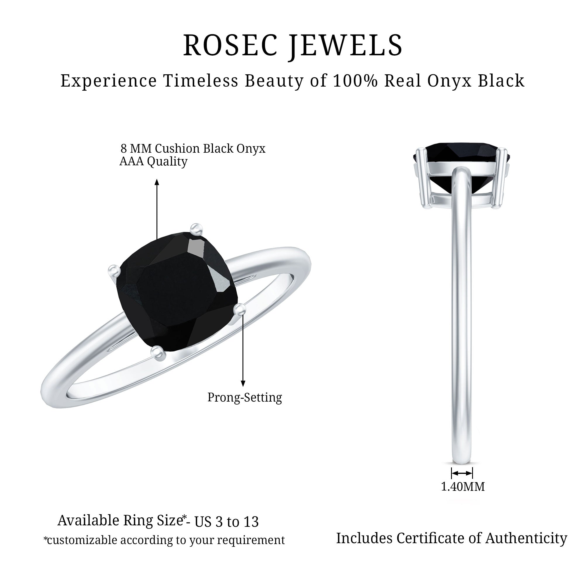 When love is real, you do not need all the extras - just one perfect and simple piece is enough to mark it. This Solitaire Black Onyx Engagement Ring is the kind of ring that speaks with quiet confidence. Featuring an elegant 8 MM cushion cut black onyx as the center of attention, it is a piece that feels strong, meaningful, and effortlessly stylish. The prong setting keeps the gemstone secure while showing off its rich color. Made with AAA quality black onyx, the gemstone carries not just beauty but symbolism too. As the birthstone for December, black onyx is known for its protective, calming energy. It is believed to help with grounding, focus, and emotional strength - making this Black Onyx Ring a beautiful and thoughtful choice for a lifelong promise. This Cushion Cut Engagement Ring is all about simplicity. Whether you are popping the question or choosing a ring that reflects your partner’s bold yet elegant taste, this solitaire design is a timeless pick. It holds meaning, style, and strength, all in one stunning gemstone. And to make sure you are getting the real deal, this Black Stone Engagement Ring comes with a certificate of authenticity, giving you confidence in the quality and craftsmanship behind every detail.
