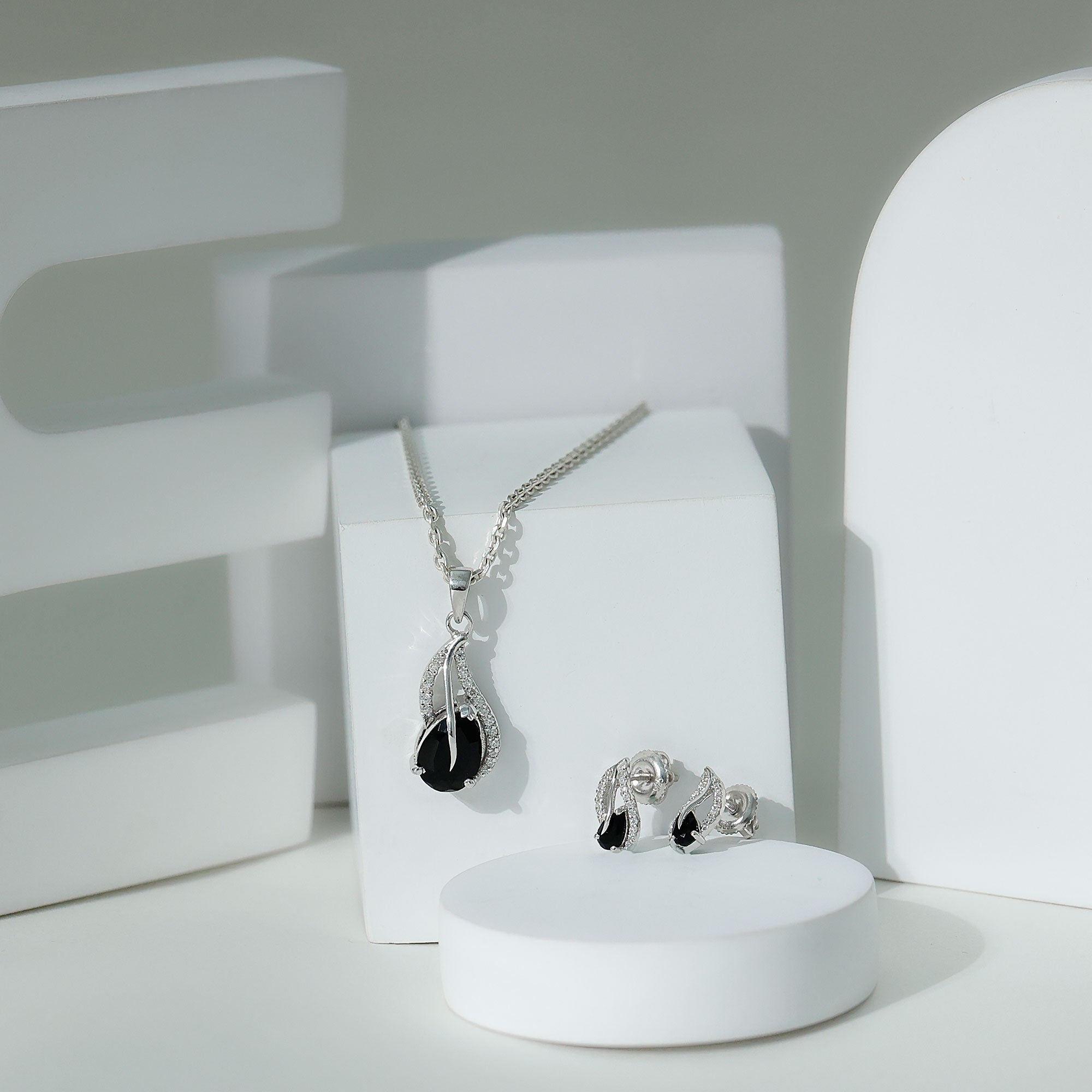 Our classic Black Onyx Necklace and Earrings Set is a masterpiece of contrast and brilliance. Crafted in 14K White Gold Plated Silver, it features a bold pear shaped black onyx set in secure prong setting, which makes a striking statement. Surrounding it is a delicate leaf like curve, lined with round cut moissanite stones that shimmer beautifully, adding the perfect touch of sparkle. The design is graceful yet striking, making it perfect for both everyday wear and special occasions. The December Birthstone Pendant with Chain has a fluid design that beautifully sits on the neck, while the matching stud earrings with screw on backs complete the set with a sophisticated charm. This Black and White Jewelry Set is not just a piece of jewelry it is a statement of elegance that lasts forever.