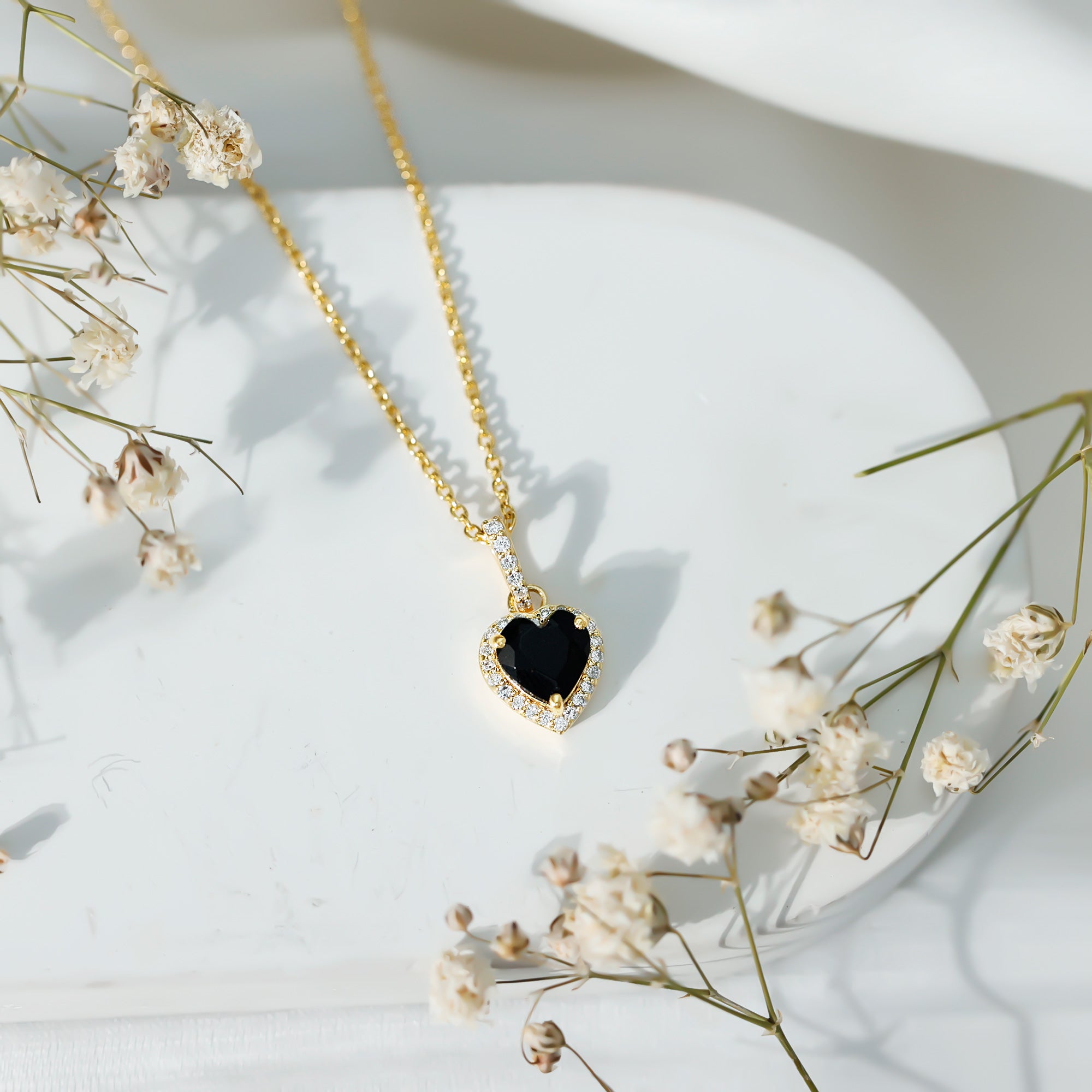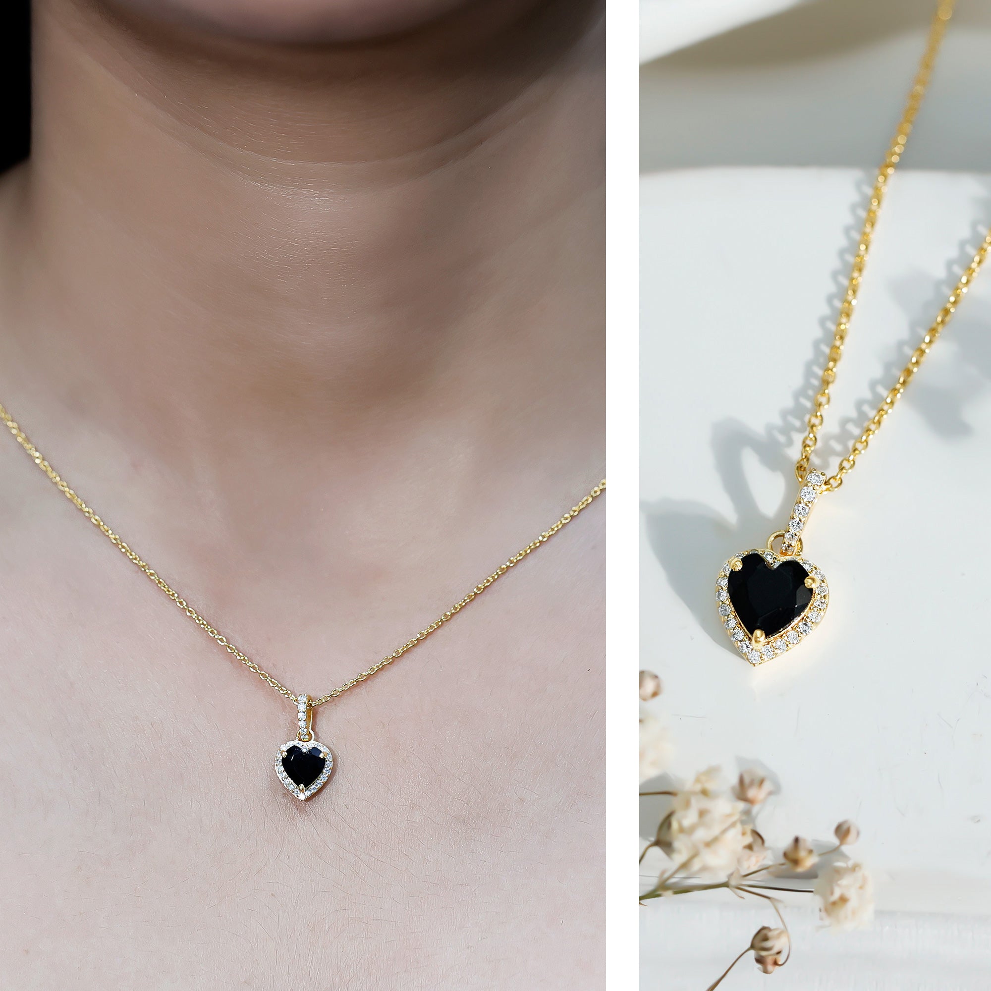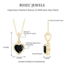 Designed to bring out your bold side with a soft touch, this Black Onyx Heart Necklace is all about strong style with graceful charm. Handcrafted in 14K yellow gold plated silver, this piece brings together elegant curves, fine sparkle, and meaningful design into one standout necklace. At the center is a 7 MM heart shaped natural Black Onyx, set securely in prong setting. Surrounding it is a round cut lab grown diamond halo, adding a gentle shimmer that beautifully frames the centerpiece. Just above the heart, the decorative bail also features shimmering round diamonds, adding an extra bit of sparkle and smooth transition to the chain. The Black Onyx and Diamond Necklace hangs from a sleek chain that sits just right on the neckline, making it perfect for layering or wearing solo. Whether you are dressing up for date night, marking a special milestone, or simply want something that feels a little more, this Heart Locket Necklace adds a thoughtful, polished touch. The natural AAA quality Black Onyx brings depth, while the EF-VS quality lab grown diamonds add a light-catching brilliance. It comes in a signature jewelry box with a gemstone certificate, making it a meaningful gift for someone special, or a perfect treat for yourself.