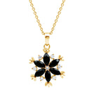 Bold beauty meets natural charm in this elegant Flower Pendant Necklace, designed for those who love standing out in subtle ways. Crafted in 14K yellow gold plated silver, this Floral Necklace is made with six marquise shaped Black Spinel gemstones arranged into a delicate flower. Each stone is securely set in prongs, forming smooth, petal-like points that give the piece a graceful shape. Between the petals, round lab grown diamonds add a soft shimmer, creating a beautiful contrast between the deep black tones of the spinel and the bright sparkle of the diamonds. A single lab grown diamond in the center completes the design, adding harmony and balance to the flower. This Black Spinel Necklace is light and easy to wear, hanging from a dainty matching cable chain that rests comfortably against your skin. It is the kind of piece that blends effortlessly into your everyday style, yet still holds its own for special moments. Whether you wear it to work, on a dinner date, or to a special celebration, it brings quiet elegance to every occasion. This Black Spinel and Diamond Necklace is a gentle expression of strength, style, and individuality. A thoughtful gift for birthdays, holidays, or simply to treat yourself, it is a piece you will reach for again and again.