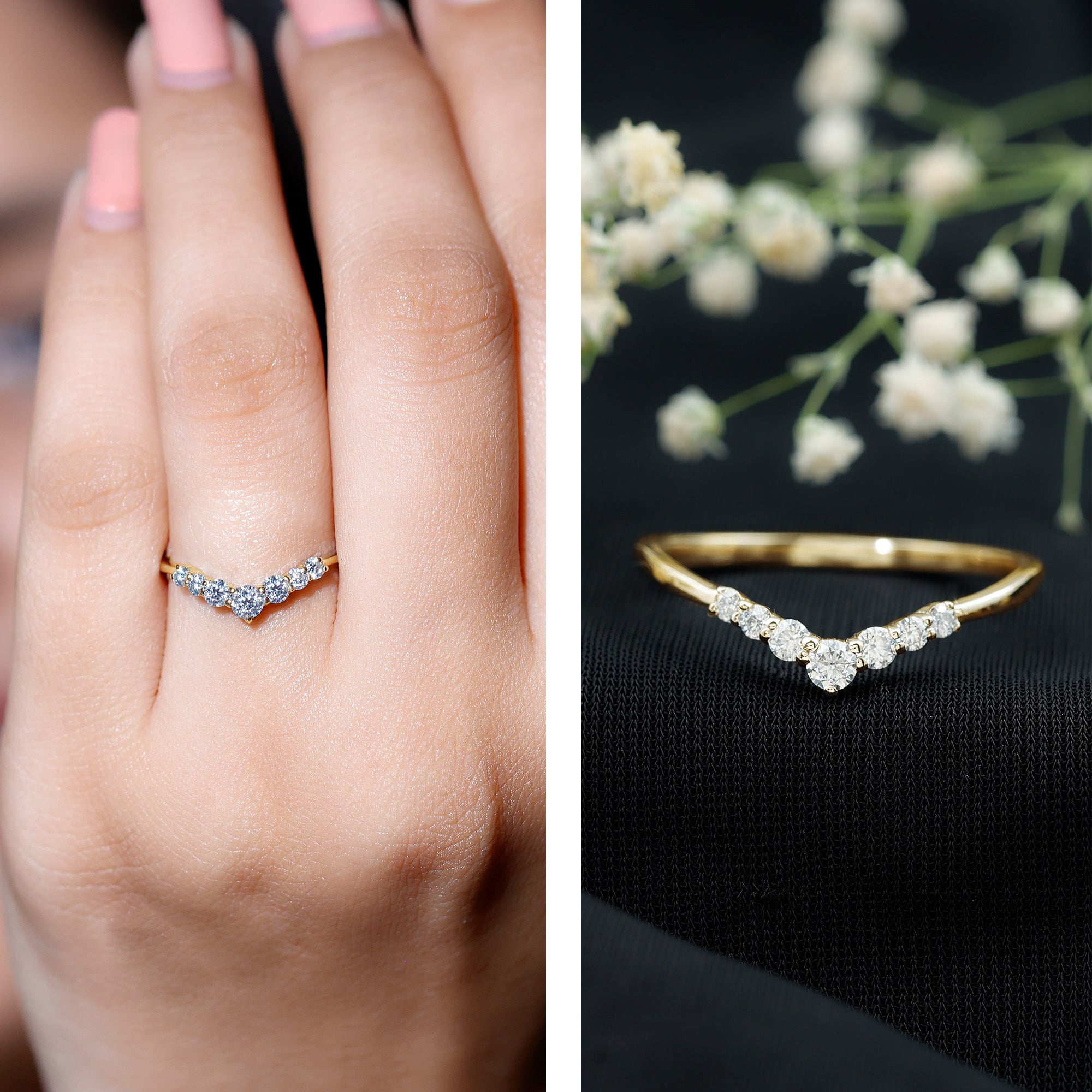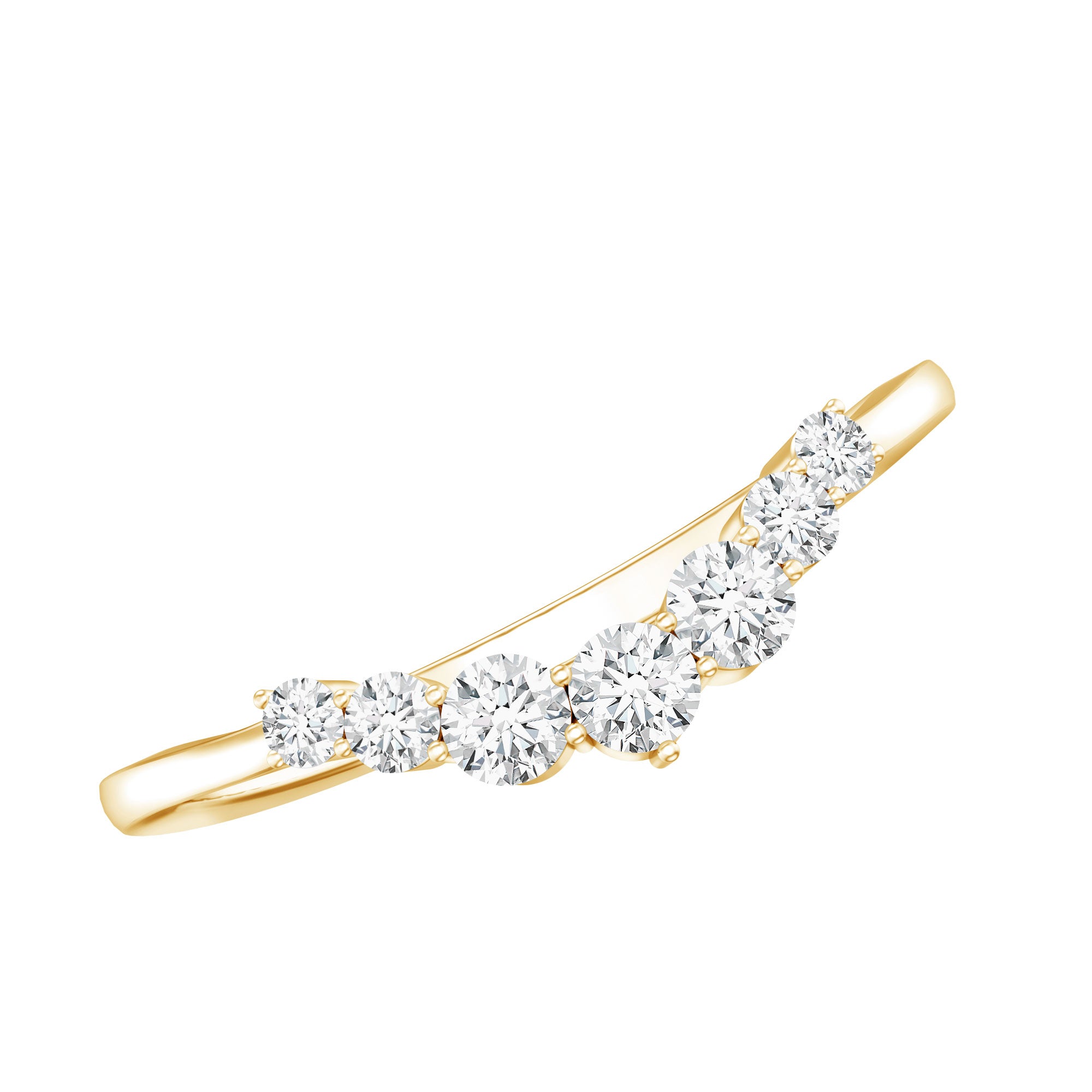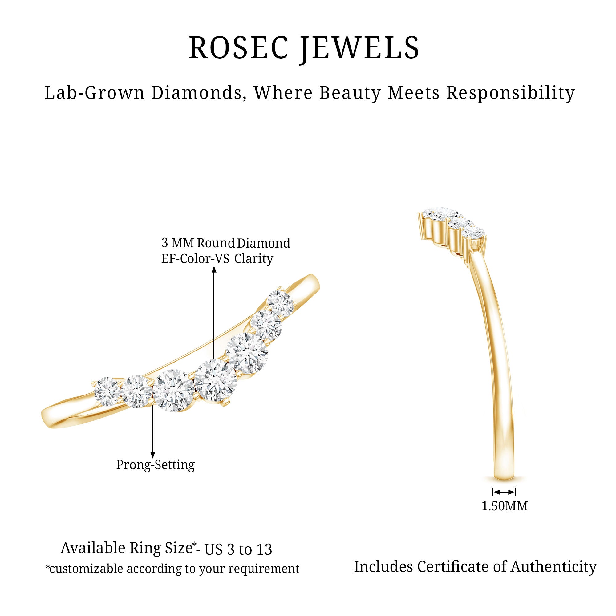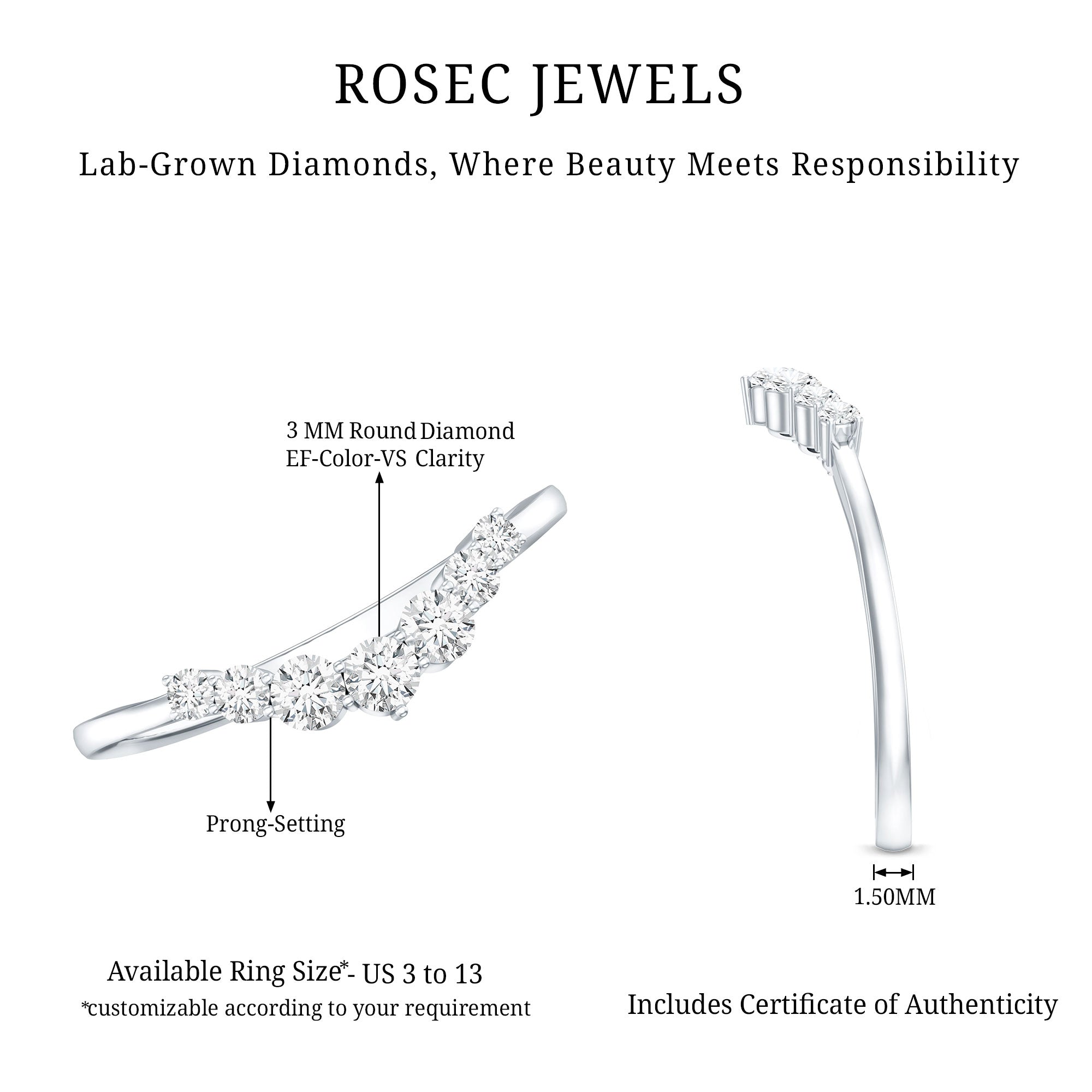 Crafted by Rosec Jewels, this Lab Grown Diamond Enhancer Ring showcases a stunning arc of graduated diamonds, representing how genuine love beautifully bends but never breaks. It boasts a chic and elegant design featuring round cut lab grown diamonds of EF-VS quality, all securely set in prong setting. The band is gracefully curved in a chevron style, making it a perfect pick for women looking to add more sparkle or a fresh look to their engagement ring. Whether worn alone as a bold statement or stacked with another ring, this Curved Ring captures the essence of love, elegance, and brilliance. This Lab Grown Diamond Ring Guard includes a certificate of authenticity and comes in a signature jewelry box, allowing you to keep your ring safe when it is not being worn. With options for customization, you can turn this Stackable Band Ring into something truly unique.