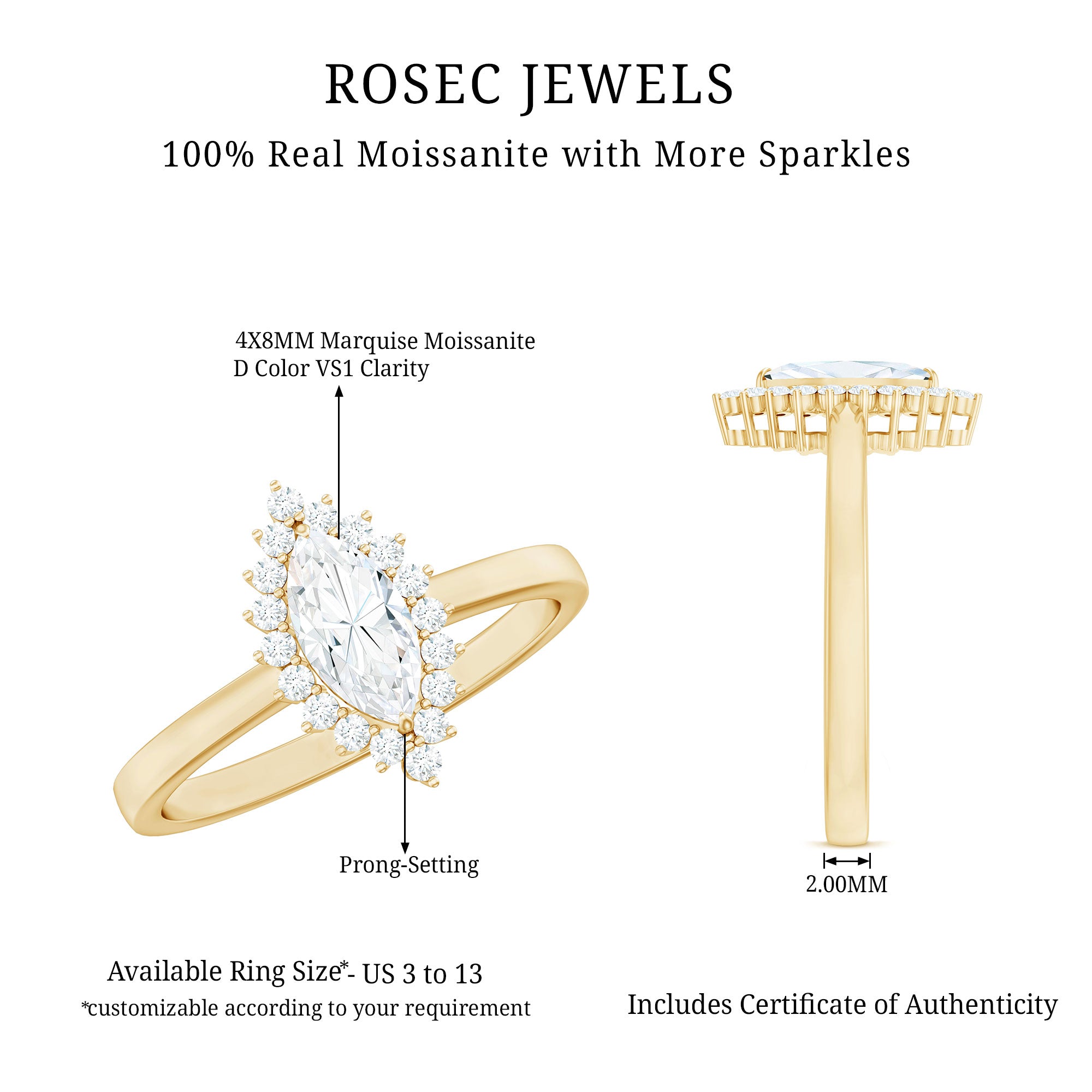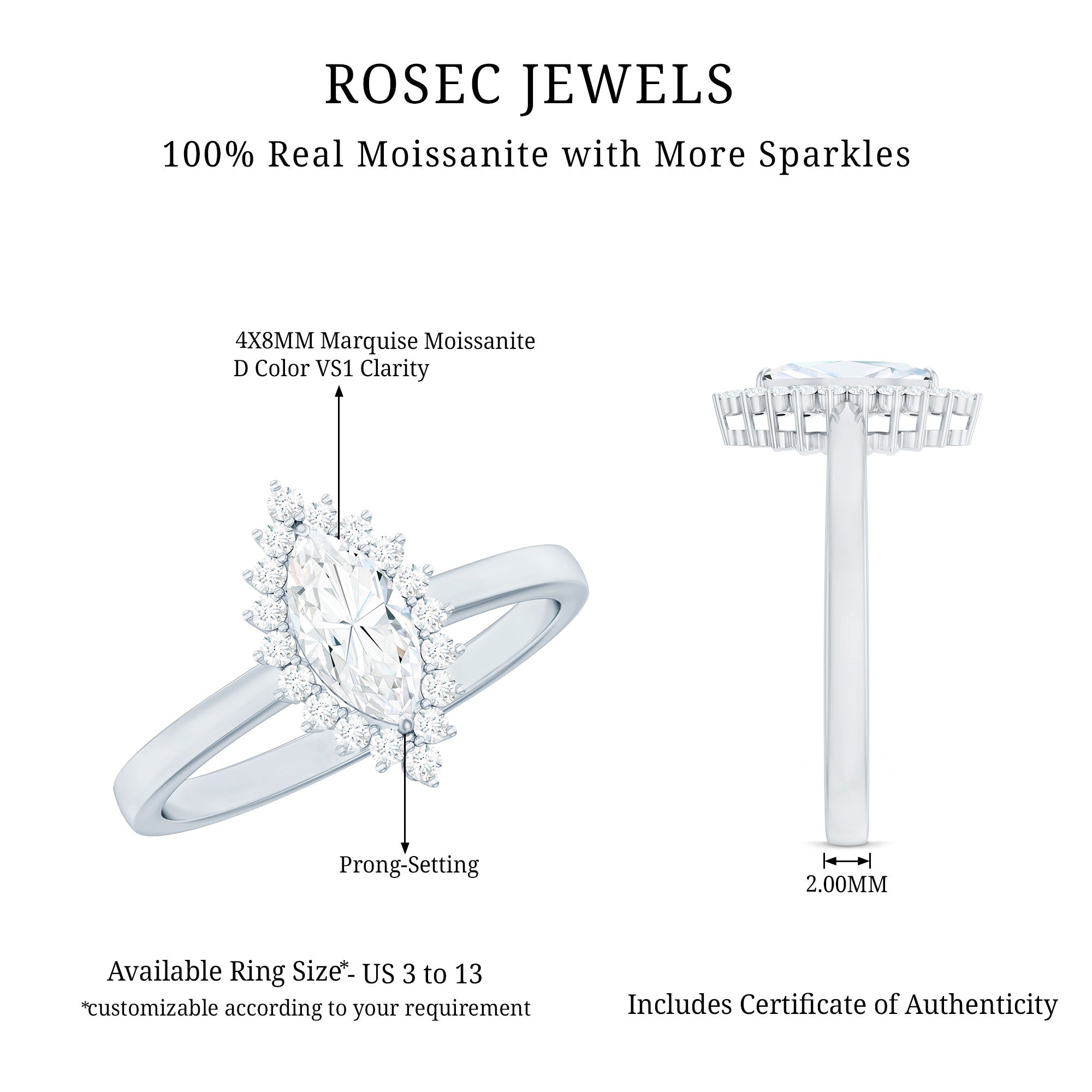 This elegant Halo Engagement Ring features a beautiful marquise cut moissanite at the center set in prong setting. The stone measures 4X8 MM and is known for its elongated shape that adds a graceful and flattering look to the finger. Surrounding the center stone is a delicate halo of small round moissanite stones, all set closely together to add extra sparkle. The moissanite used in this Marquise Engagement Ring is of high quality, with D color and VS1 clarity. That means the stones are very clear and bright, giving you the beauty of fine diamonds without the high cost. This Halo Moissanite Engagement Ring is a lovely choice for an engagement, promise, or anniversary gift. Its elegant style suits someone who loves classic beauty with a little extra shine. The elongated marquise shape adds something unique, while the halo style gives it a touch of vintage charm. Simple, meaningful, and full of sparkle, this Marquise Moissanite Ring is a perfect symbol of love. Whether you are starting a new journey or celebrating your bond, this ring will be a lasting reminder of your special moments.