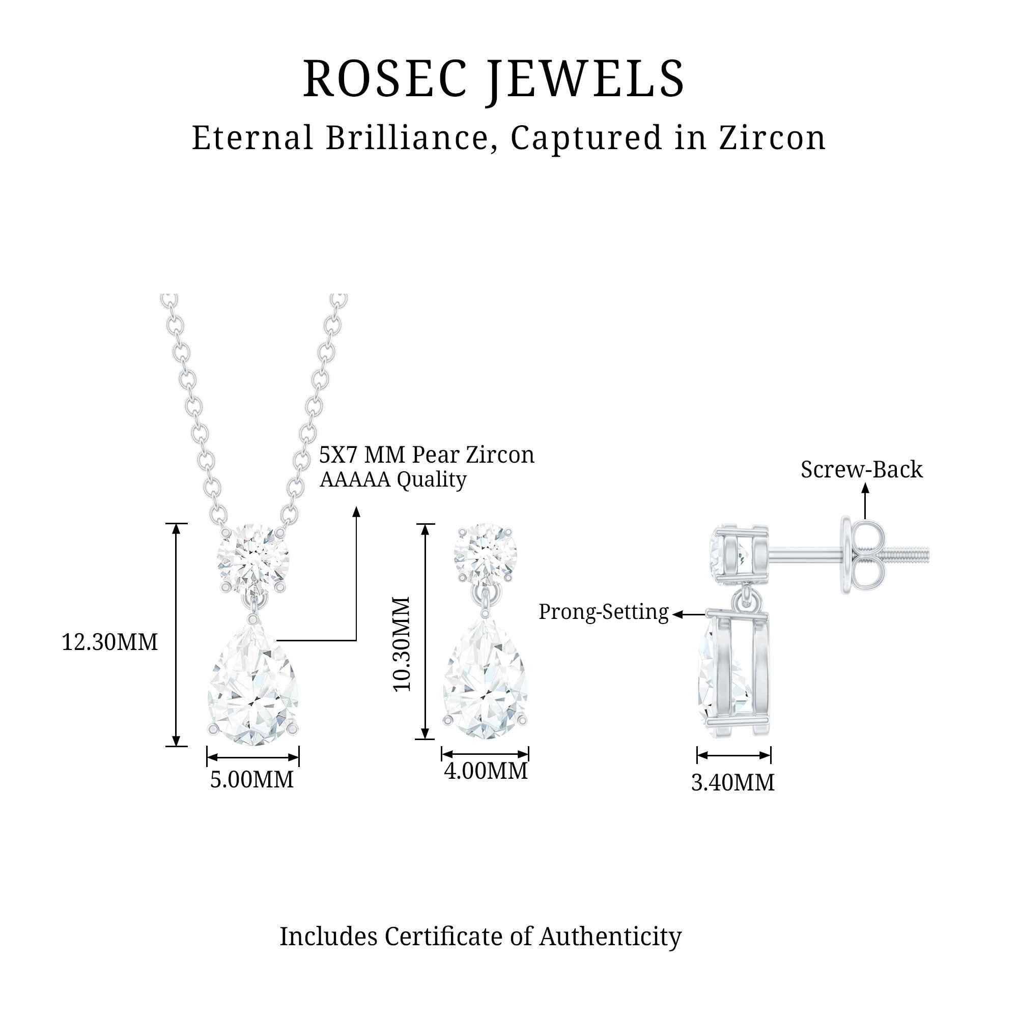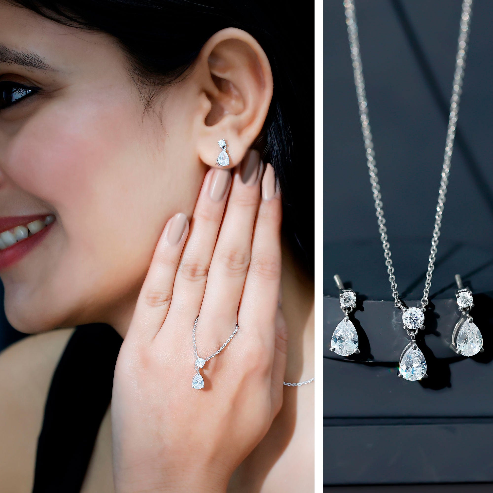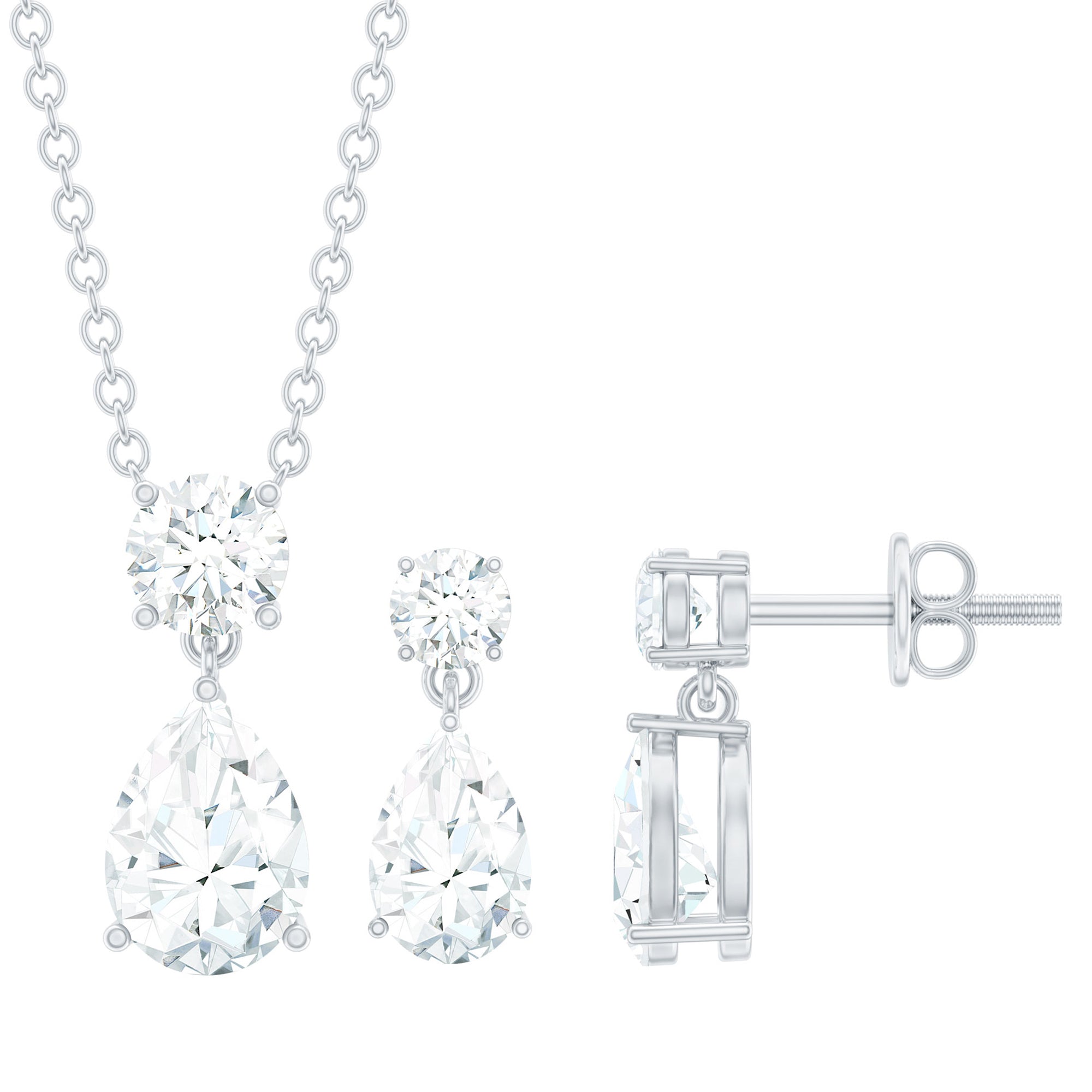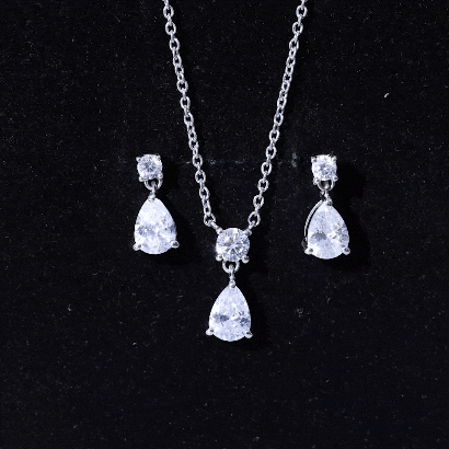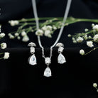 Make a stunning impression with this exquisite Drop Necklace and Earrings Set from Rosec Jewels. Adorned with dazzling Cubic Zirconia in a pear shape, elegantly suspended from sparkling round cut CZ studs, this set combines contemporary design with a touch of timeless elegance. Its medium sized silhouette makes it a beloved choice for brides and bridesmaids alike. The adjustable chain with radiant zirconia pendant, while the teardrop earrings with secure screw backs are perfect for elevating a night out or adding a dash of sparkle to a business outfit or festive dresses. Crafted with comfort and modern aesthetics in mind, this Teardrop Jewelry Set is designed to impress. Treat yourself or a loved one to this stunning piece that offers the luxurious look of diamonds without the hefty price tag. The exceptional craftsmanship and artistry ensure that the drop style is not only effortless but also stylish, making it ideal for enhancing bridal elegance. Handcrafted in 14k white gold plated sterling silver, this Wedding Necklace Set promises to bring a brilliant shine to any outfit.