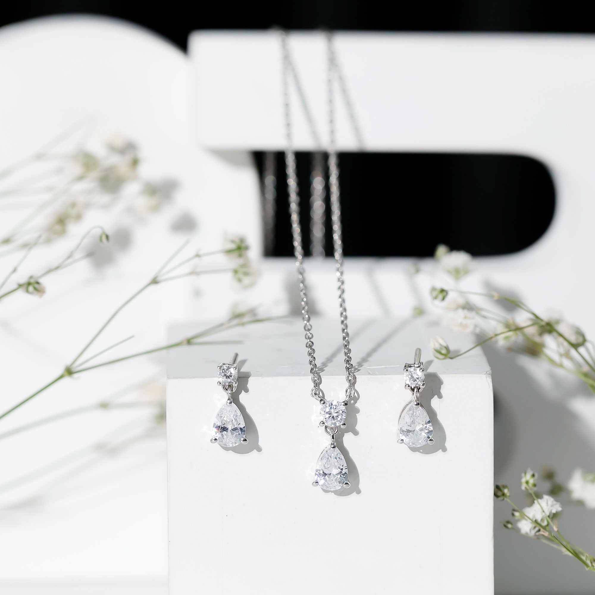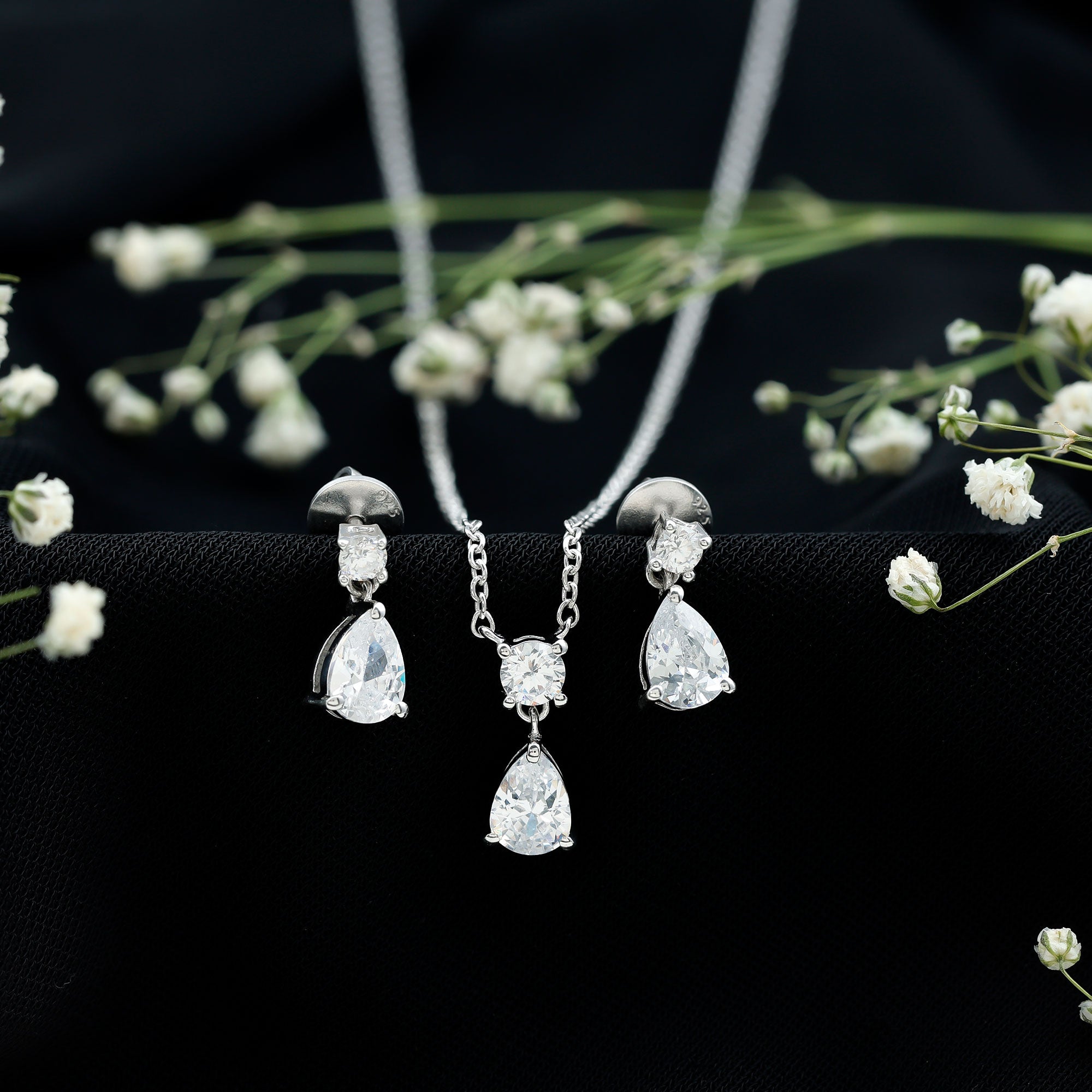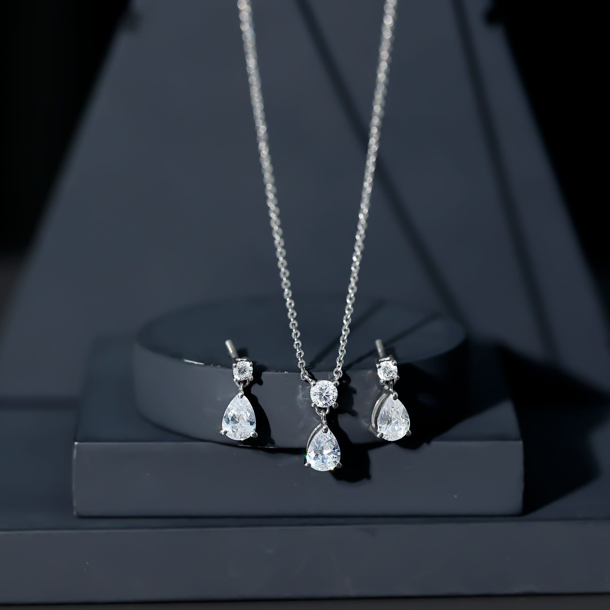 Make a stunning impression with this exquisite Drop Necklace and Earrings Set from Rosec Jewels. Adorned with dazzling Cubic Zirconia in a pear shape, elegantly suspended from sparkling round cut CZ studs, this set combines contemporary design with a touch of timeless elegance. Its medium sized silhouette makes it a beloved choice for brides and bridesmaids alike. The adjustable chain with radiant zirconia pendant, while the teardrop earrings with secure screw backs are perfect for elevating a night out or adding a dash of sparkle to a business outfit or festive dresses. Crafted with comfort and modern aesthetics in mind, this Teardrop Jewelry Set is designed to impress. Treat yourself or a loved one to this stunning piece that offers the luxurious look of diamonds without the hefty price tag. The exceptional craftsmanship and artistry ensure that the drop style is not only effortless but also stylish, making it ideal for enhancing bridal elegance. Handcrafted in 14k white gold plated sterling silver, this Wedding Necklace Set promises to bring a brilliant shine to any outfit.