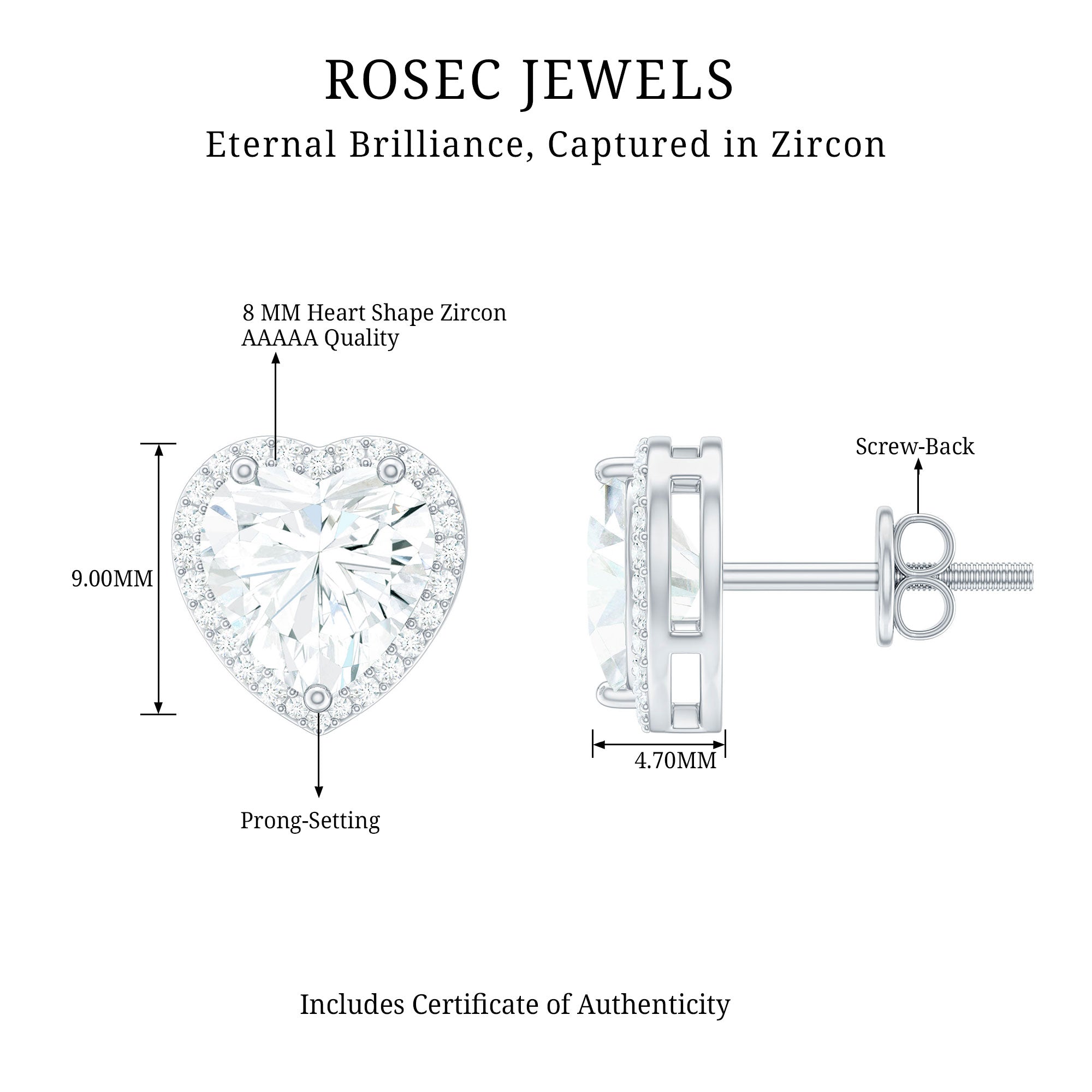 Looking for a present to surprise your lady, weve got your back with these CZ Heart Stud Earrings, crafted with 14K White Gold Plated Silver. These studs feature an 8 MM Heart Shape Zirconia secured in Prong Setting and surrounded with a Halo of smaller stones. These Solitaire Earrings dazzle with the classic shine of AAAAA Quality Cubic Zirconia which makes it perfect to complete the special day look. These Halo Earrings have a screw back closure which keeps them on place throughout the day.