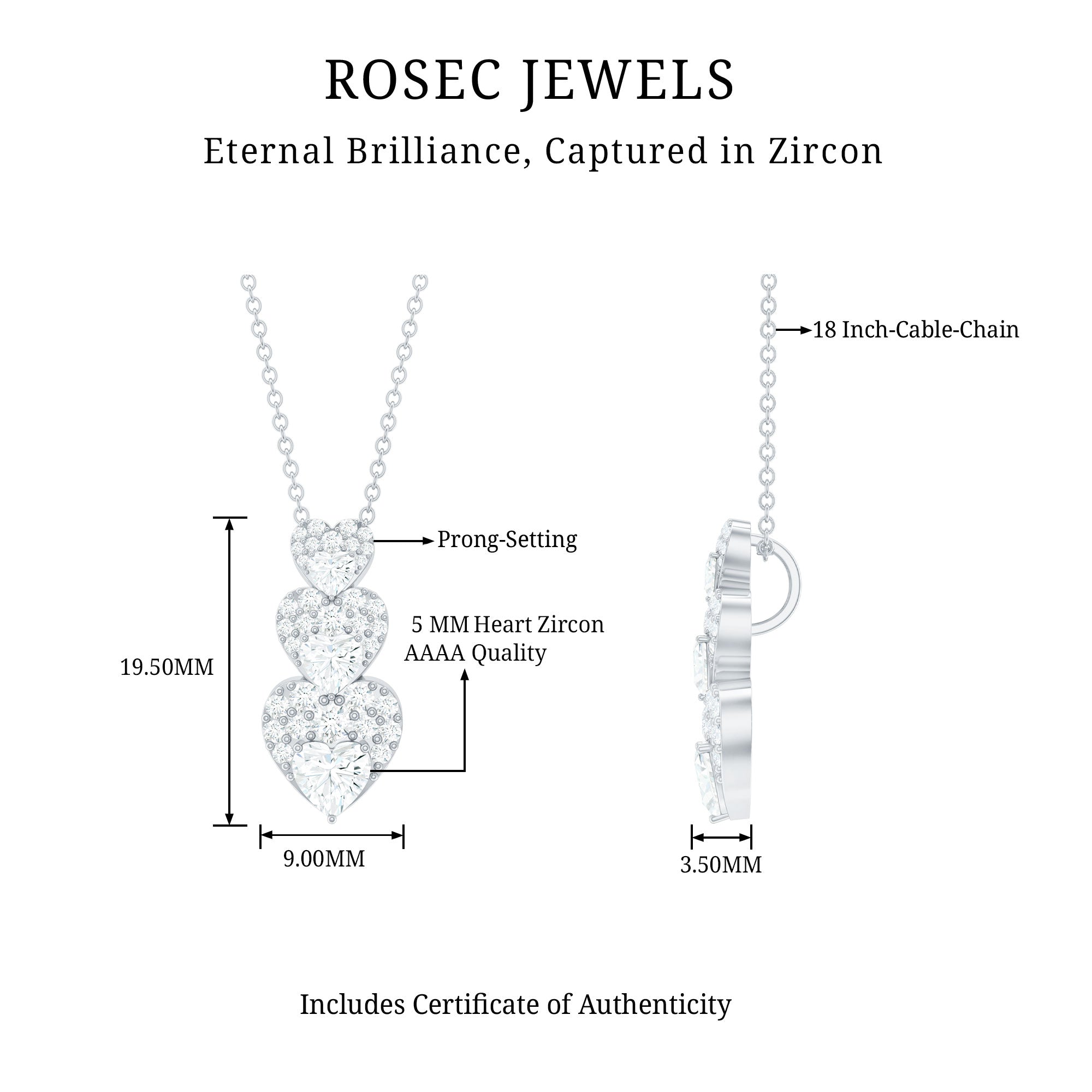 Our classic Heart Pendant Necklace will give perfect finishing touch to your dream bridal look. This elegant Dangle Necklace features three stacked heart motifs adorned with heart and round shape AAAA quality cubic zirconia. The hidden bail ensures a seamless and elegant look, allowing the Zirconia Pendant to dangle beautifully and move with every step. The timeless design and superior craftsmanship make this Bridal Pendant an excellent choice for any woman who loves classic and sophisticated jewelry. It also makes a perfect gift for a loved one or a special occasion.