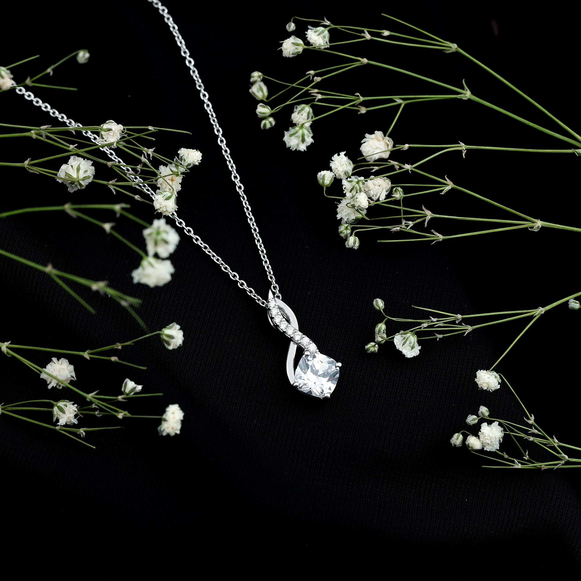 Dazzle with this CZ Pendant Necklace, handcrafted with 14K White Gold Plated Silver. This Designer Pendant features an infinity frame partially studded with smaller stones, and at the center, a 7 MM Cushion Cut Zircon of AAAAA Quality securely placed in Prong Setting. The Infinity Pendant dangles with the sturdy cable chain, which makes it beautifully sit on the neckline. This Cubic Zirconia Pendant can be a thoughtful gift for your lady love on occasions such as birthdays, anniversaries, or graduation. The pendant will be delivered to you in a signature packaging, keeping it safe and secure along with a certificate of authenticity.