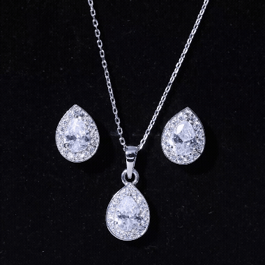 This CZ Jewelry Set is all you want to dazzle every day. The Earrings Necklace Set features a pendant with chain and a pair of stud earrings handcrafted with white gold plated silver. The pendant features a 5X7 MM Pear Shape Zircon encircled by a Halo of smaller stones, securely placed in Prong Setting and dangles in a sturdy cable chain. The earrings feature a 5X7 MM Zirconia surrounded by petite gemstones, enhancing the grace of the cartilage. This Necklace and Earring Set can be styled with formal looks or for cocktail parties. This Classic Jewelry Set will be delivered to you in a premium packaging with the certificate of authenticity.