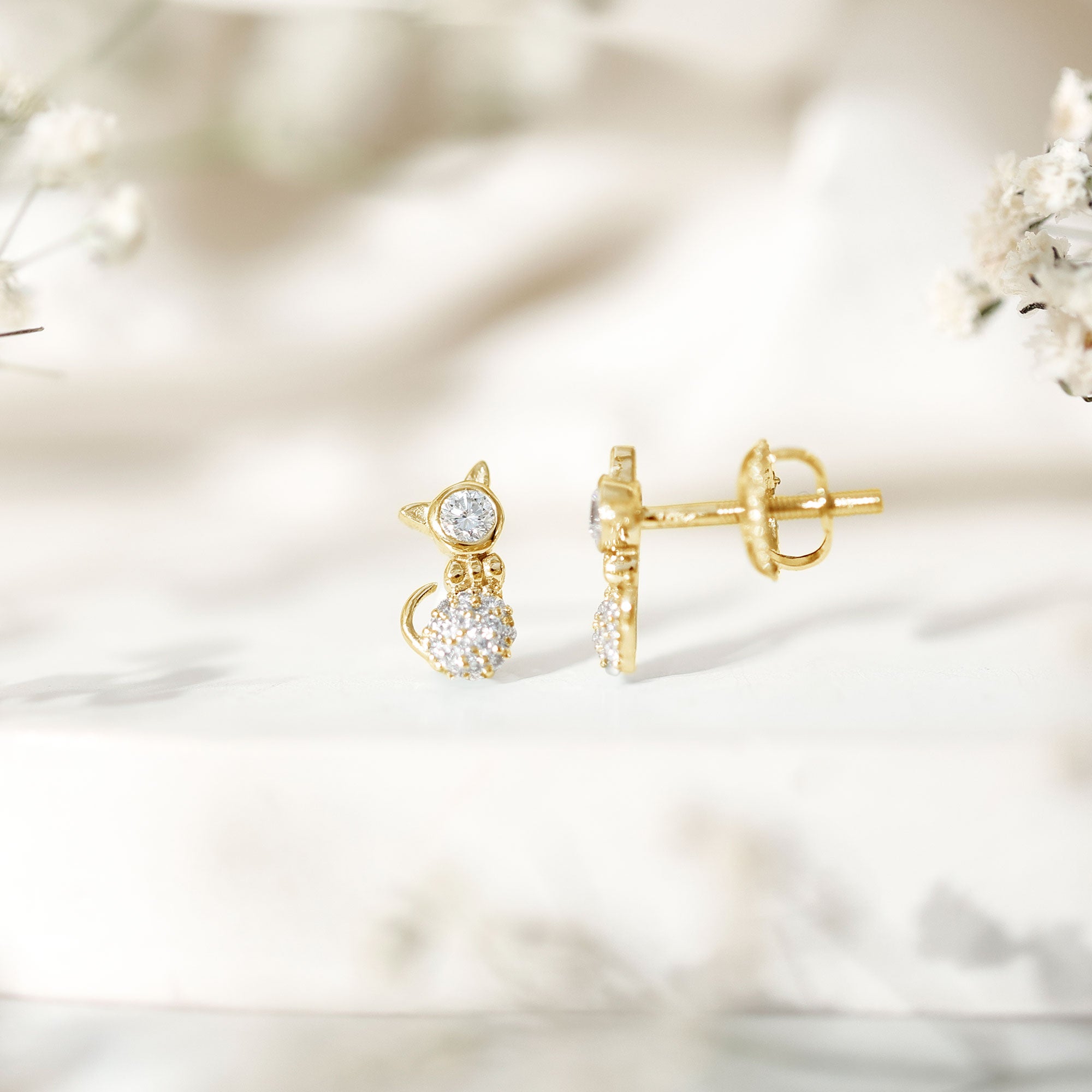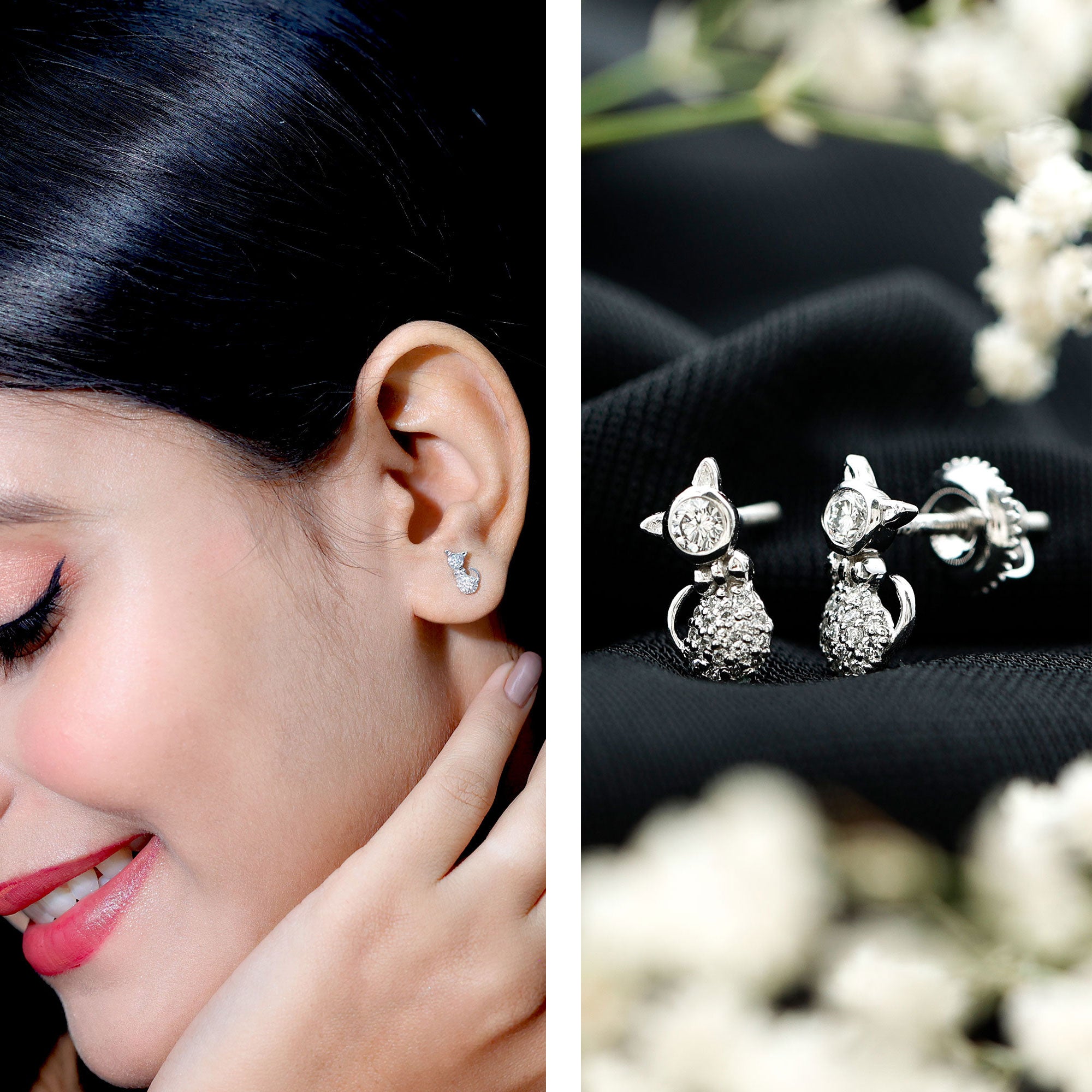 Express your unique style and natural charm with these astonishing Diamond Stud Earrings, bringing the inner kitty in you. Crafted with care and attention to detail, these Cute Cat Earrings are embellished with Round Diamond as Bezel Setting, scintillating the face. Next is the bow, highlighted with metal and to make it more attractive, are the Round brilliant cut Diamond Cluster sitting on the lower body, making it look beautiful. Secured with Screw back closures, these Kitty Studs are perfect for a die-hard cat lover or just because who likes cute designs. So, unleash your inner feline with these adorable Cat Stud Earrings, perfect for adding a touch of whimsy to your outfits. They are a statement of your love and a celebration of feline playful spirit. These Hello Kitty Stud Earrings effortlessly blend feline affection with timeless style, making them perfect for special occasions. They are perfect for treating a cute present for a cat-loving friend or to express your affection for our furry companions. As a testament to artistry and a delightful expression of feline admiration, these Earrings are designed to make a statement and spark conversation wherever you go.