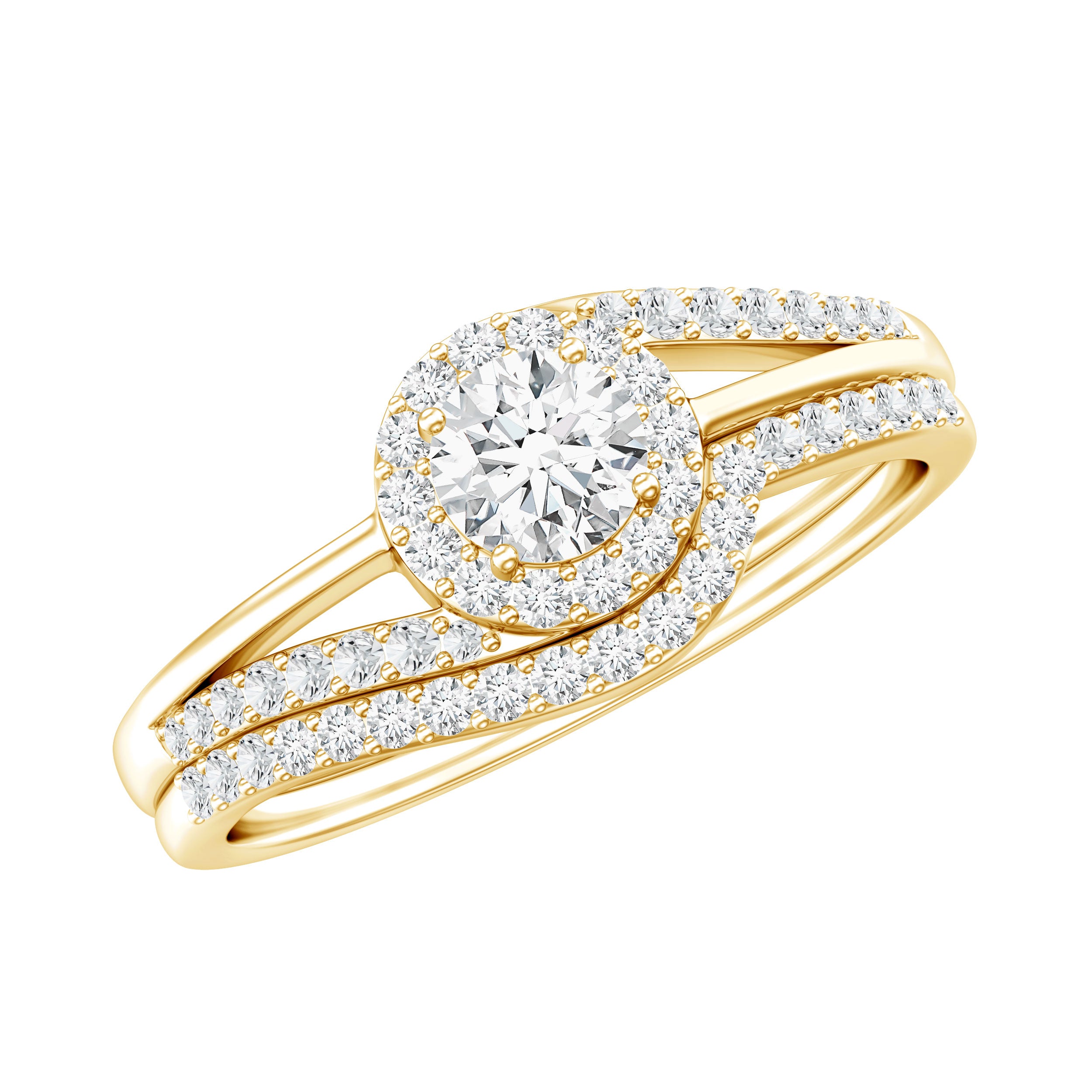 - Coordinated bridal set: engagement ring and matching wedding band.
