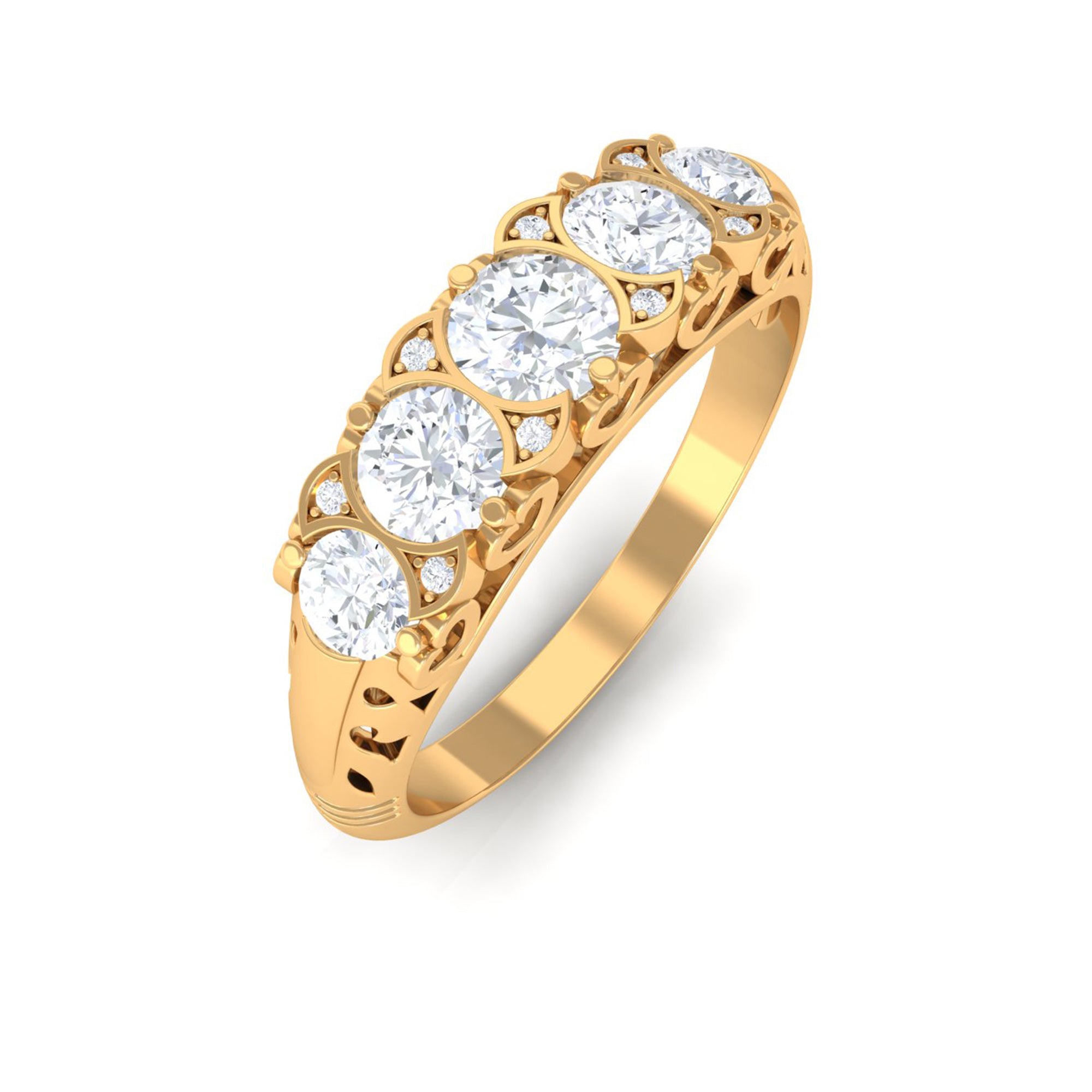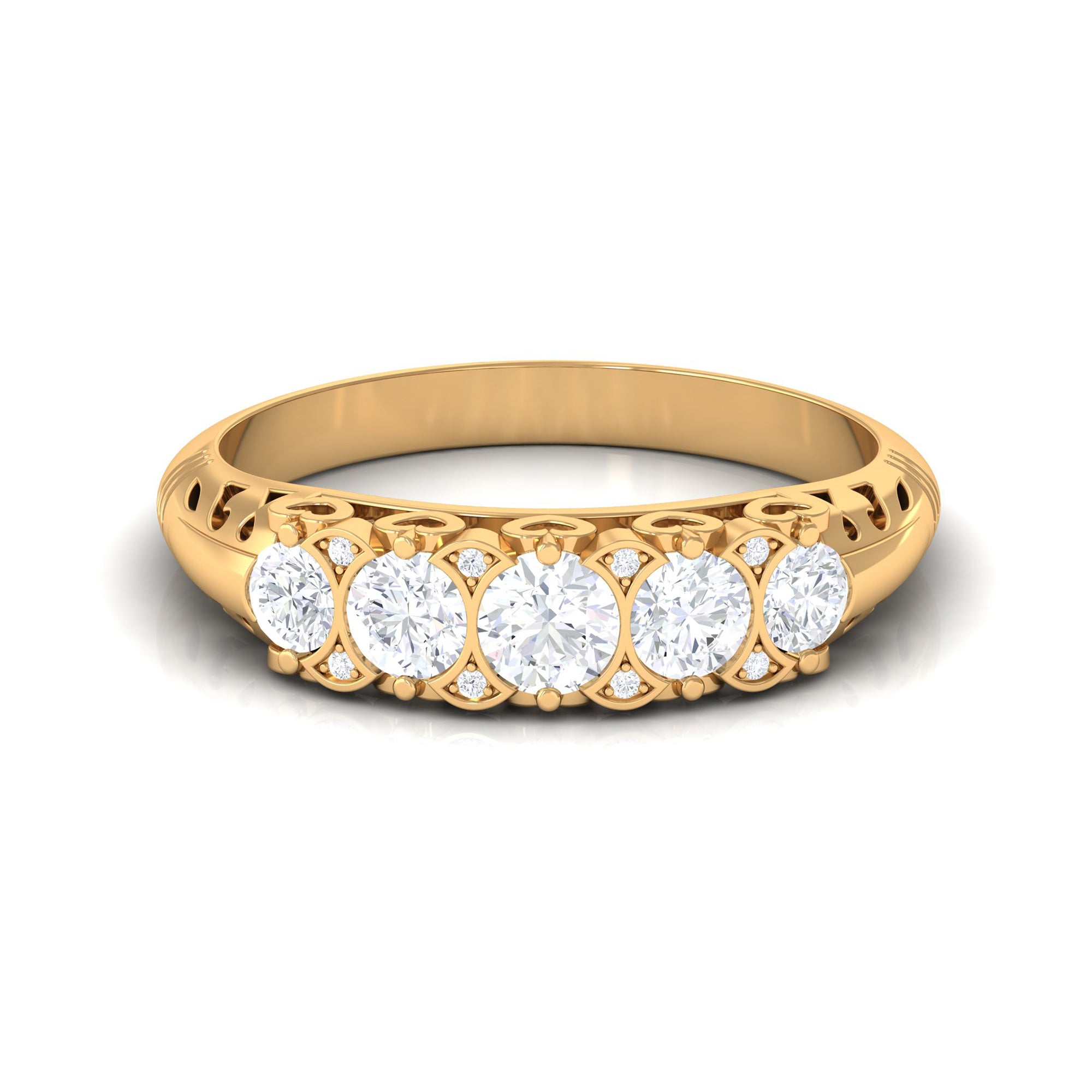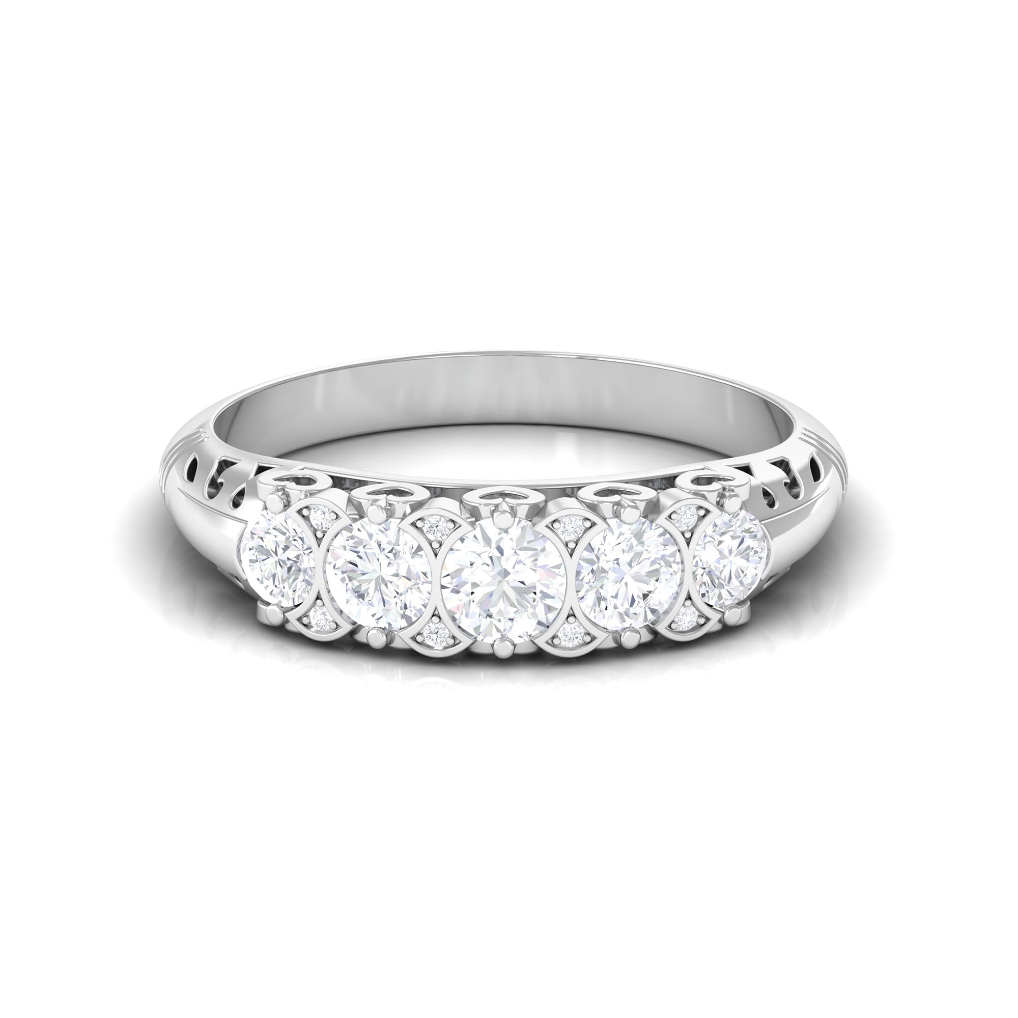 Celebrate your love with this dazzling certified Diamond Five Stone Anniversary Ring. The ring features a 4 MM round Diamond center stone along with small sparkling Diamonds, encased in a row. The five sparkling Diamonds represent the five years of love and happiness you have shared together. This ring is the perfect way to show your spouse how much you care.