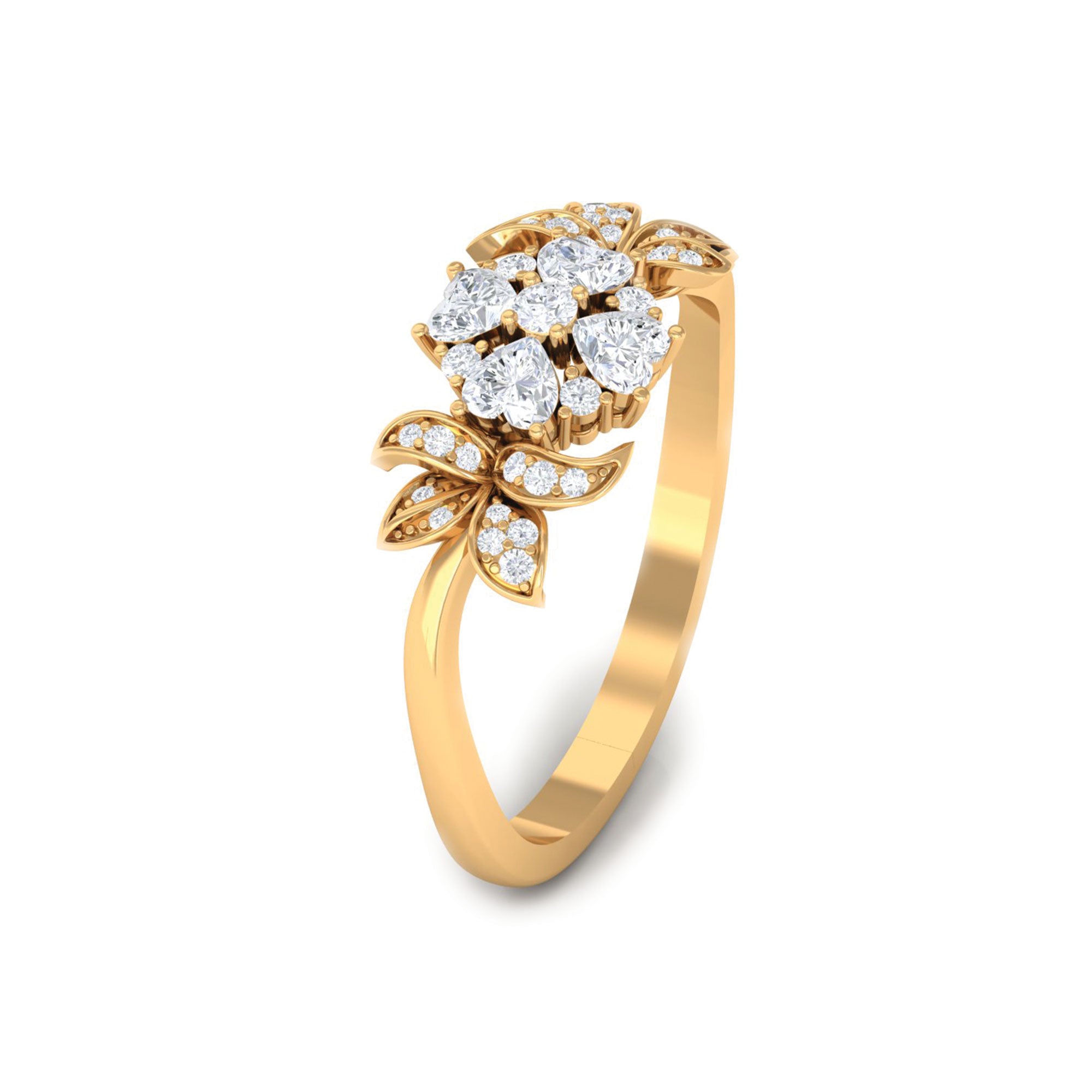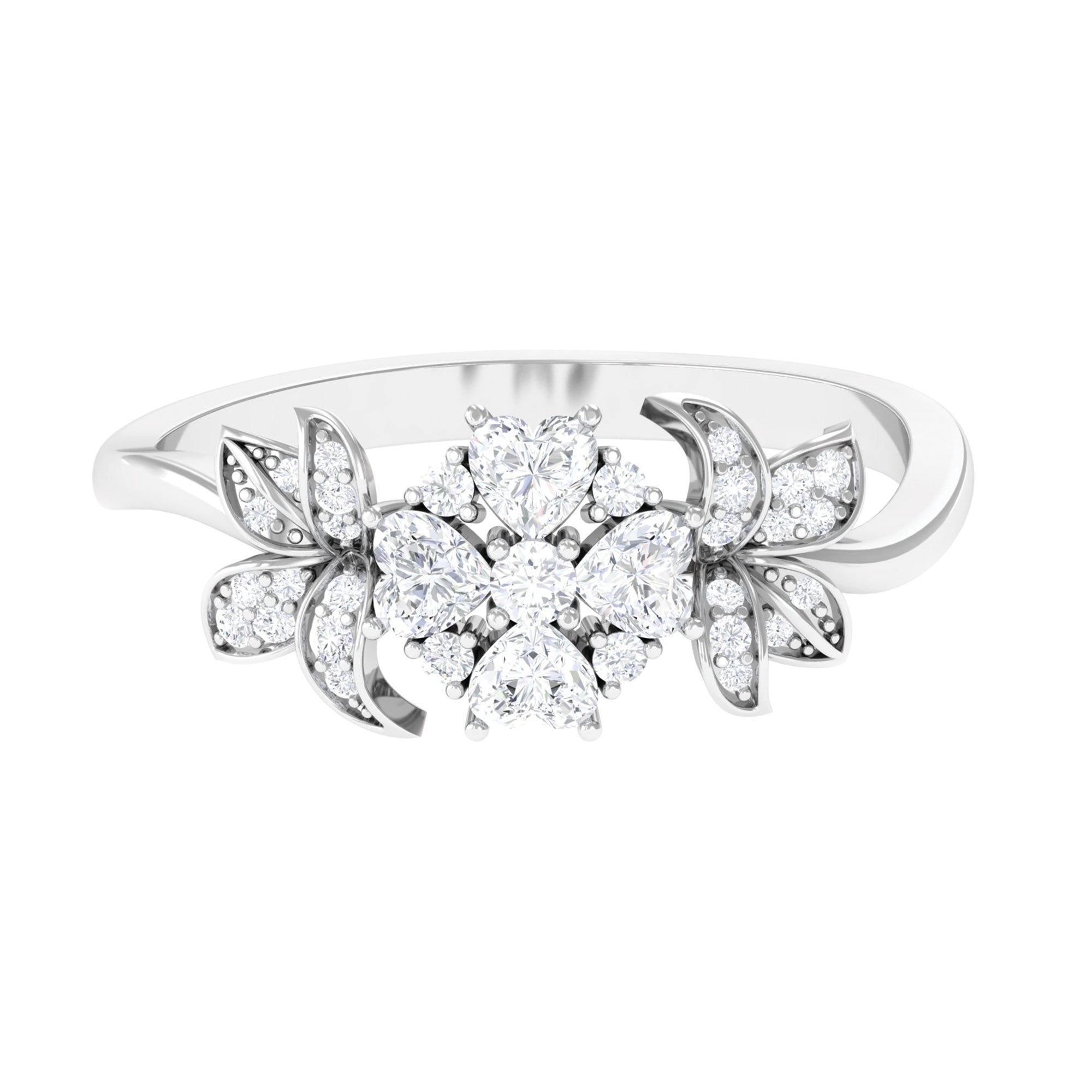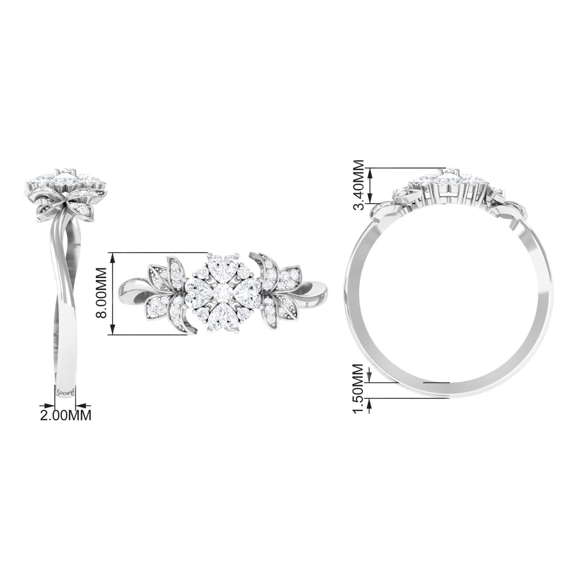 A lady can never say no to jewelry, so listen to yes while presenting this beautiful Diamond Flower Ring. It is embellished with Round and Heart Shape Diamonds in Prong Setting, giving this ring a floral appearance with its nature-inspired aesthetics, with intricate design and elaborate design, making it a perfect one for your special occasions. The sides are adorned with leaves framed with Round brilliant cut Diamond. Having symbolism and appreciation, this Flower Engagement Ring has symbolism and beauty that make it a stylish piece of jewelry, having incredible sparkle. Speaking to nature and beauty, this Unique Engagement Ring has the allure of floral design, drawing inspiration from the beauty of nature and incorporating intricate design, much like resembling a flower. This one-of-a-kind Diamond Engagement Ring incorporates meaningful details that echo a shared memory. The beautiful modern aesthetics embody the world beautifully.