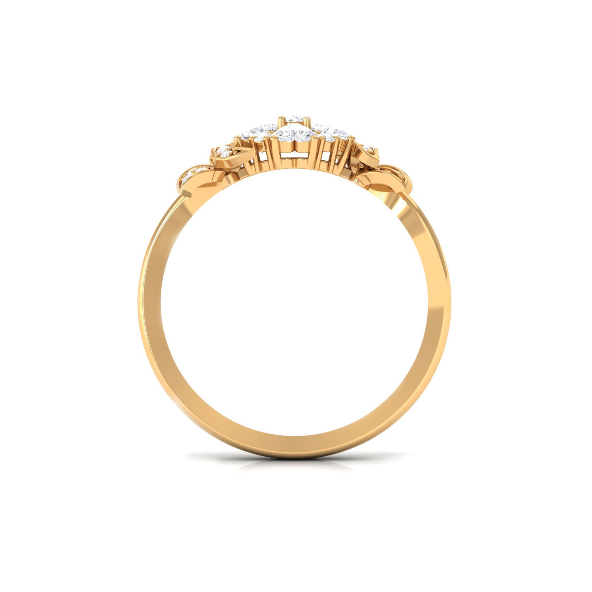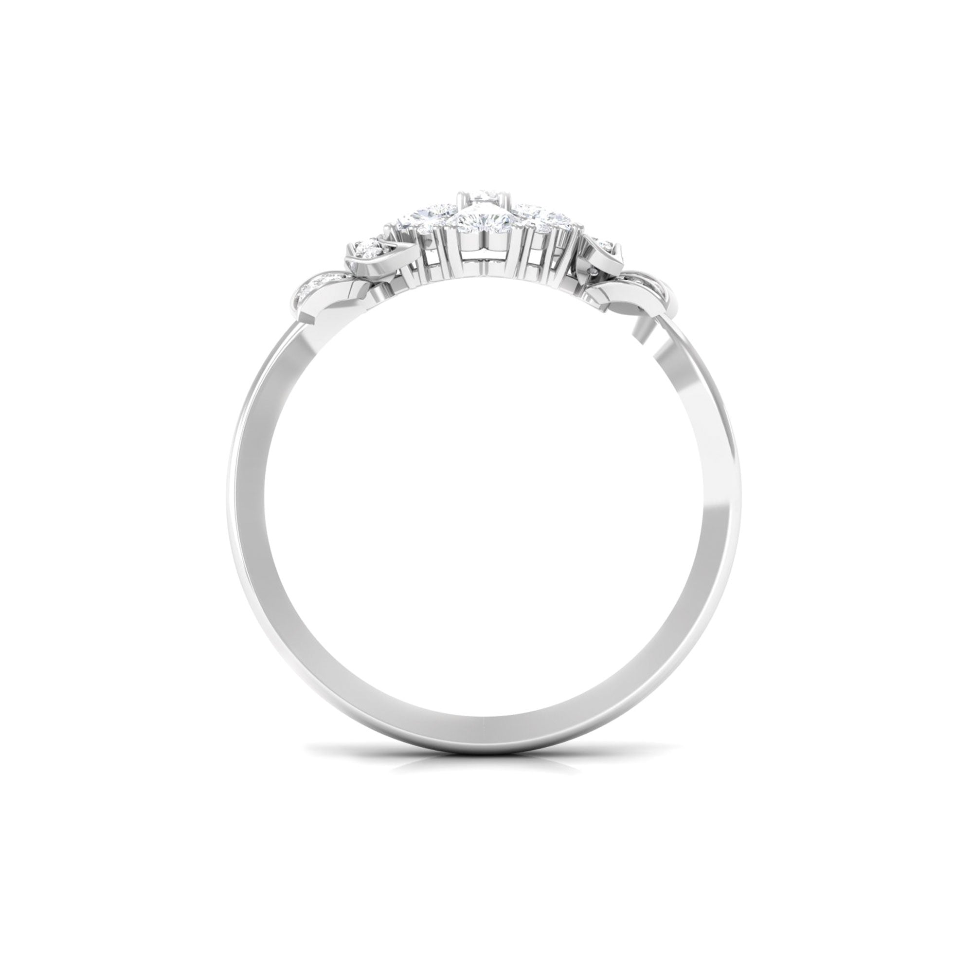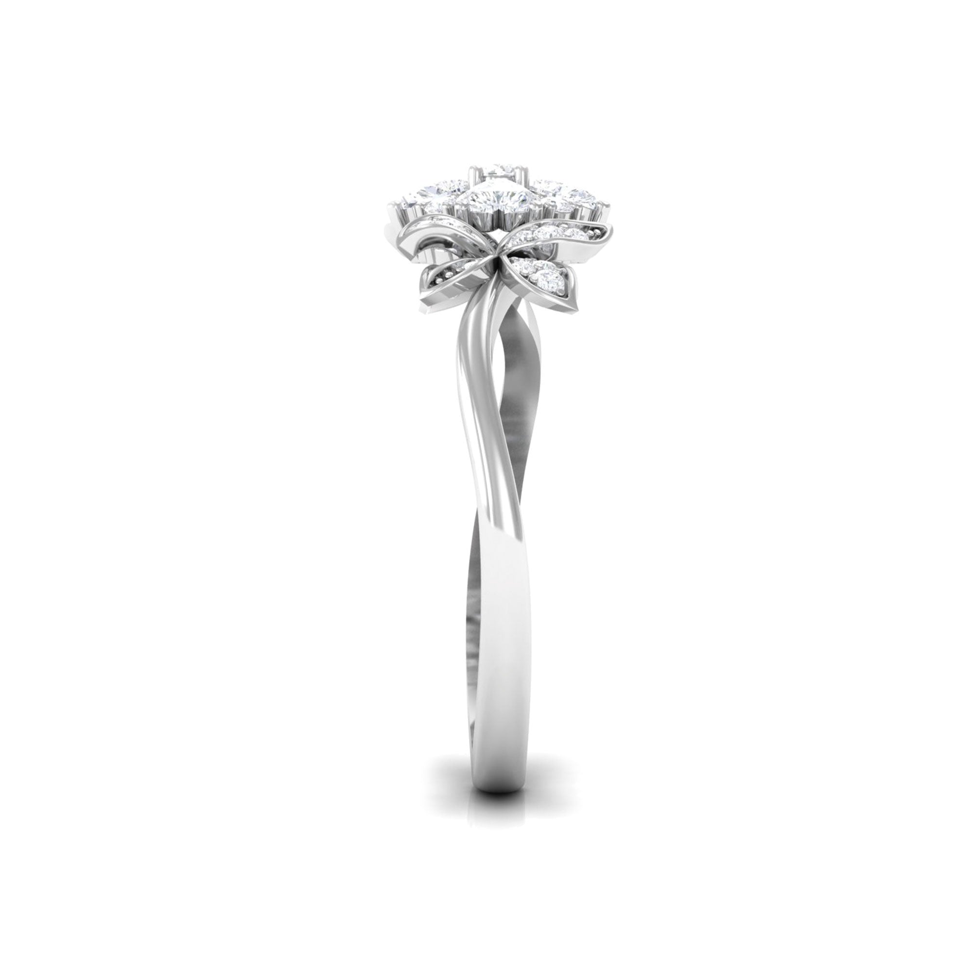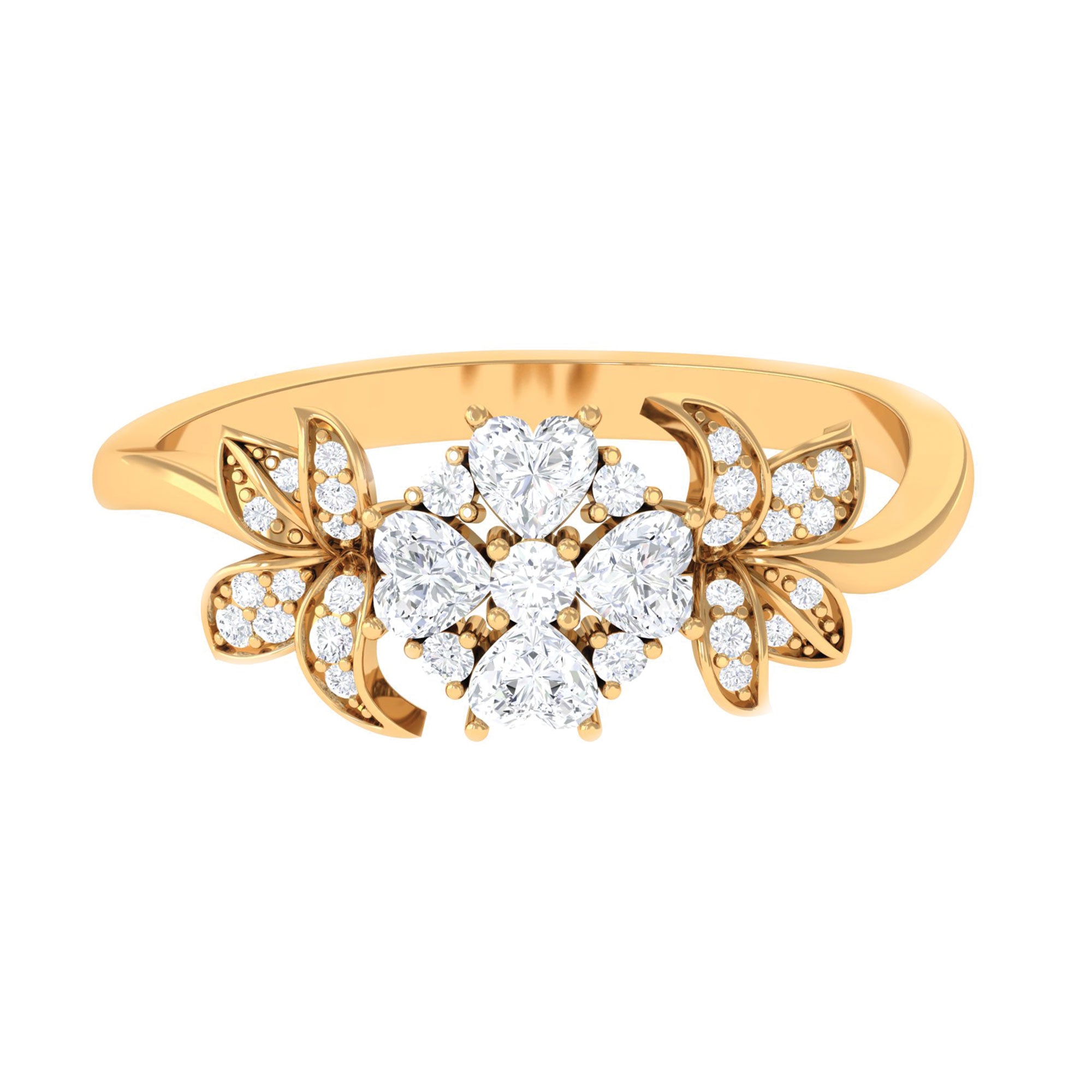 A lady can never say no to jewelry, so listen to yes while presenting this beautiful Diamond Flower Ring. It is embellished with Round and Heart Shape Diamonds in Prong Setting, giving this ring a floral appearance with its nature-inspired aesthetics, with intricate design and elaborate design, making it a perfect one for your special occasions. The sides are adorned with leaves framed with Round brilliant cut Diamond. Having symbolism and appreciation, this Flower Engagement Ring has symbolism and beauty that make it a stylish piece of jewelry, having incredible sparkle. Speaking to nature and beauty, this Unique Engagement Ring has the allure of floral design, drawing inspiration from the beauty of nature and incorporating intricate design, much like resembling a flower. This one-of-a-kind Diamond Engagement Ring incorporates meaningful details that echo a shared memory. The beautiful modern aesthetics embody the world beautifully.