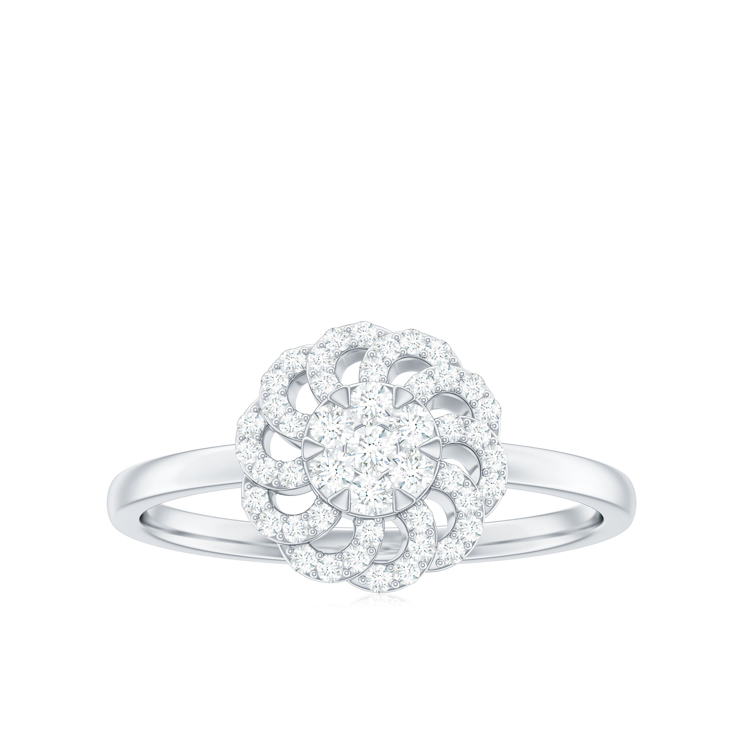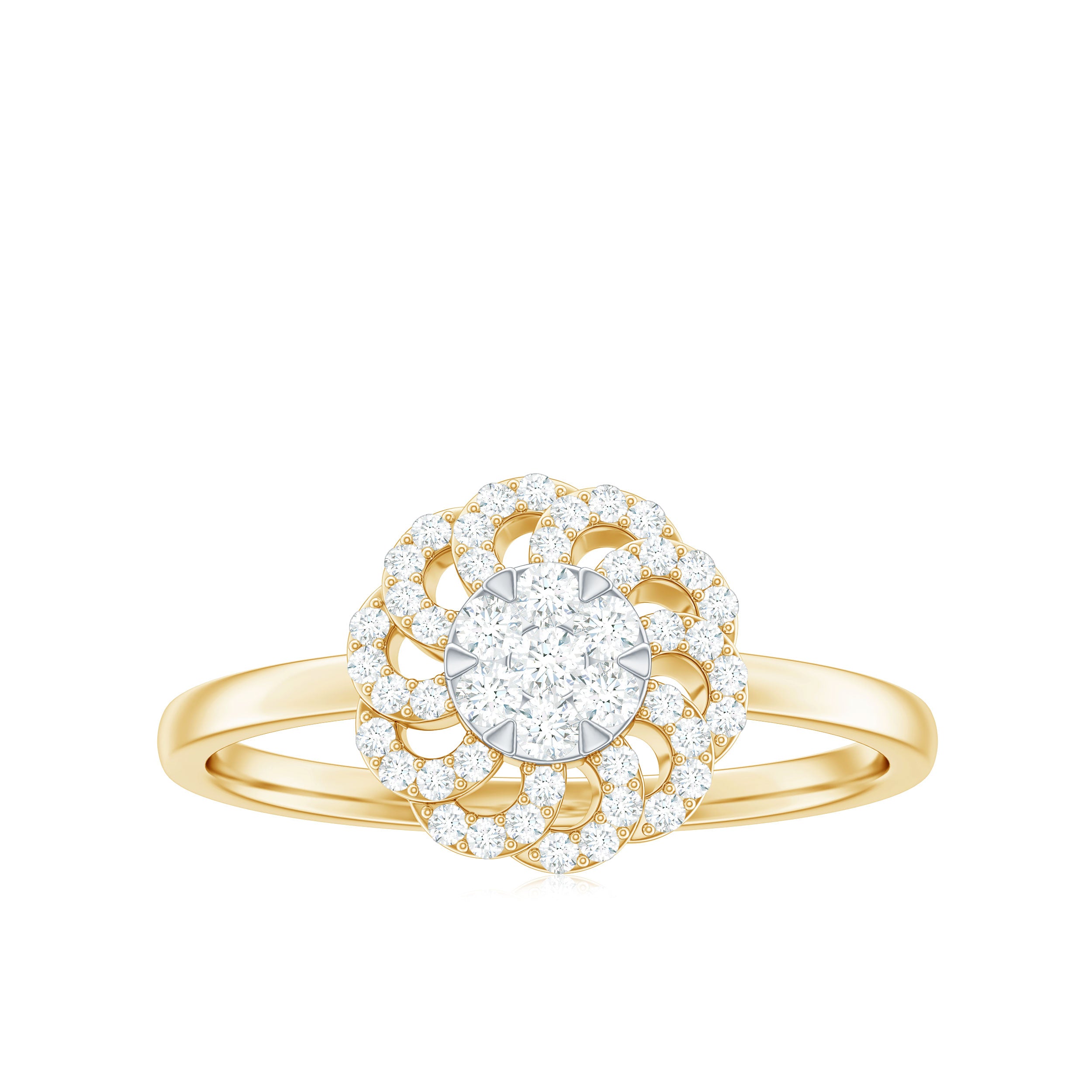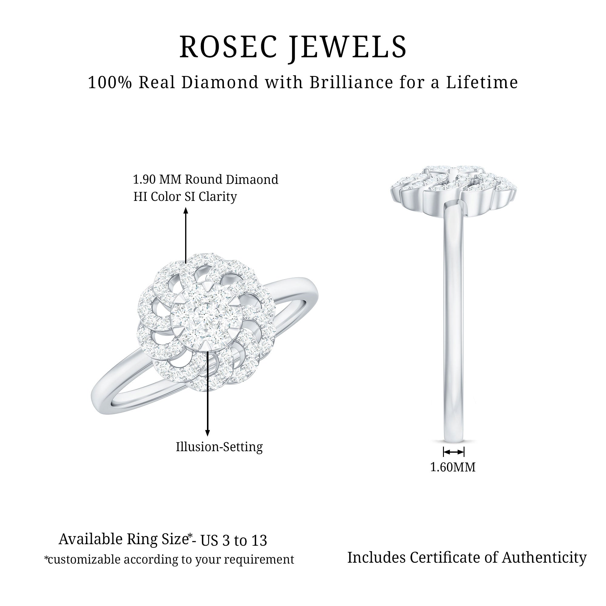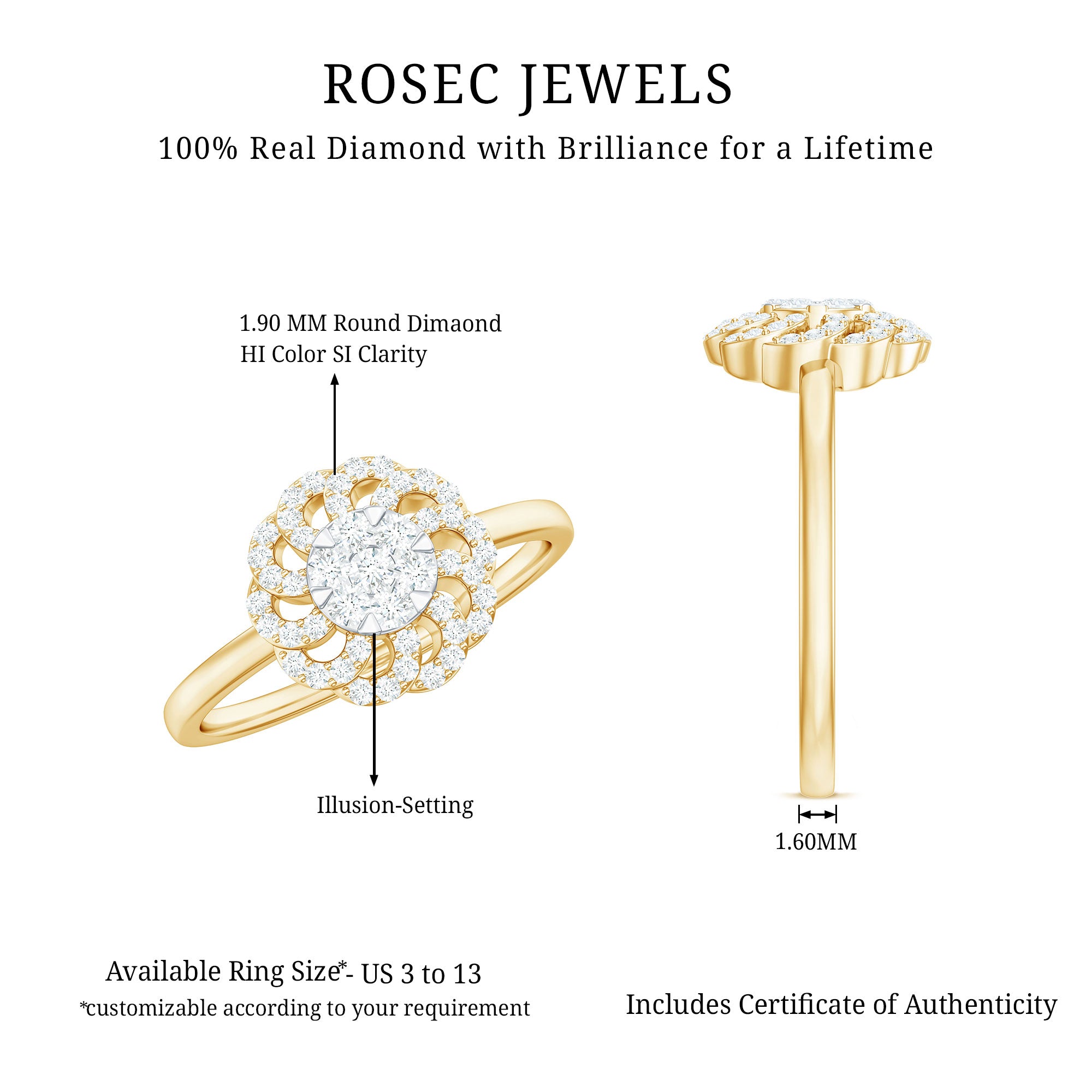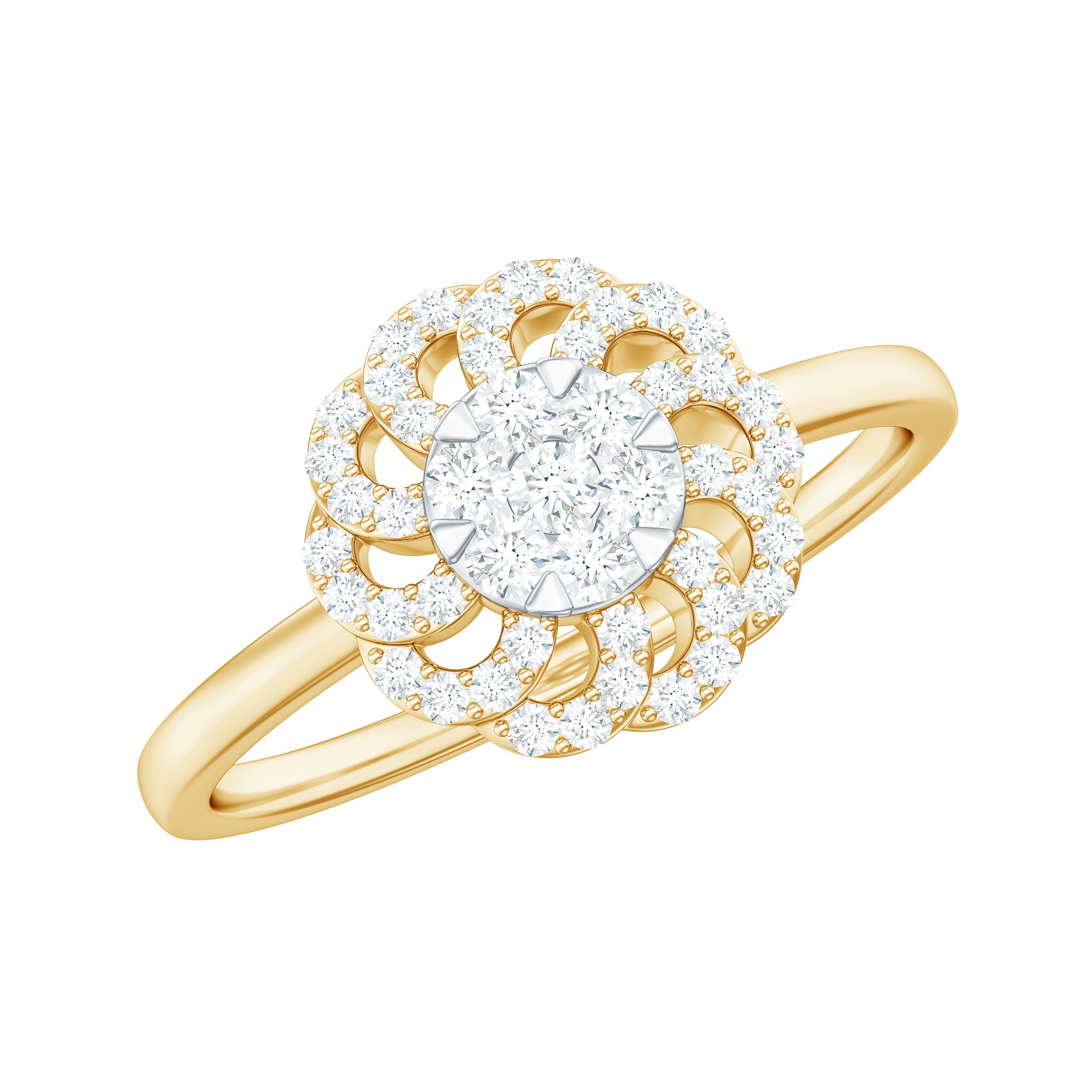 Bring romance into full bloom with this Diamond Engagement Ring that offers nature-inspired design, offering something to every kind of love story. As a natural beauty, this Flower Diamond Ring has a feminine look that looks perfect for nature lovers and romantics alike. Blooming with symbolism and new beginnings, this Flower Statement Ring mimics the beauty of nature, making it an ultimate dream come true. Classic and timeless, this Designer Engagement Ring embodies Round Shape Diamond in an Illusion Setting in the center. Mimicking the beautiful petals, they are also decorated with round brilliant cut Diamond that shines beautifully with delicate detailing and nature-inspired aesthetics. The unique shape of a Flower on the Floral Engagement Ring represents love and passion. It is a blend of elegance and earthiness that reflects the deeper connection to the natural world. Its incredible sparkle has distinct beauty and a call to beauty resembling a flower while appreciating beauty. A perfect classic and enduring charm!