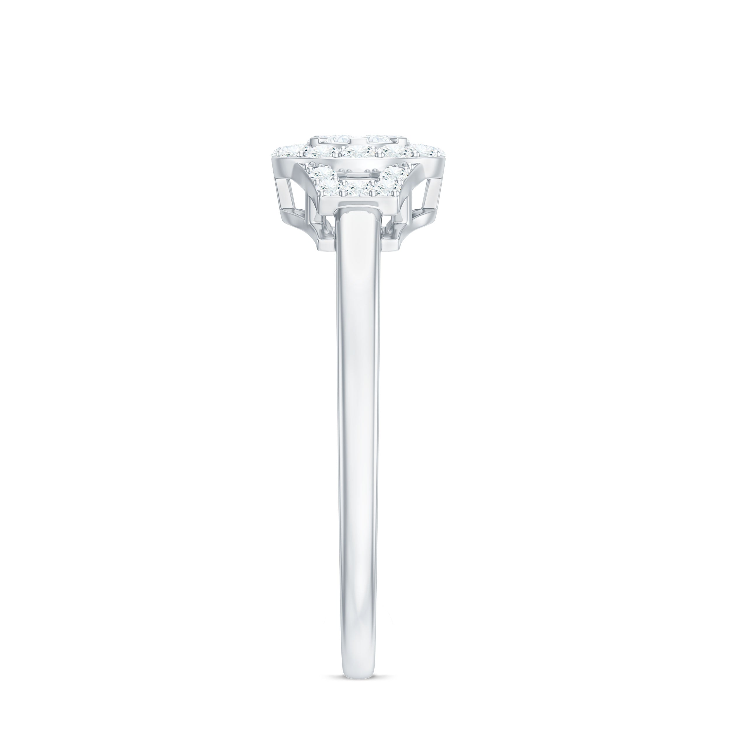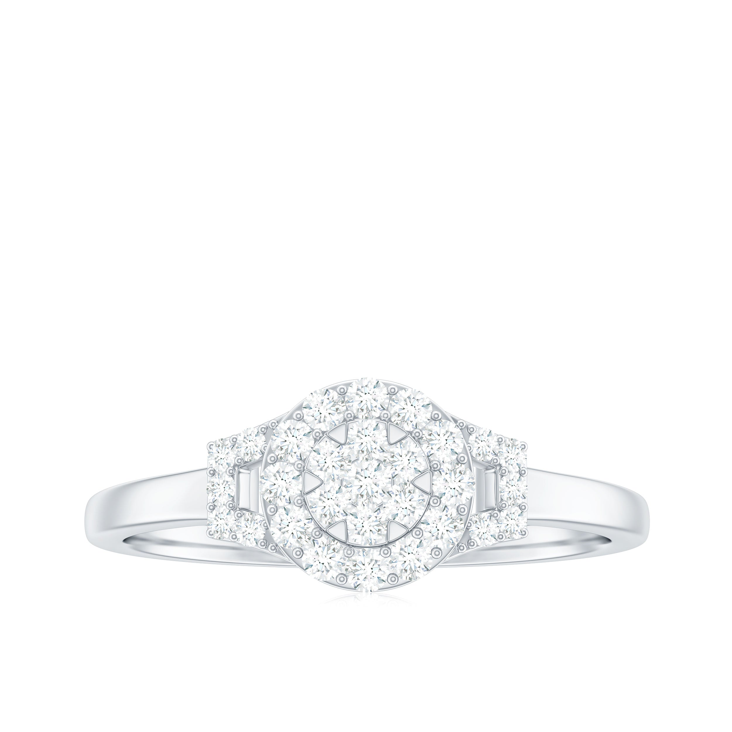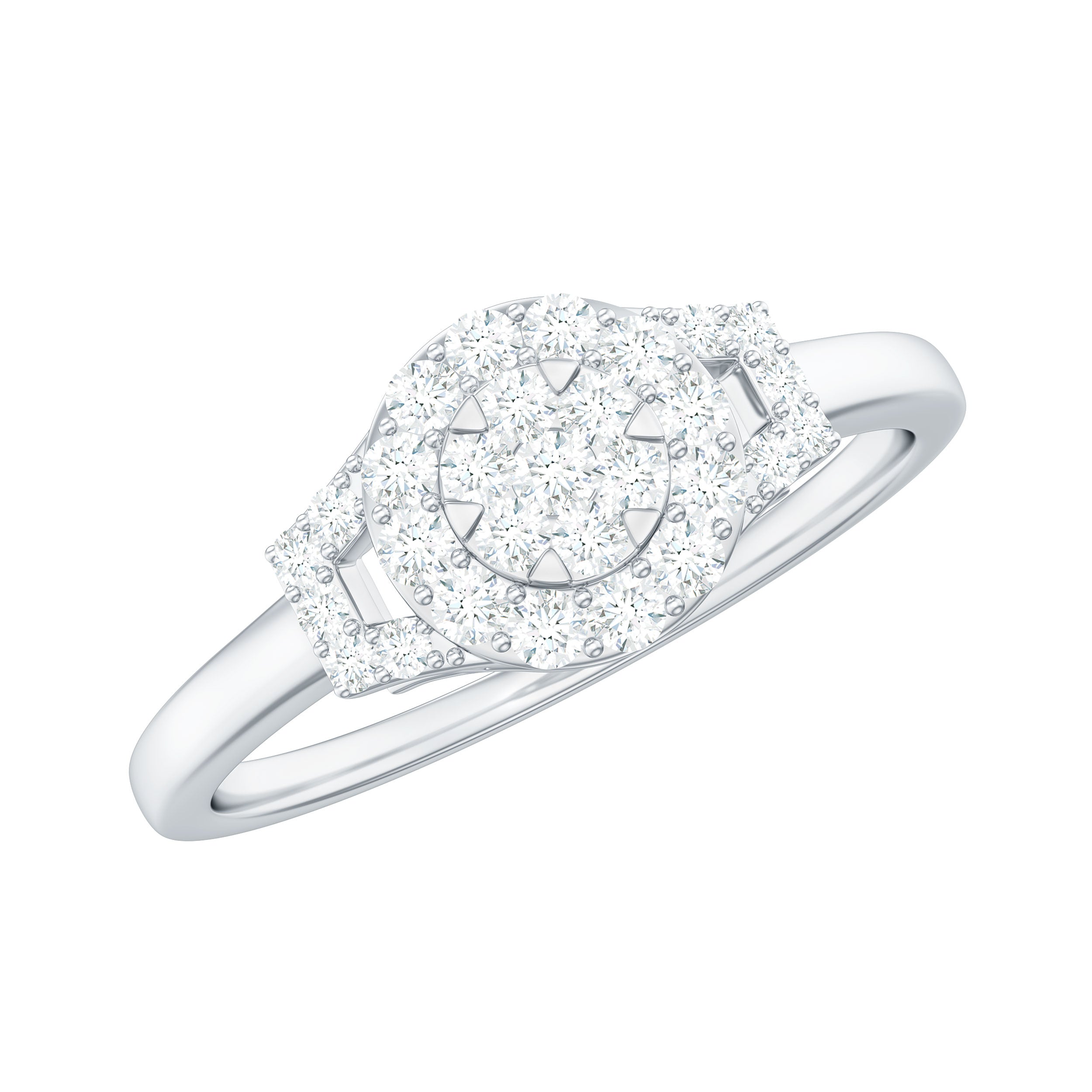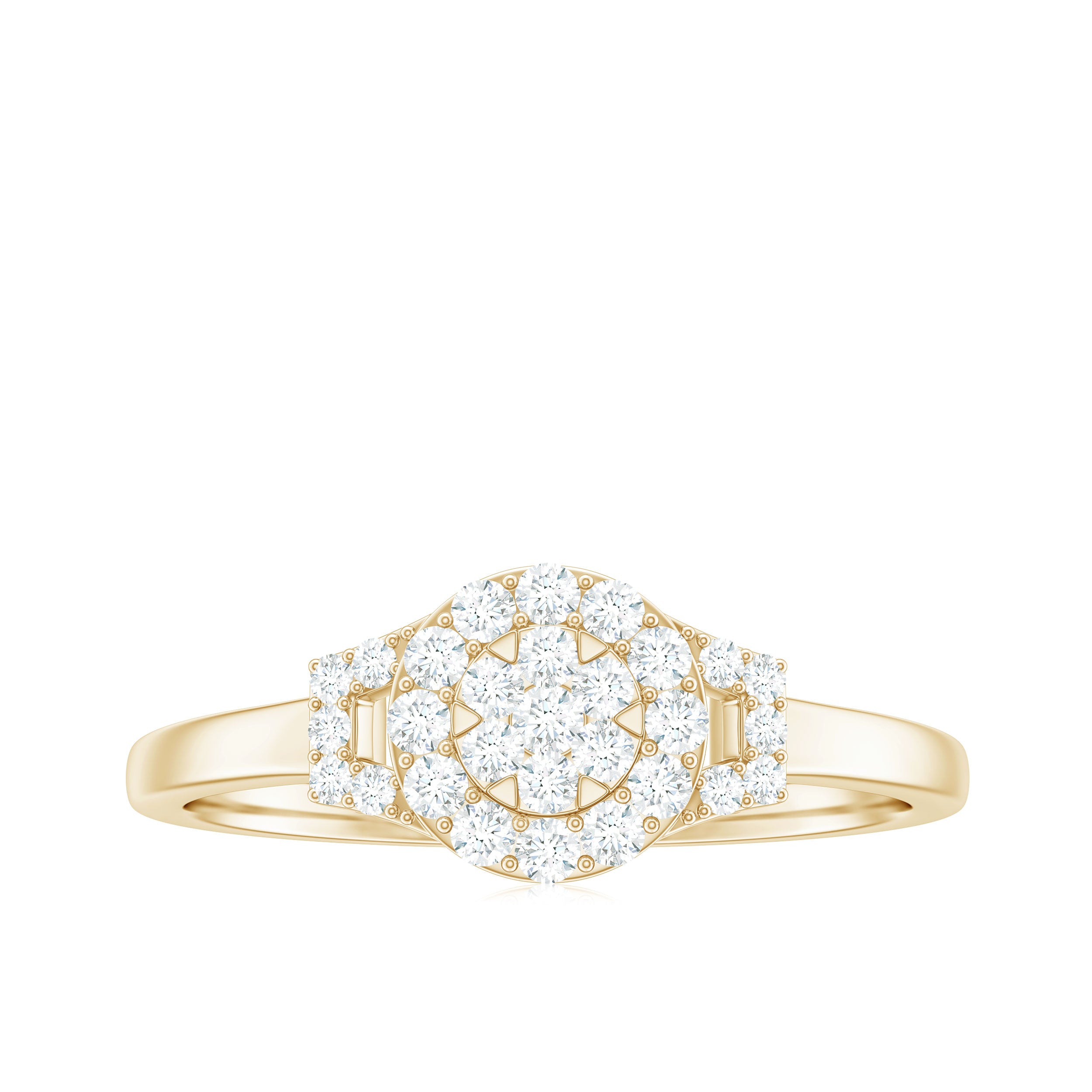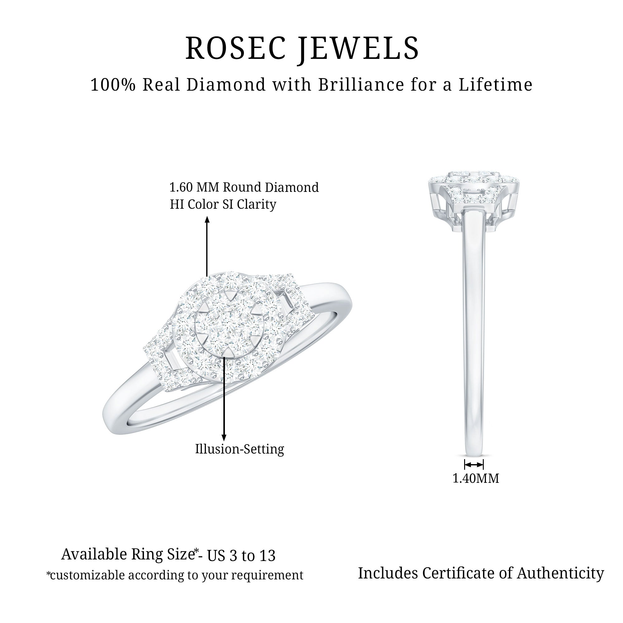 As a classic and trendy sense of style, this Diamond Engagement Ring is a radiant star that captures and holds just for her. As a timeless declaration into a breathtaking spectacle, this Engagement Ring is a declaration of love. Embodying classic elegance with a touch of magic, it is ready to illuminate your shared future. It is embellished with Round Shape Diamond in an Illusion Setting, along with a Halo of Accent. The unique and modern design on the sides is further accented with a Round brilliant cut Diamond. Experience the brilliance of ingenious design. This Cluster Engagement Ring offers exceptional beauty without compromise. As a testament to superior craftsmanship and intelligent design, it is a truly breathtaking display of fire and brilliance. Delivering incredible sparkle and undeniable presence, this Minimalist Diamond Ring commands attention, exquisite precision and the emotional connection that is crafted to radiate eternal love.