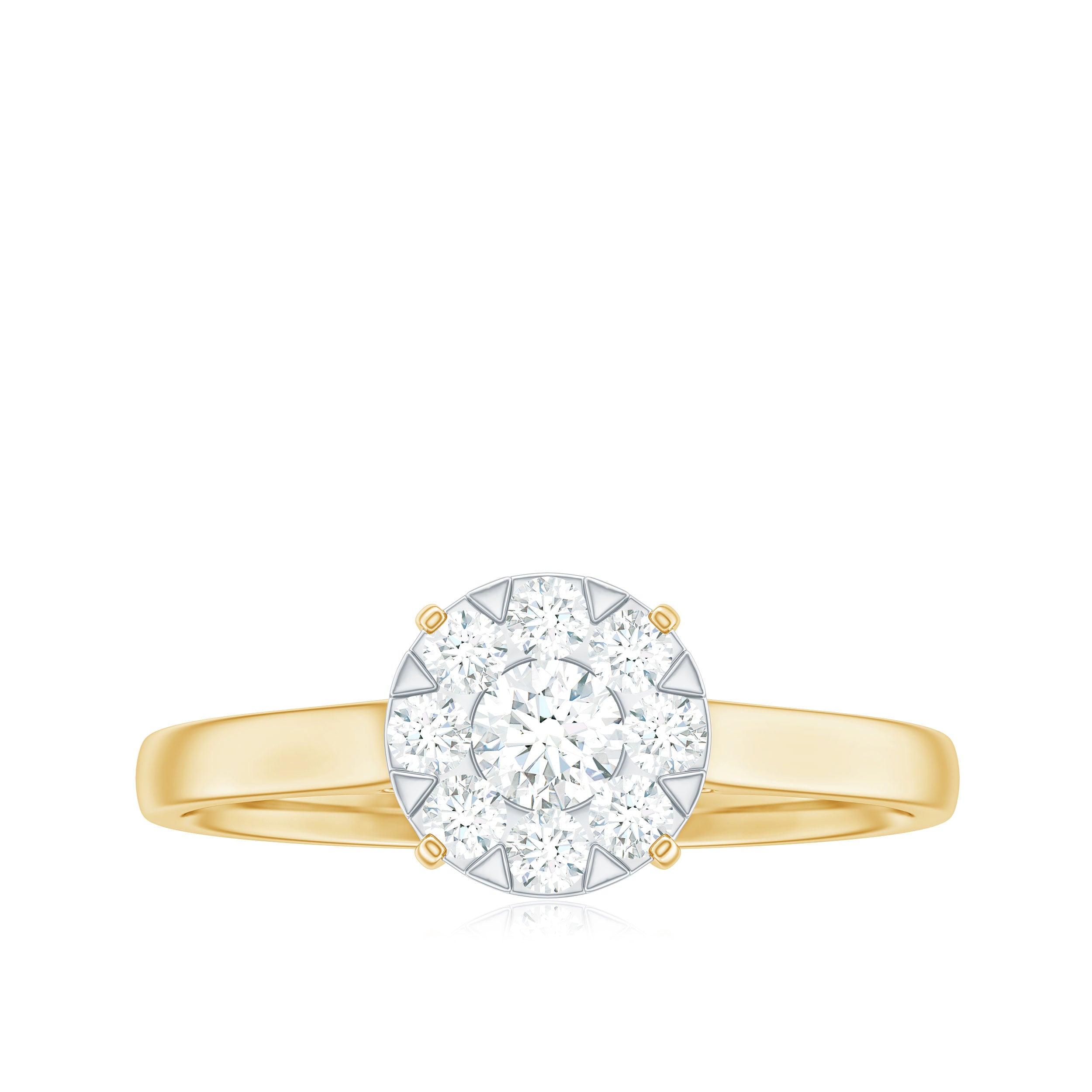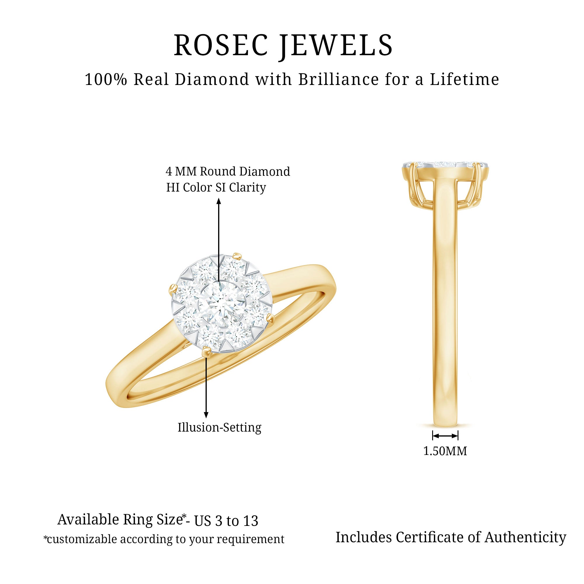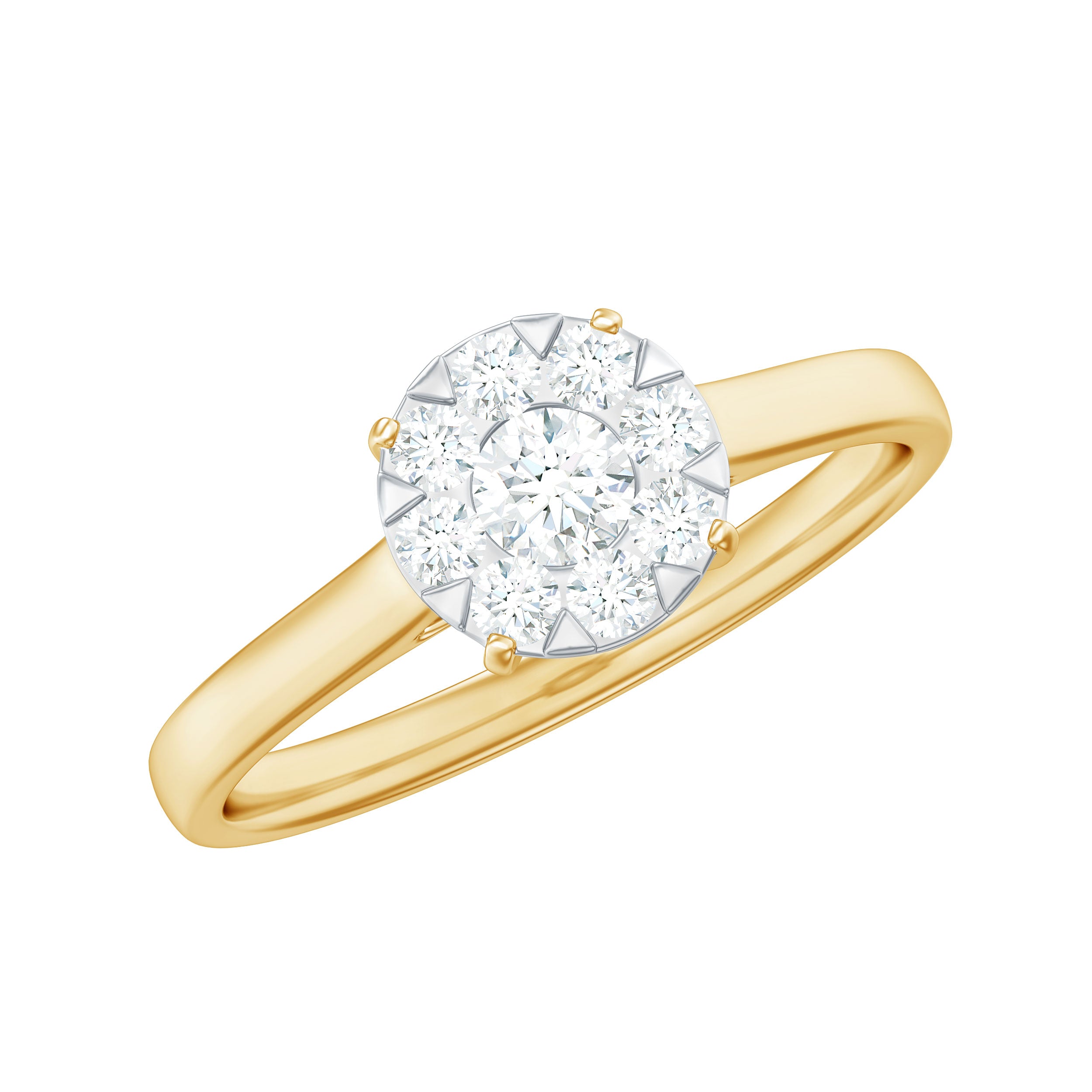 Blending sophistication with contemporary aesthetics, this Diamond Engagement Ring has a unique cluster style that incorporates sentimental heirloom gemstones. Amplifying centerpiece, this Ring is adorned with Round Shape Diamond in an Illusion Setting. Radiating uniqueness and timeless elegance, this Ring has brilliance with intricate design, which is a testament to craftsmanship and style. Capturing light from every angle, this Cluster Engagement Ring has an intricate pattern and striking appearance, which makes it a standout choice for the modern bride that blends tradition with individuality. The beautiful group of Diamonds symbolising unity and togetherness is a perfect metaphor for marriage. As a statement of love and timeless beauty, this Unique Engagement Ring symbolises your unique love story. As a mark for your special moment or as a cherished heirloom for generations, this Cluster Ring is a harmonious gathering of brilliance. Maximizing overall sparkle, the HI Color SI Clarity Diamond creates an optical illusion of a larger center gemstone.