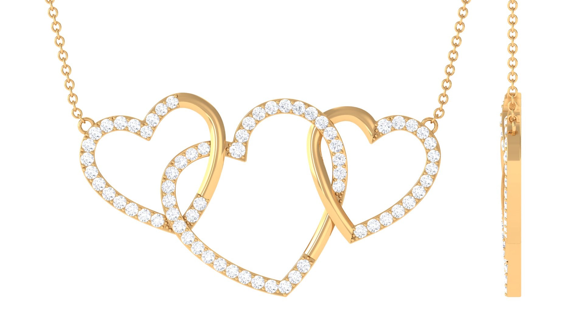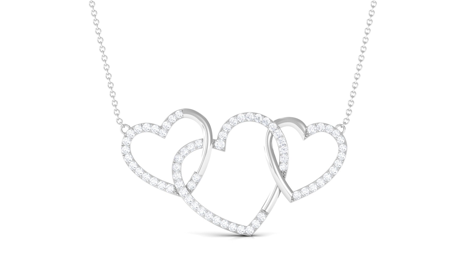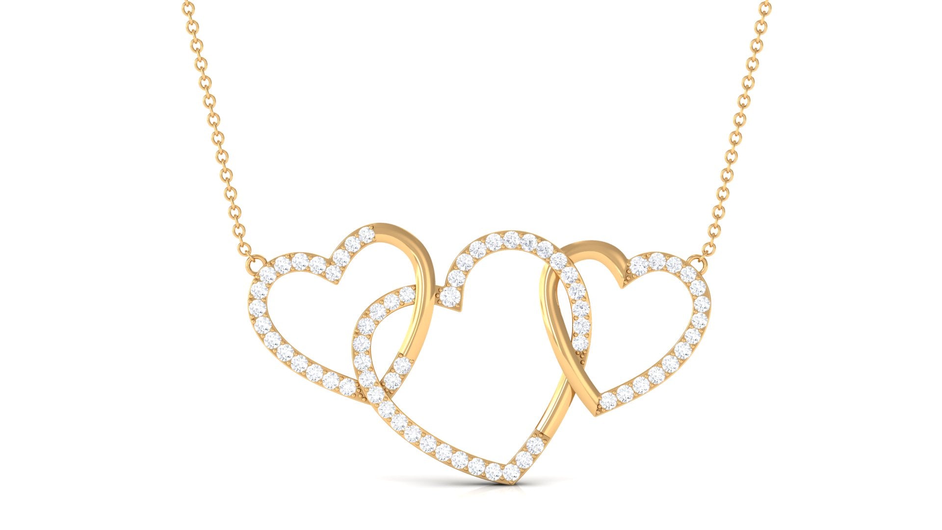 This Diamond Heart Necklace is a beautiful symbol of everlasting love and a strong bond, shining brilliantly. Made with three interlinked open heart designs and adorned with round cut Diamonds in pave setting, this Promise Necklace beautifully represents love. It features HI-SI Quality Stones that emit timeless beauty and exceptional clarity. It is the perfect gift for anniversaries, Valentines Day, birthdays, or any moment to show how much someone means to you. This Three Heart Necklace is a touching way to celebrate a love that endures forever. The craftsmanship of this Heart Shaped Necklace is impressive, making it a true piece of art. A representation of your lasting love and commitment, this necklace is destined to be cherished for years to come. It includes a certificate of authenticity, ensuring its quality and worth, and is packaged in a high-quality jewelry box, making this Interlocking Necklace a fantastic addition to your everyday style with its unmatched sparkle and romantic flair.