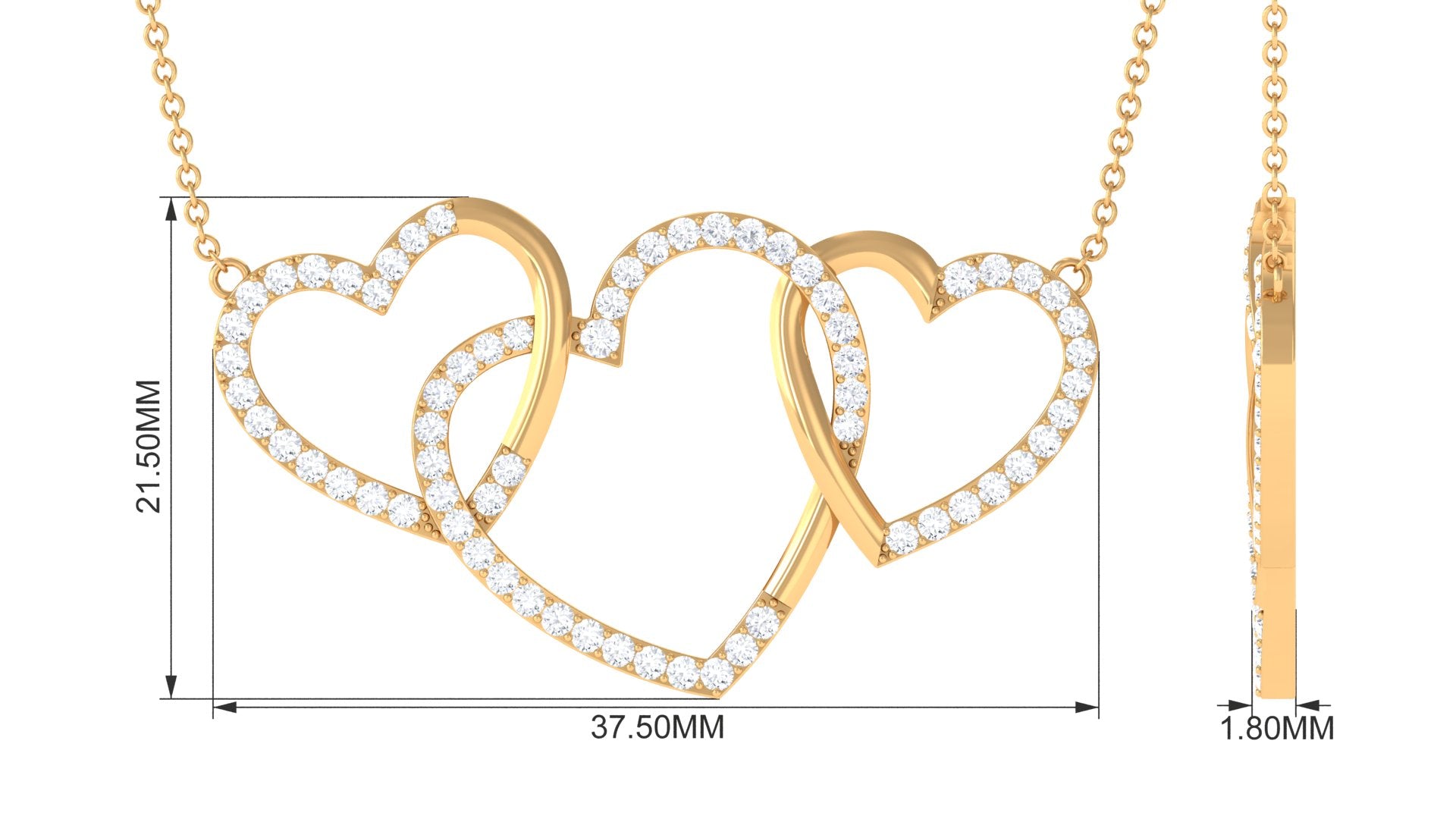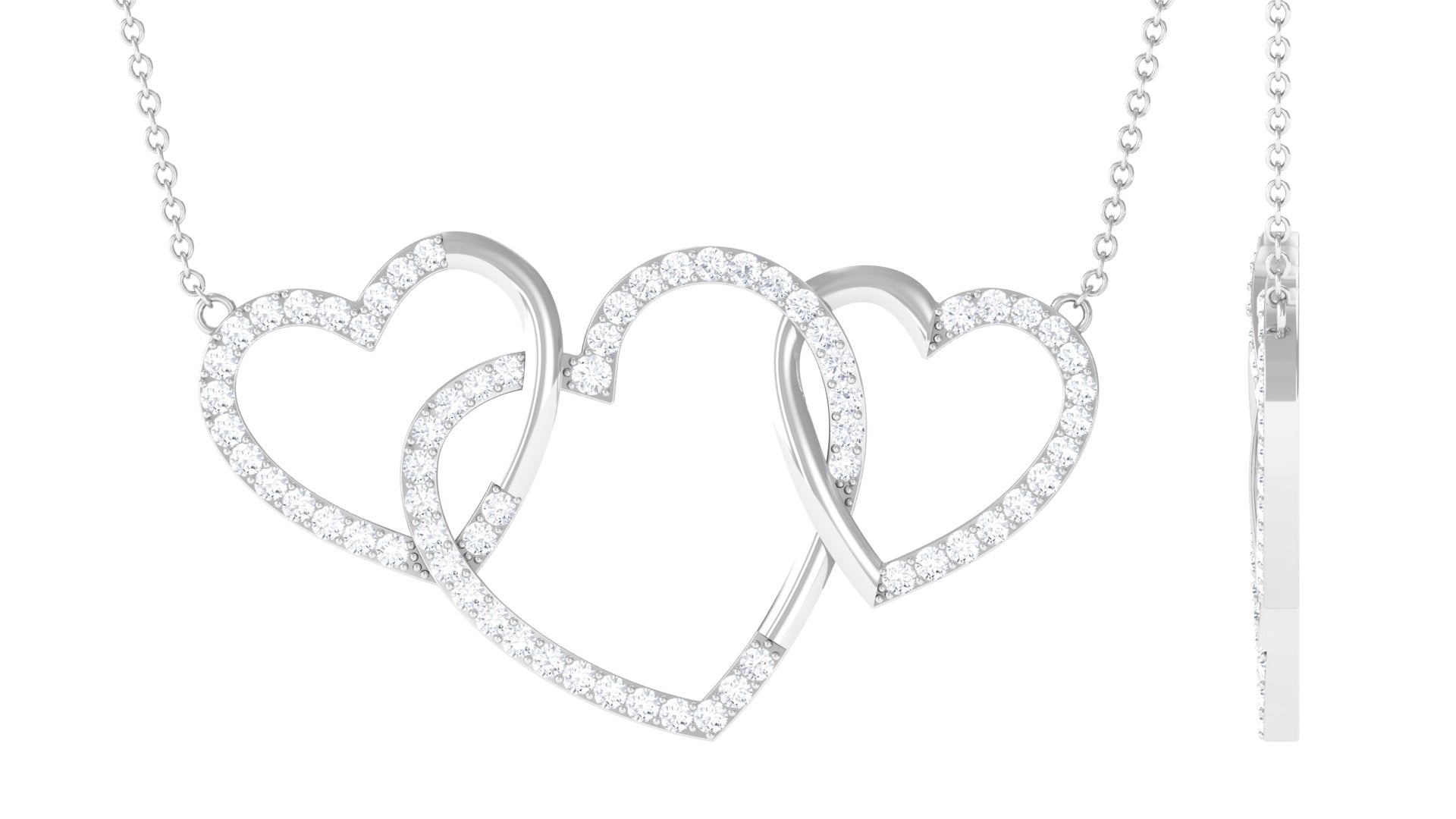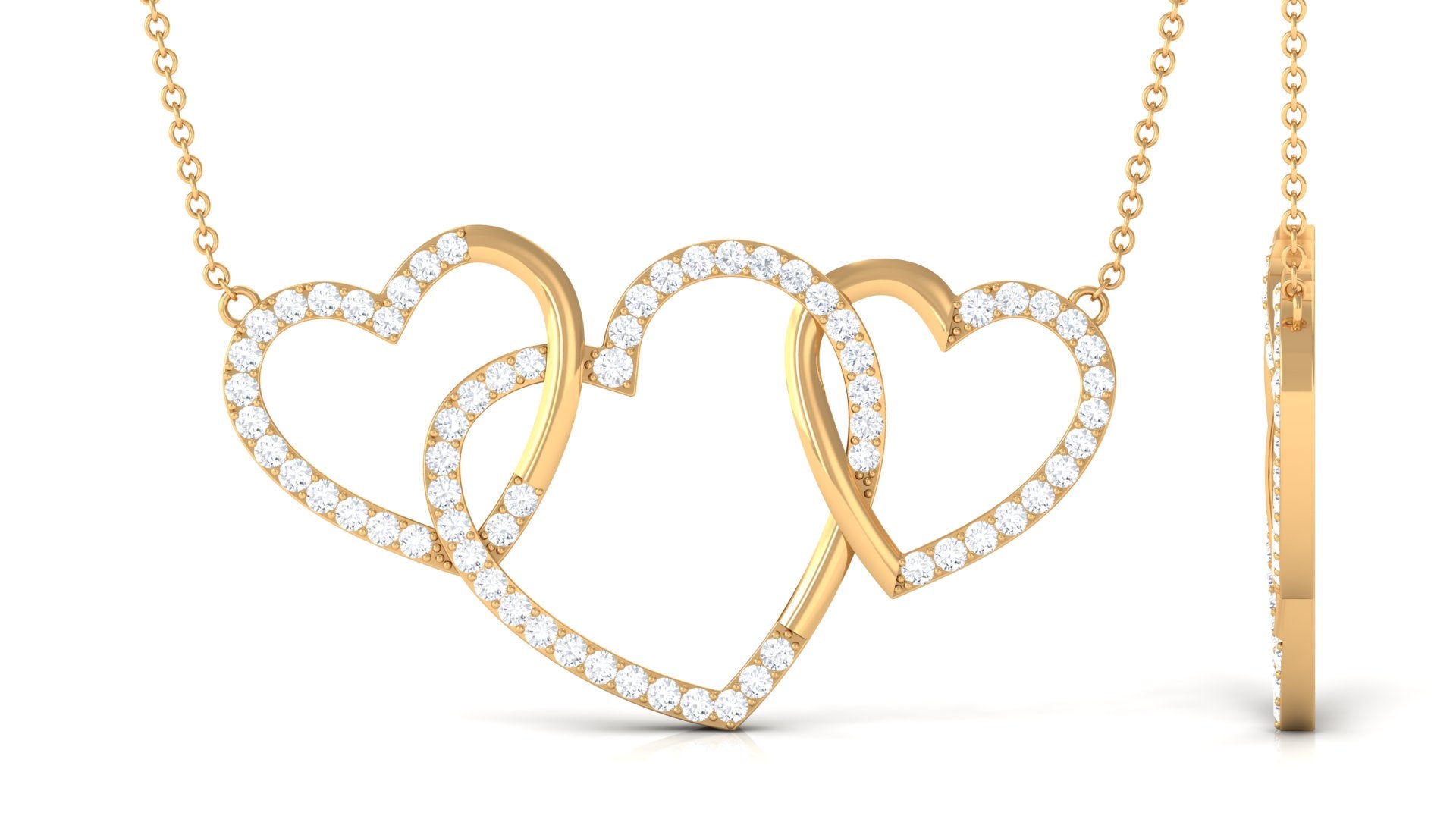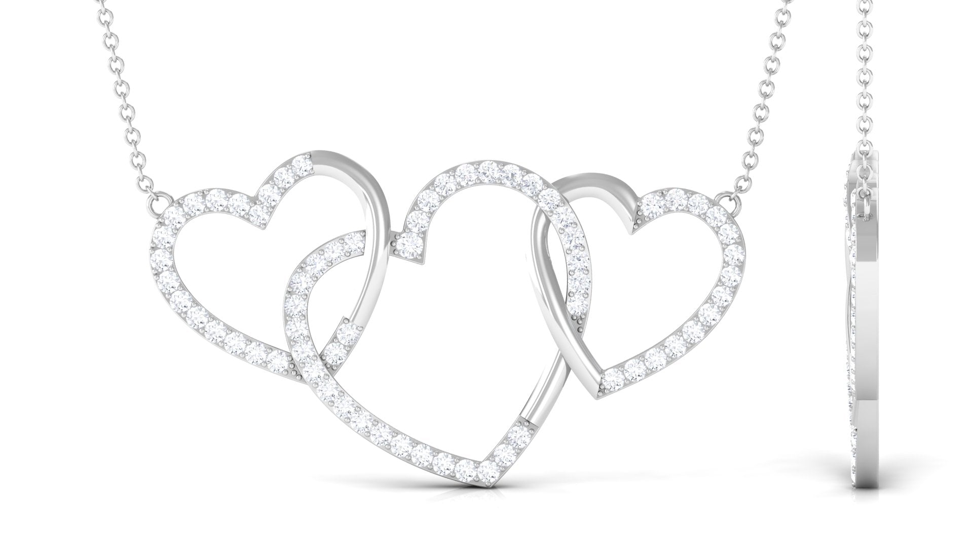 This Diamond Heart Necklace is a beautiful symbol of everlasting love and a strong bond, shining brilliantly. Made with three interlinked open heart designs and adorned with round cut Diamonds in pave setting, this Promise Necklace beautifully represents love. It features HI-SI Quality Stones that emit timeless beauty and exceptional clarity. It is the perfect gift for anniversaries, Valentines Day, birthdays, or any moment to show how much someone means to you. This Three Heart Necklace is a touching way to celebrate a love that endures forever. The craftsmanship of this Heart Shaped Necklace is impressive, making it a true piece of art. A representation of your lasting love and commitment, this necklace is destined to be cherished for years to come. It includes a certificate of authenticity, ensuring its quality and worth, and is packaged in a high-quality jewelry box, making this Interlocking Necklace a fantastic addition to your everyday style with its unmatched sparkle and romantic flair.