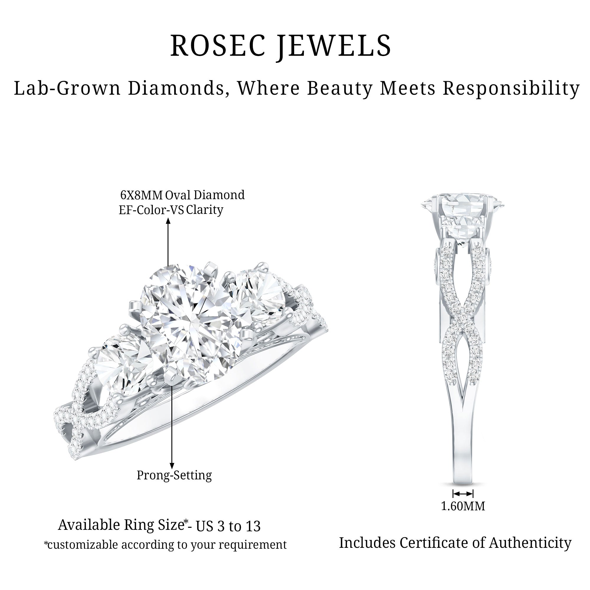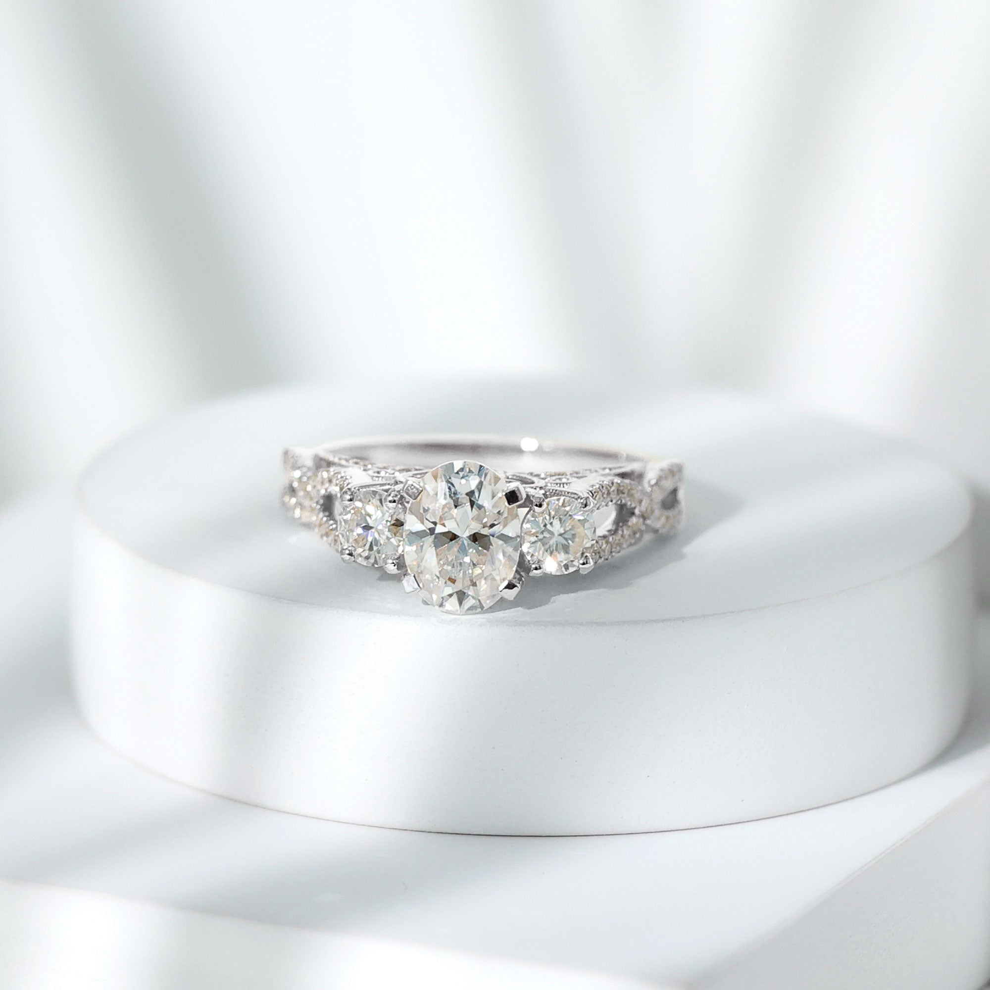 Designed for those who appreciate vintage charm with a touch of modern elegance, this gorgeous Lab Created Diamond Engagement Ring represents the perfect emblem of a love story. At its heart sparkles a captivating 6X8 MM oval lab grown diamond, accompanied by two round brilliant cut side stones that provide balance, shine, and irresistible charm. Each diamond is lab grown, ensuring this beauty is not only stunning but also ethically made for modern couples. The band of this Oval Diamond Engagement Ring is a work of art in itself - a criss cross shank elegantly wraps around the finger, embellished with tiny diamonds that twinkle with every move. The sophistication extends to the gallery, where the craftsmanship is truly breathtaking. Underneath the center stone lies a detailed vintage-inspired design, featuring a bezel set diamond and designer patterns, all adorned with accent stones. A classic piece designed to impress from every perspective, this Three Stone Engagement Ring is more than just jewelry, it is a promise, a memory, and a representation of your past, present, and future together.