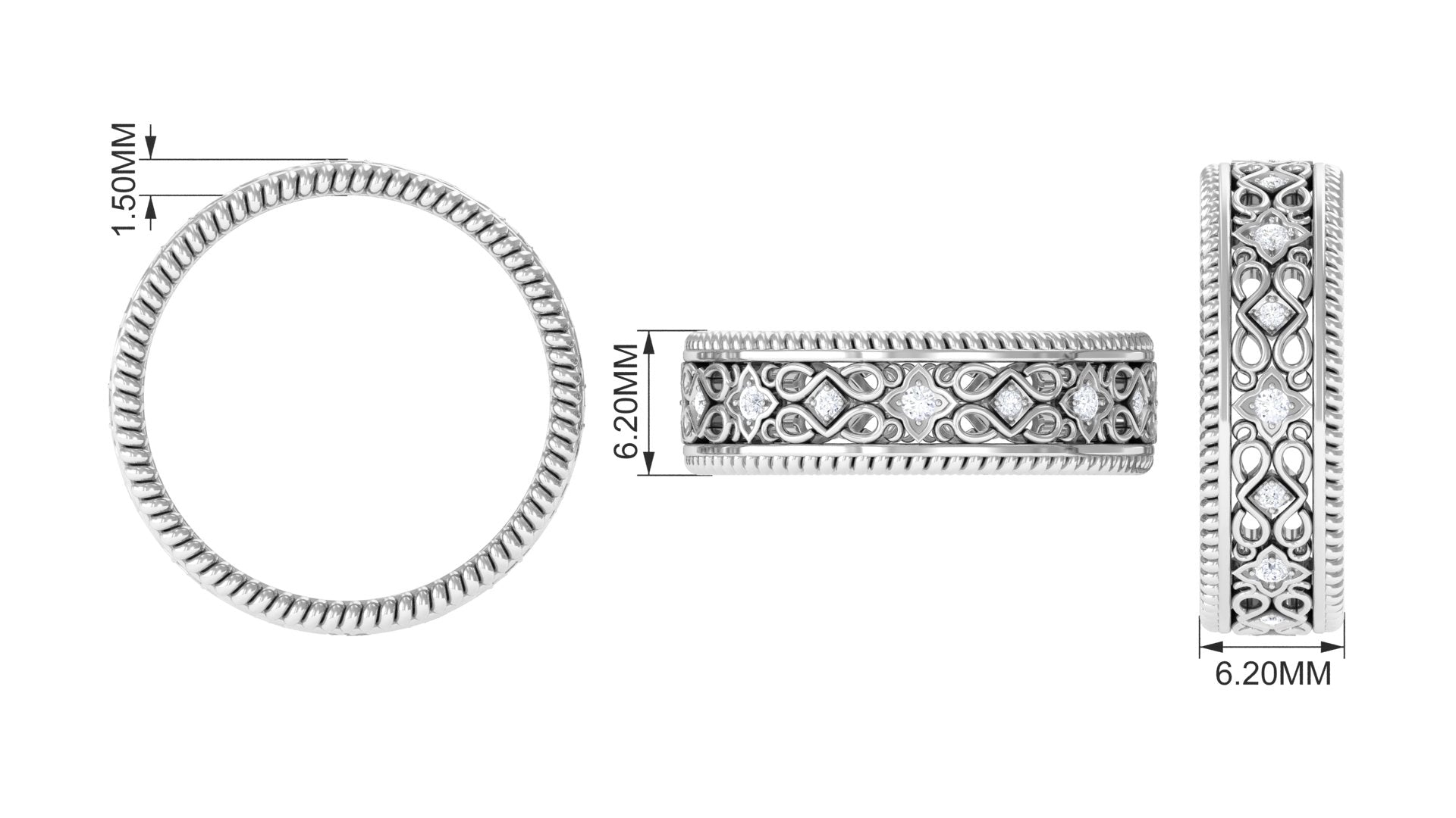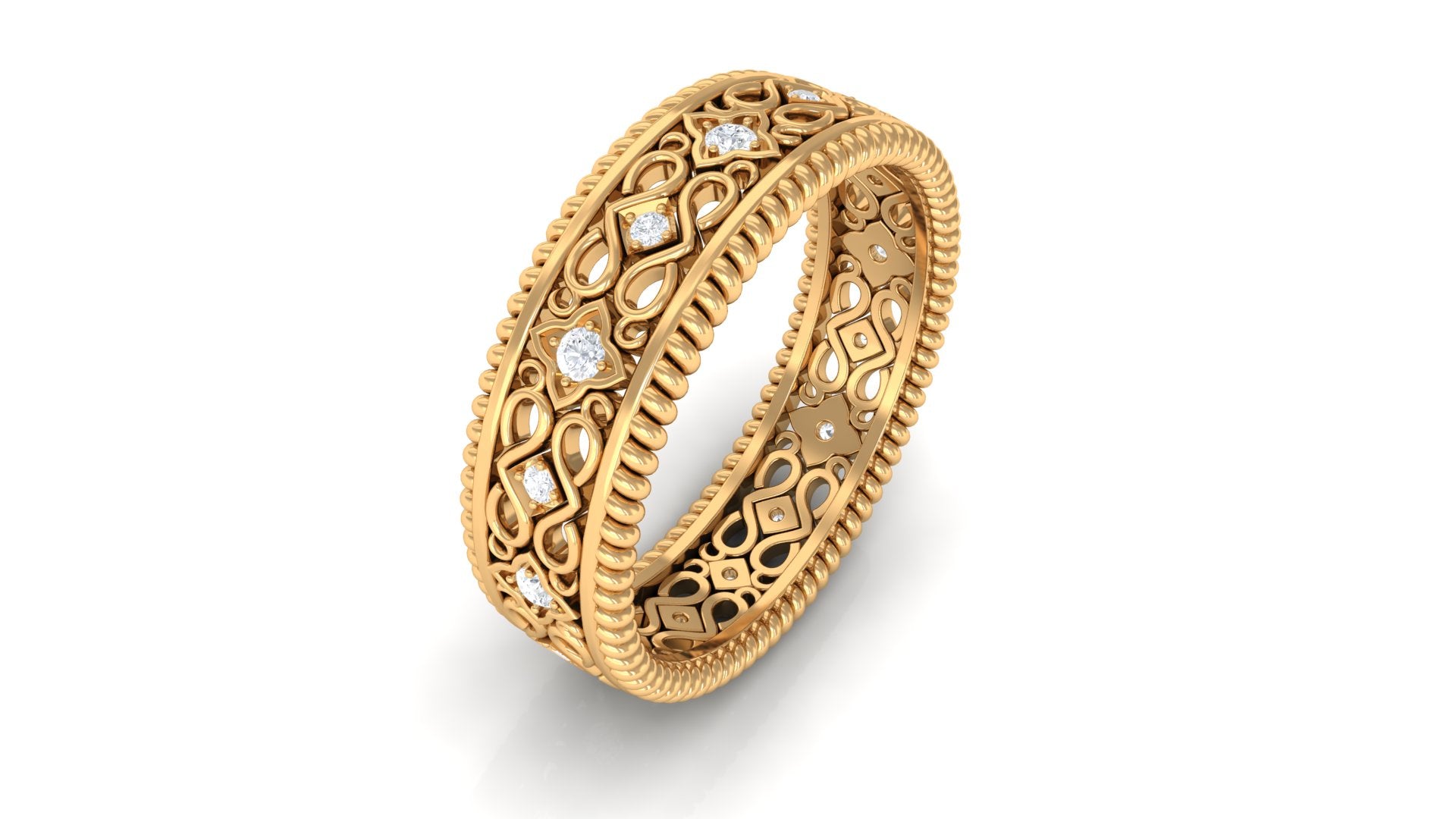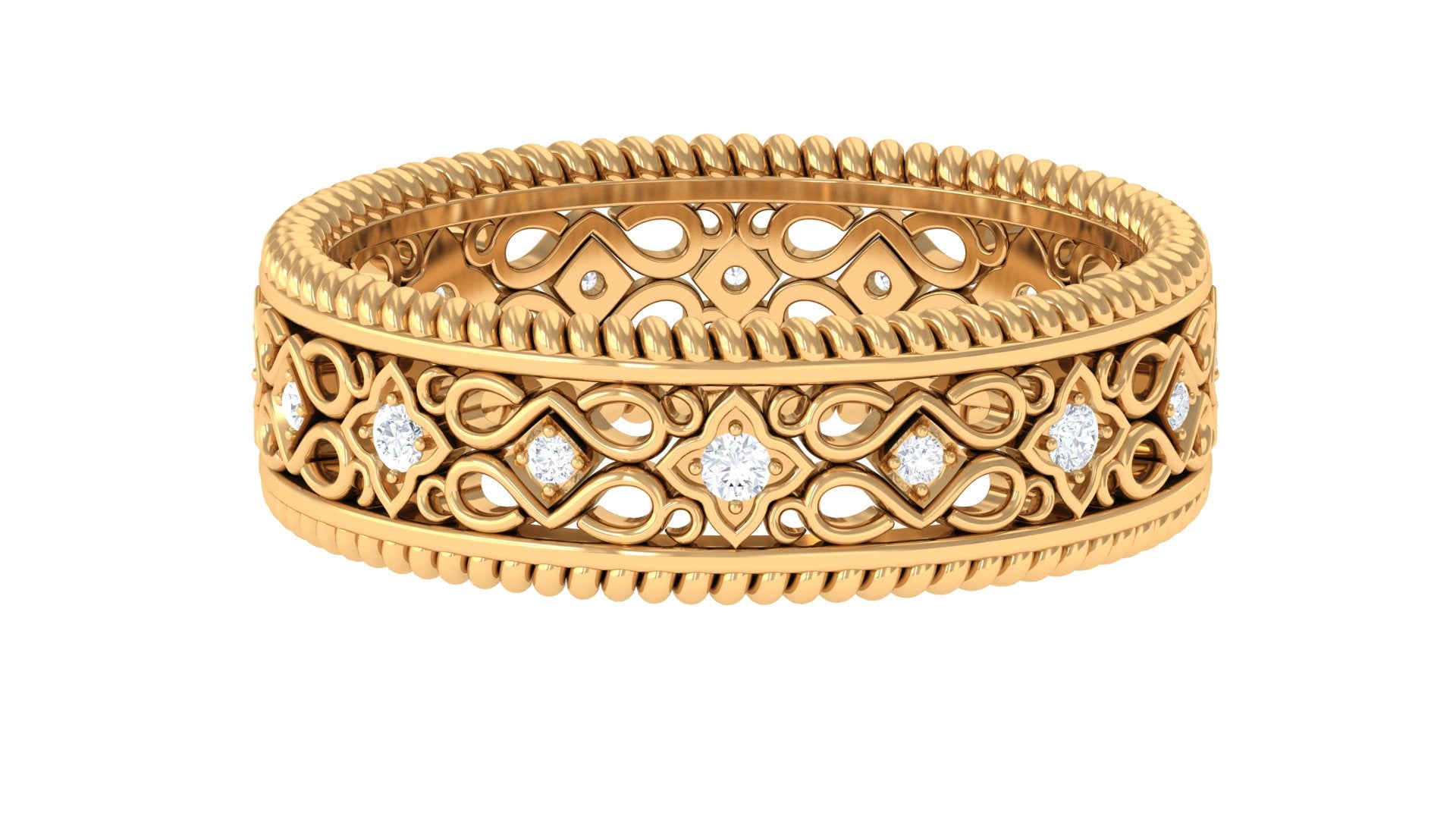Embrace the vintage charm of this Wide Band Ring that captures the beauty of timeless design with subtlety and sparklines. The ring showcases a sparkling Round Cut Diamond, skillfully set in Prong Setting, accentuating its timeless allure. The unique filigree details on the band exude elegance and sophistication, making it a captivating addition to the jewelry collection. Carrying a hidden message with intricate design that speaks volumes without saying a word. Appreciating the art of subtlety, this Thick Wedding Band offers a touch of glamour that is simply for those who appreciate understated elegance. The old-school glamour and vintage beauty of this Diamond Thick Band Ring have unique and delicate details with a style of intricate metalwork, adding a beautiful element to your wedding ring. Evoking an old-world glamor, this Thick Eternity Ring incorporates the modern design as well as borrows heavily from antique styles. This Diamond Wedding Ring is meticulously crafted with attention to detail, making it a perfect choice for those who value the beauty of craftsmanship.