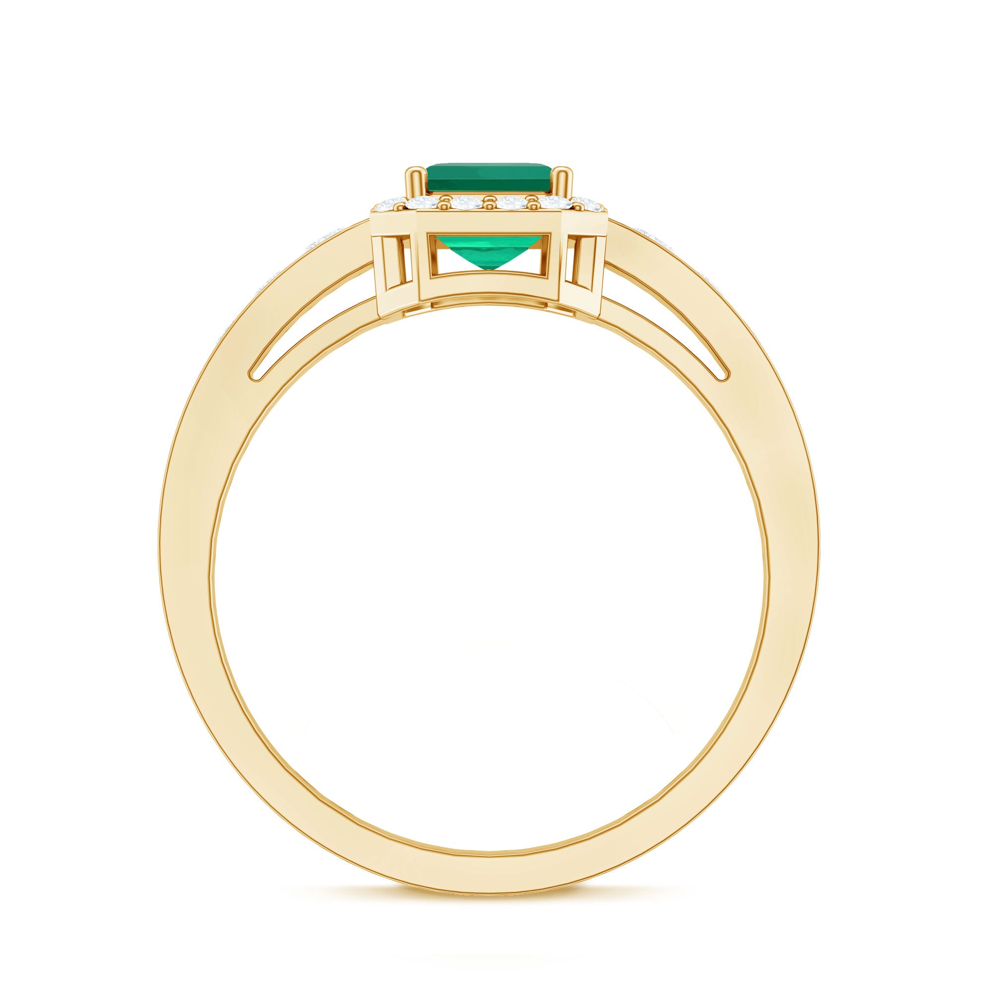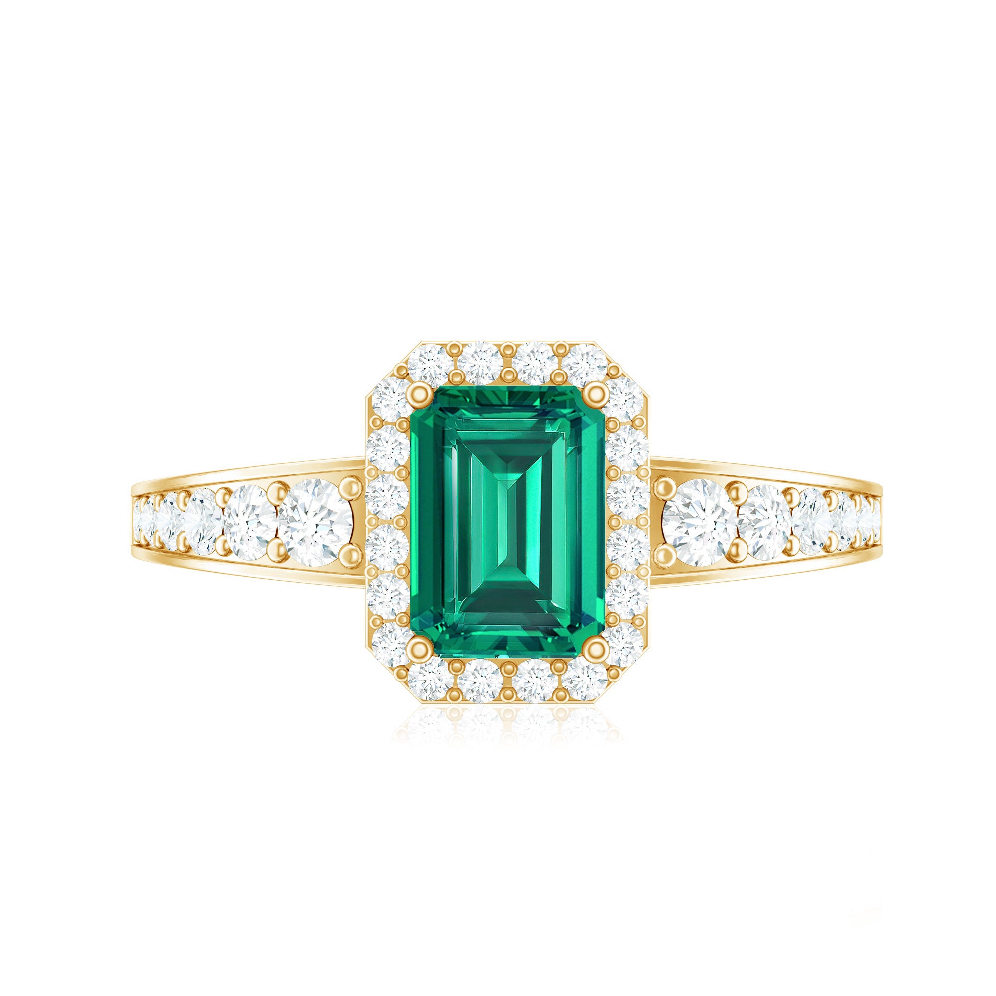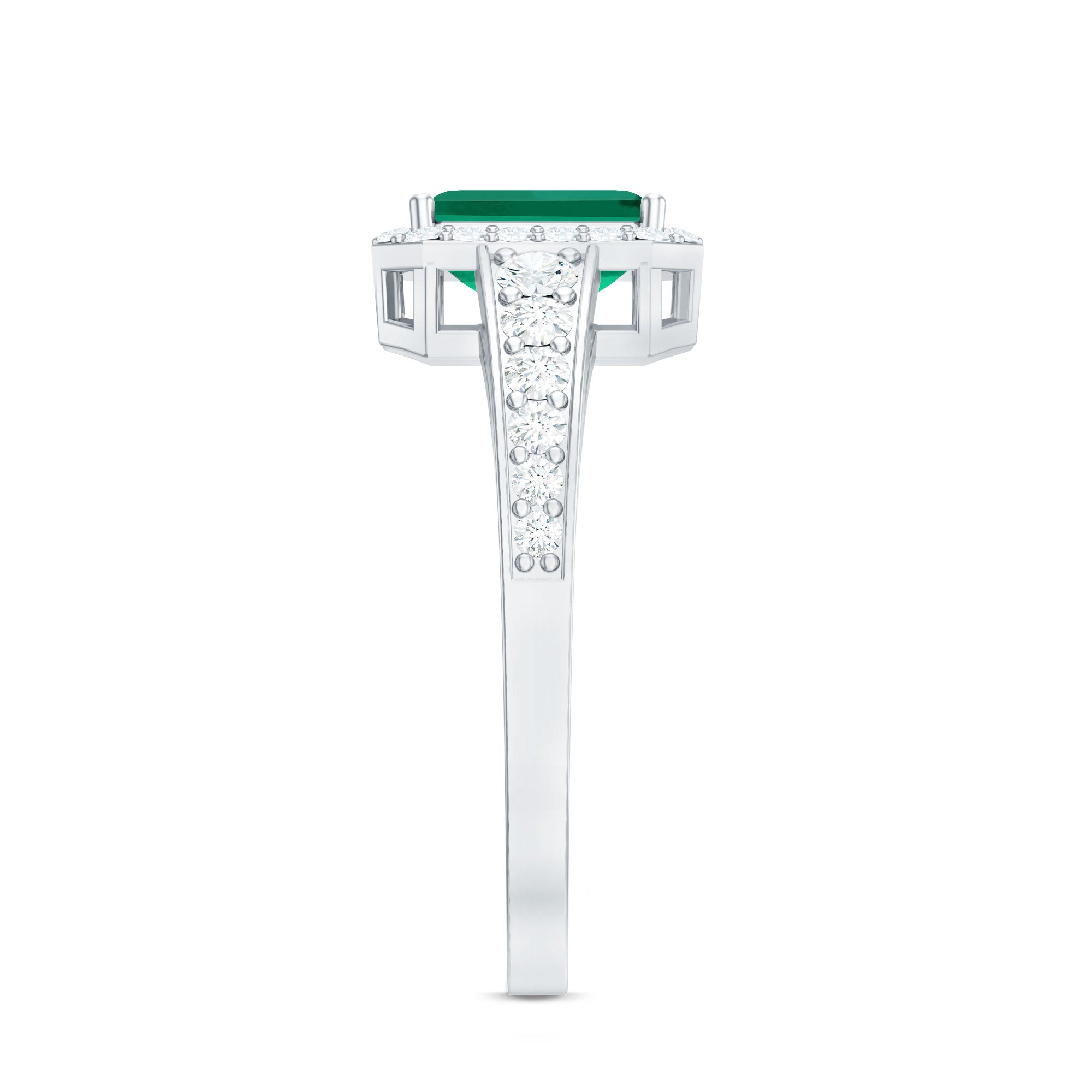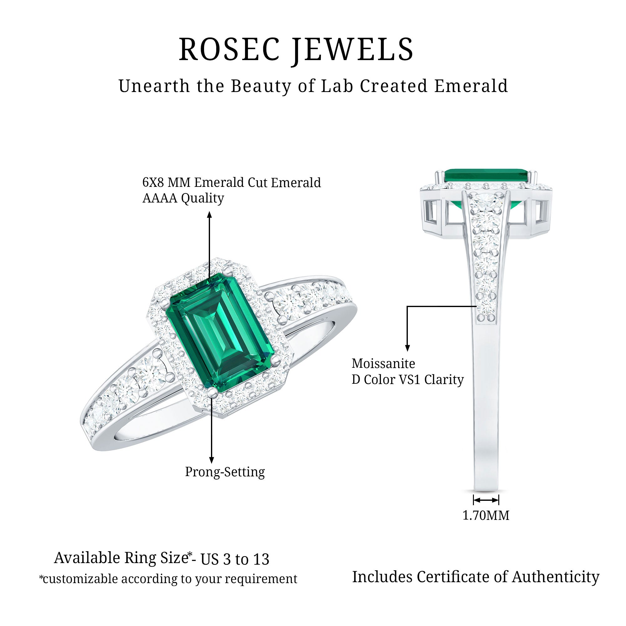 This impressive and sparkling Lab Grown Emerald Ring is sure to take her breath away. As a beautiful symbol of love and commitment, this Emerald Cut Engagement Ring is sure to make your moment special with timeless elegance. Embellished with 5X7 mm Emerald Cut Lab Emerald in Prong Setting with D-Vs1 Moissanite as Halo, while adorning the shank are the side stones Moissanite that has incredible flash within the stone. Captivating and eye-catching this Vintage Inspired Engagement Ring is the perfect blend of modern and timeless. Striking and making a statement, these pieces combine enduring dazzle, timeless style, and scintillating allure.